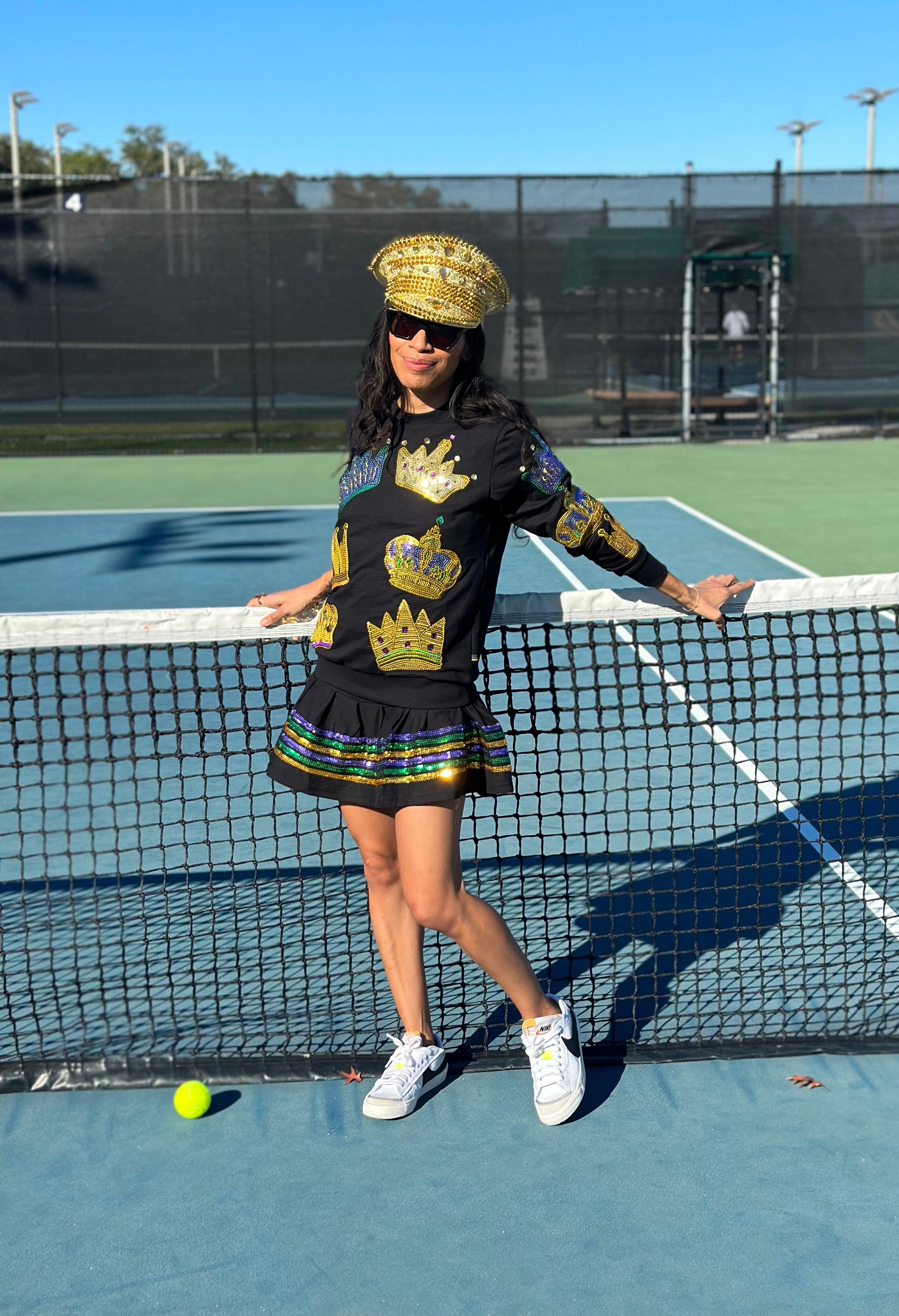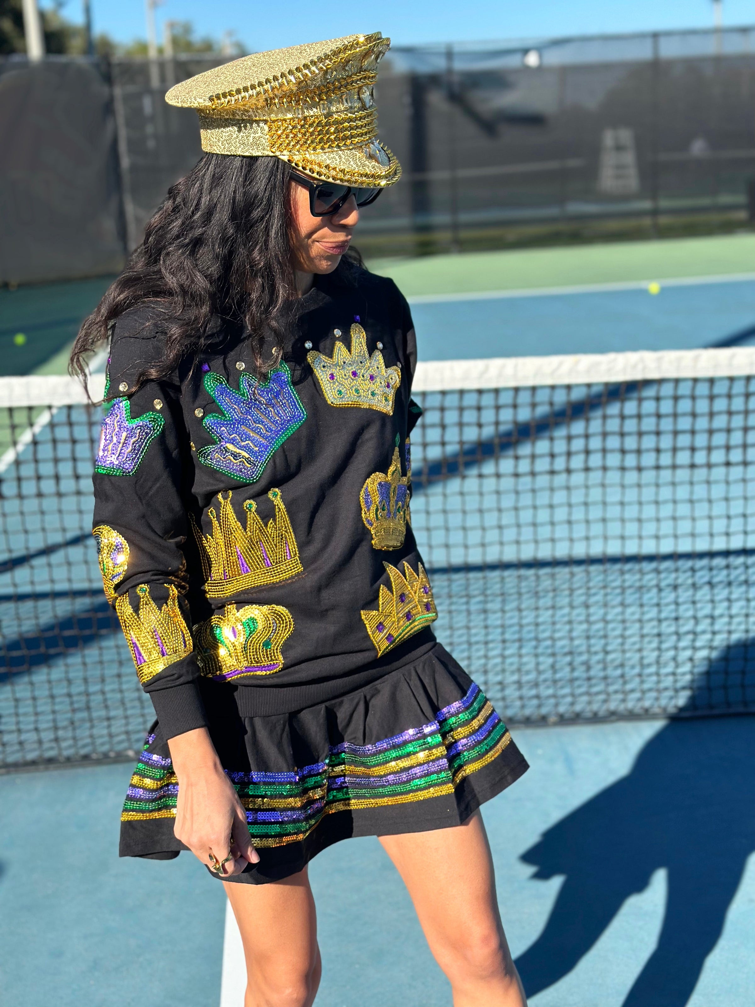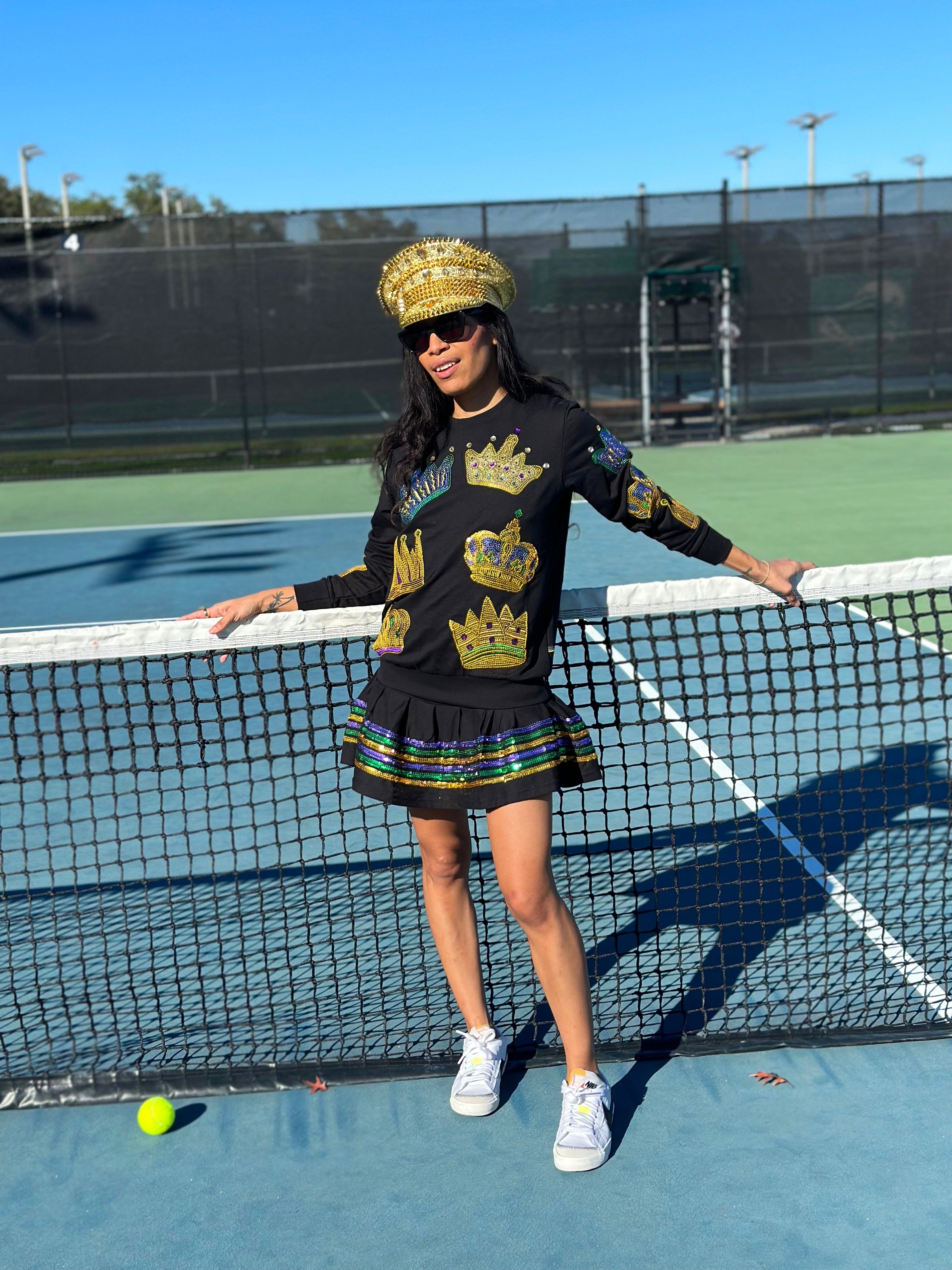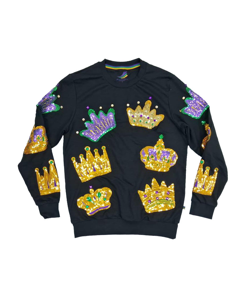 This French Terry Adult Appliqué Crown Pullover makes a bold statement with its sequin applique crowns in vibrant purple, green, and gold colors perfect for Mardi Gras. Keep warm and stylish at the same time.