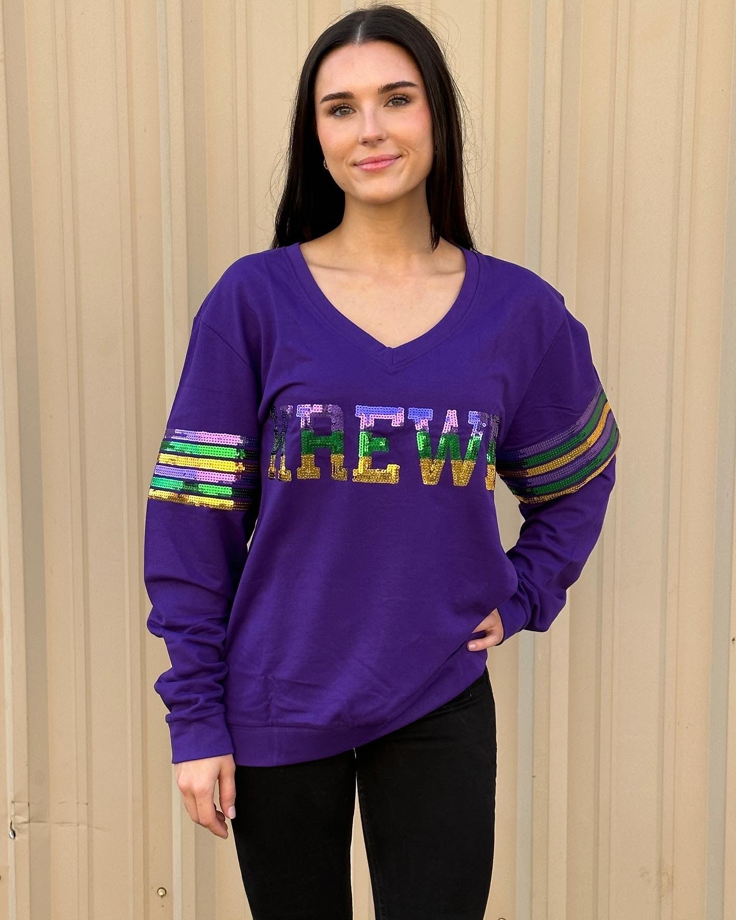 Cannot get enough of our sequin French Terry pullovers!! Celebrate Mardi Gras with this fabulous long sleeved top! This is french terry material with purple green & gold sequins that read "KREWE’ V-Neck with purple, green, gold sequin stripes around the arms it’s sure to be a show stopper at any party or on the route!