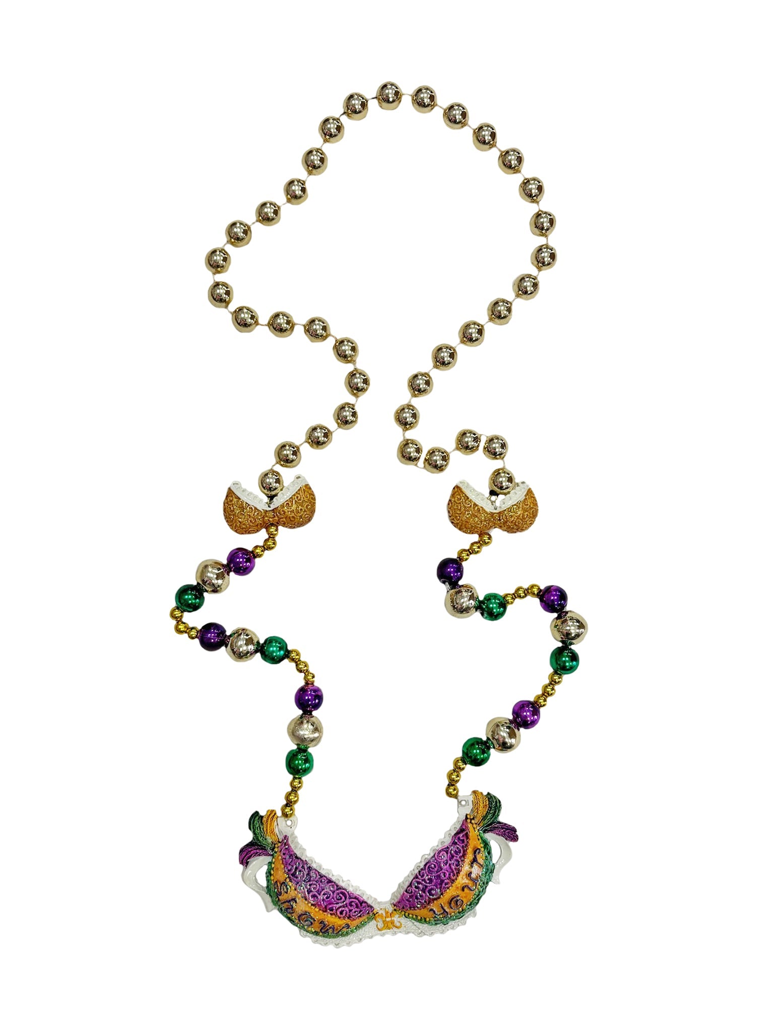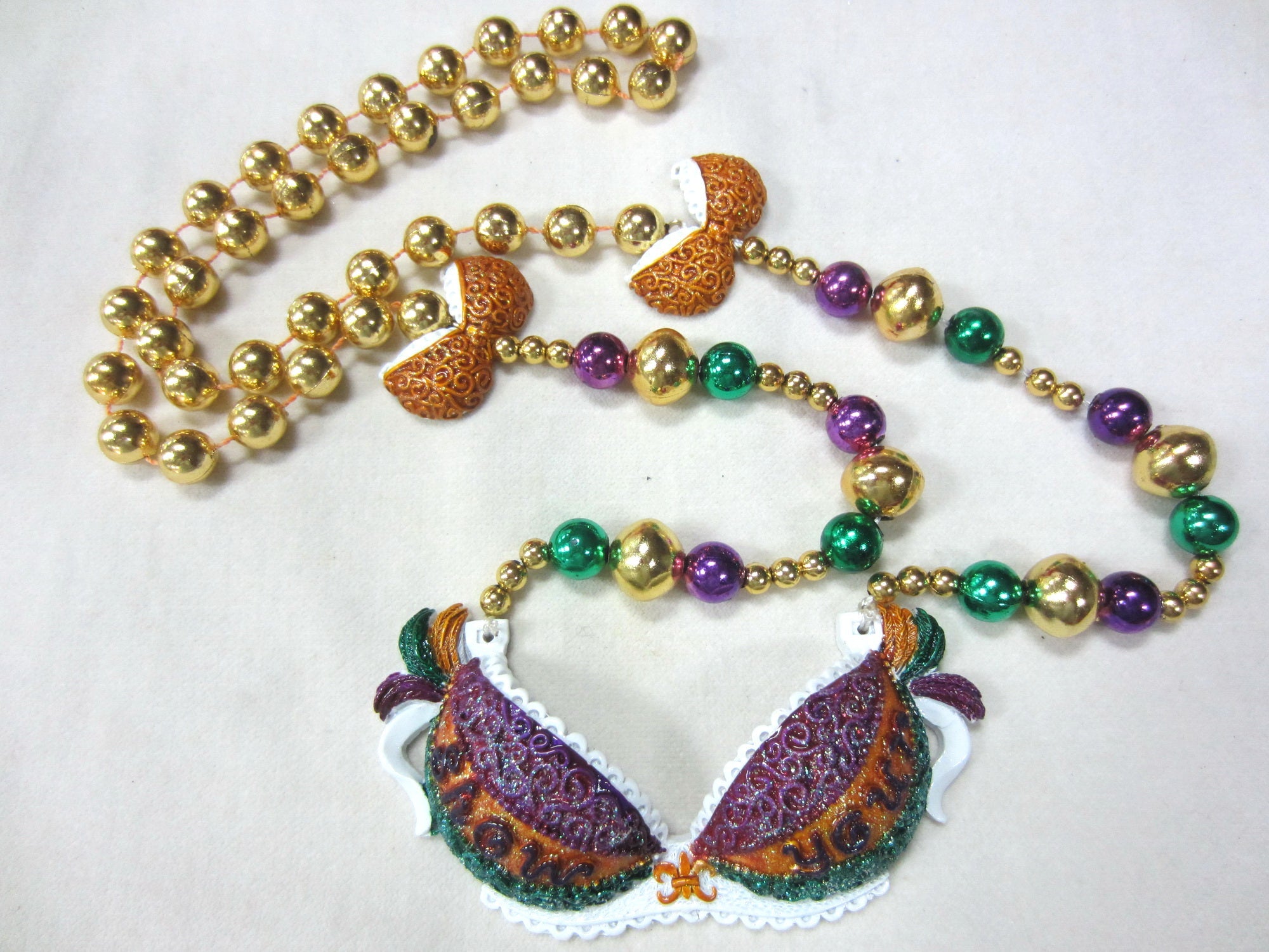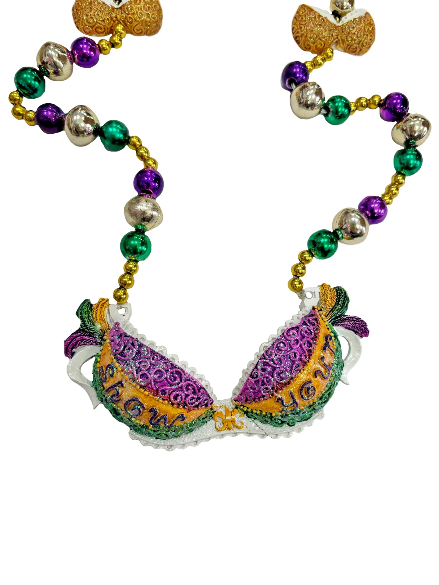 Show your love of frilly bras on the outside of your clothes. This specialty bead features 1 large purple, green and gold glitter bra with 2 smaller gold bras evenly spaced along hand strung 12 mm purple, green and gold beads. Necklace is 42" long.