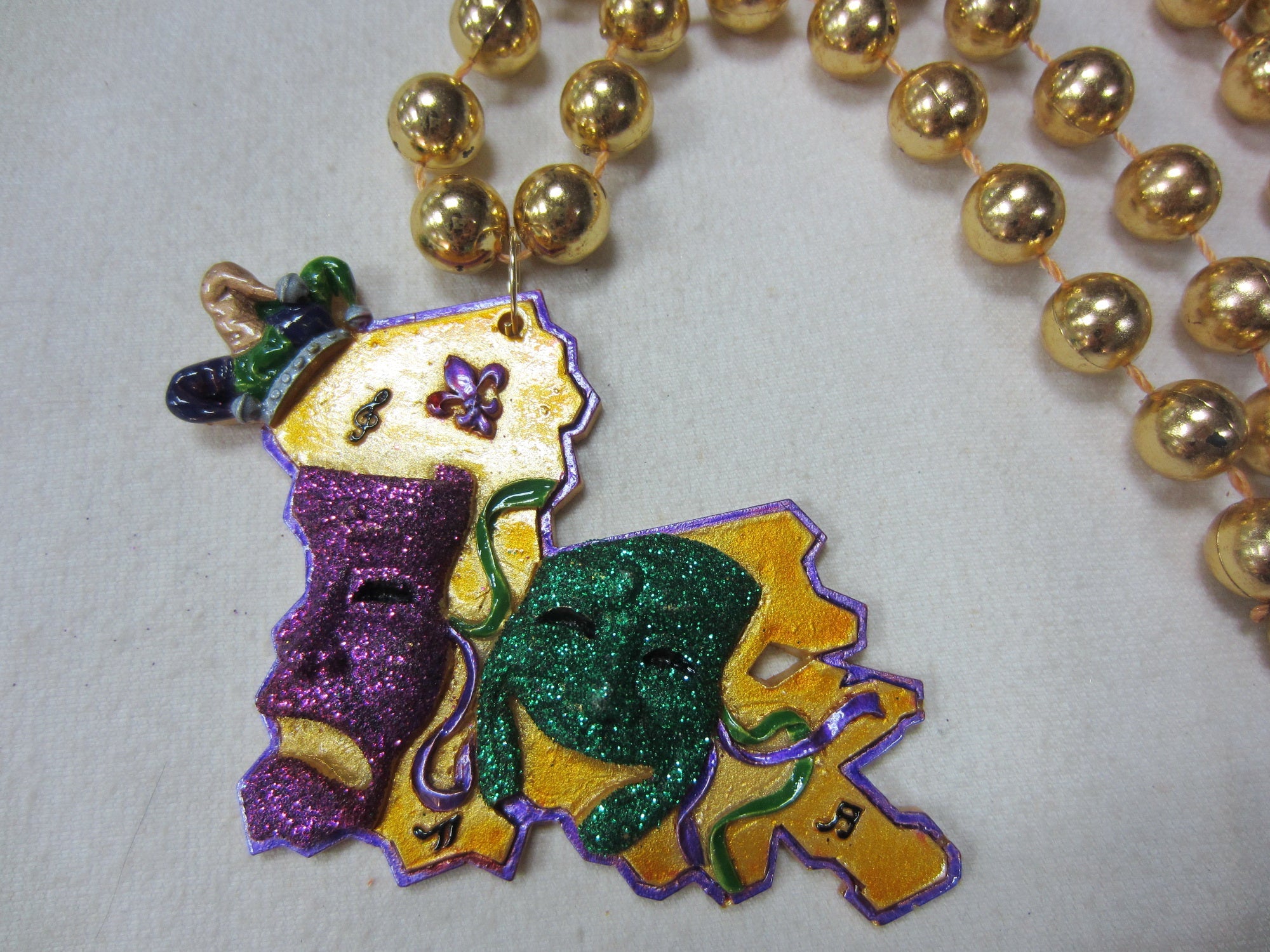 Comedy stands out on this bead as tragedy is cut off the state. This bead features the state of Louisiana in gold with a jester hat and comedy and tragedy in purple and green glitter accents. Medallion is approximately 3" x 3" at the bottom of a 12mm gold beaded 42" long necklace.