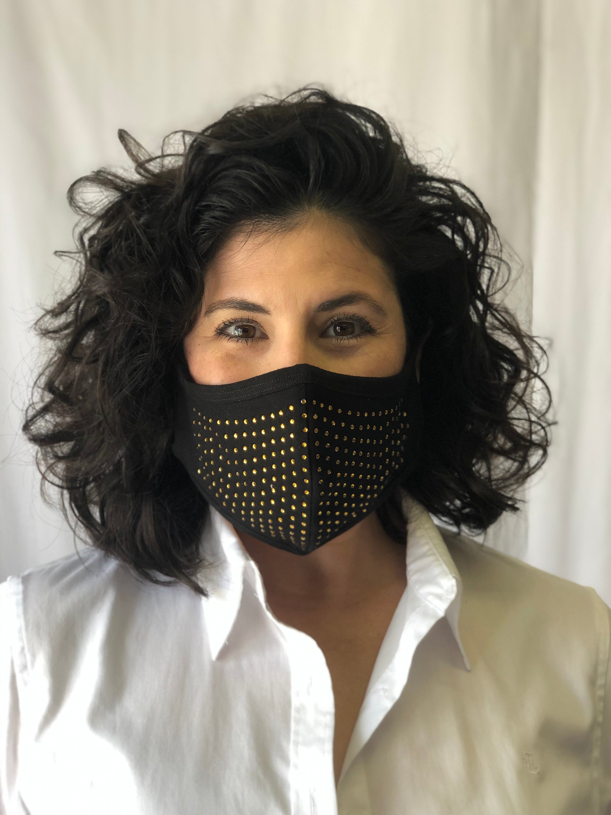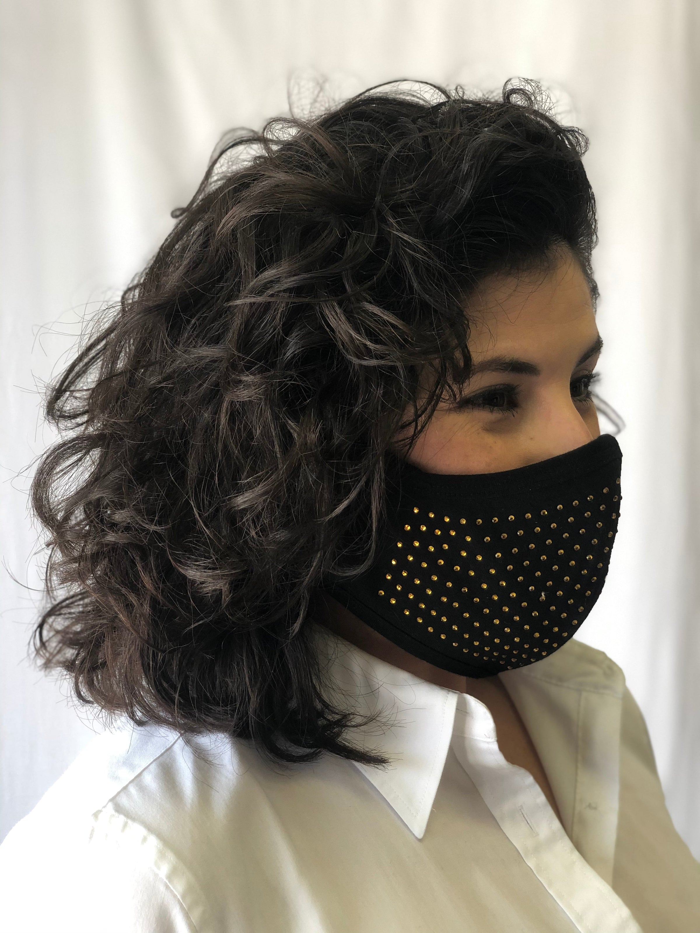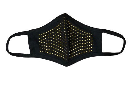 Mask Up in style! This black, reusable face mask features all over gold studs and ear loops. One size fits most.