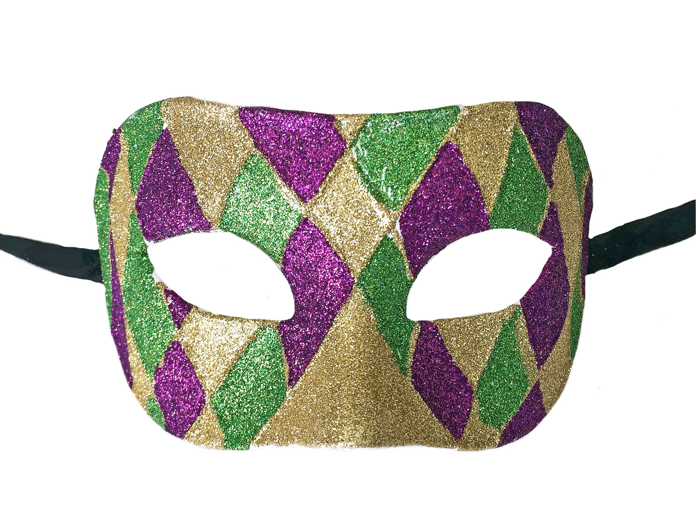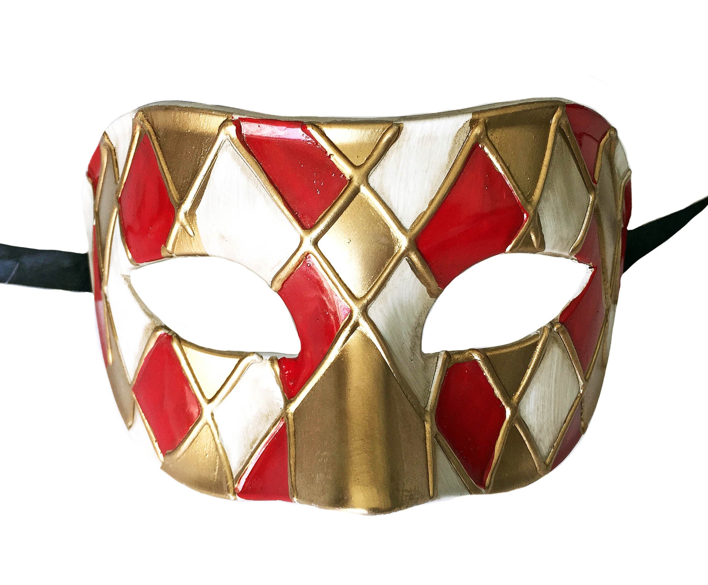 This half mask features rounded edges with textured traditional harlequin diamond patterns across the mask face. Black ribbons are attached for tying.