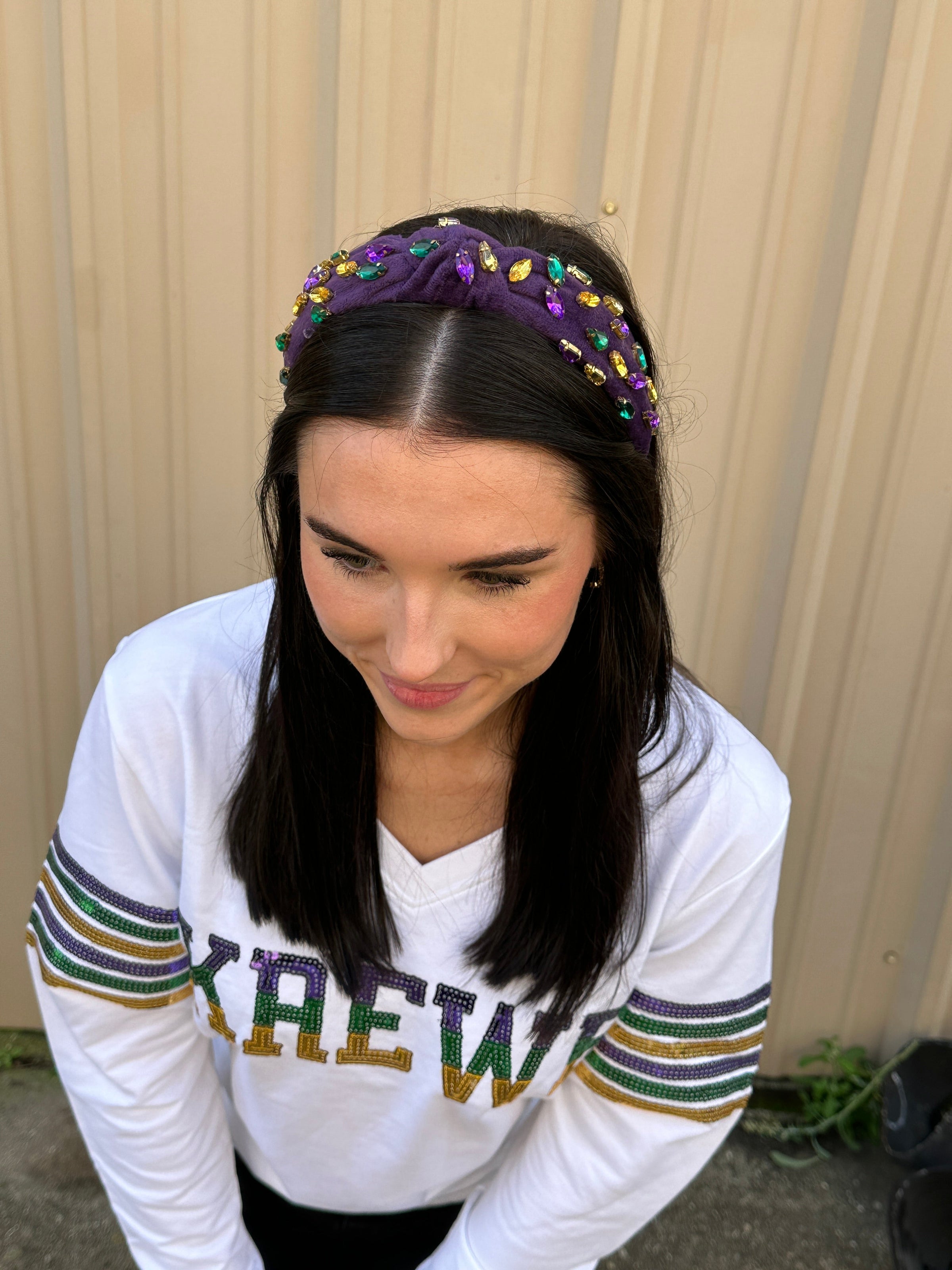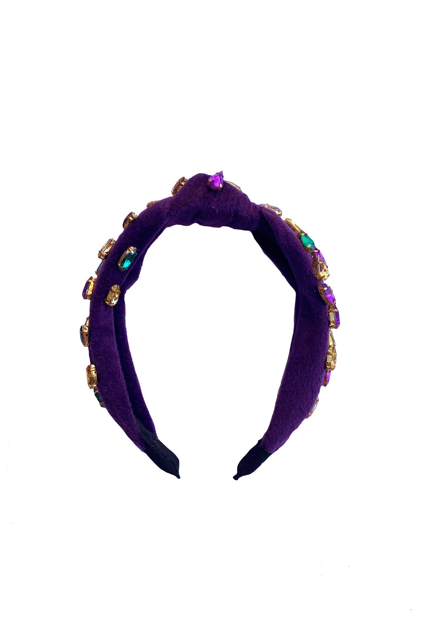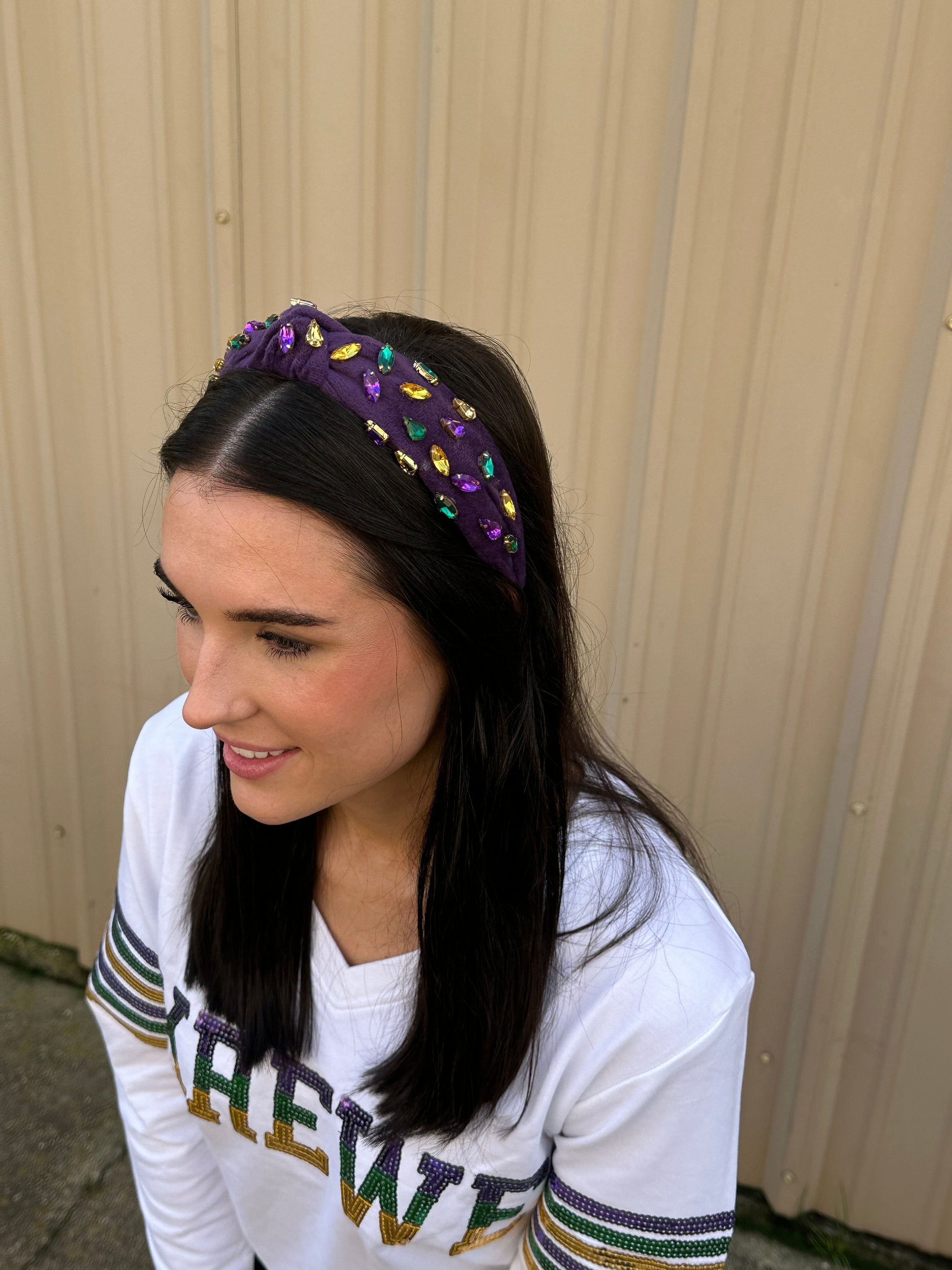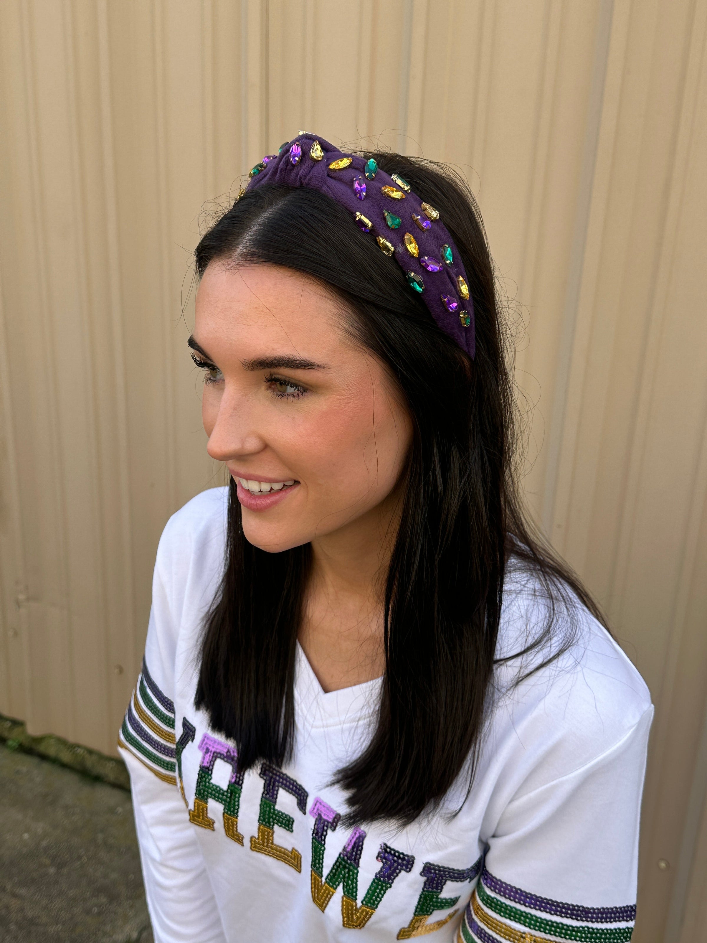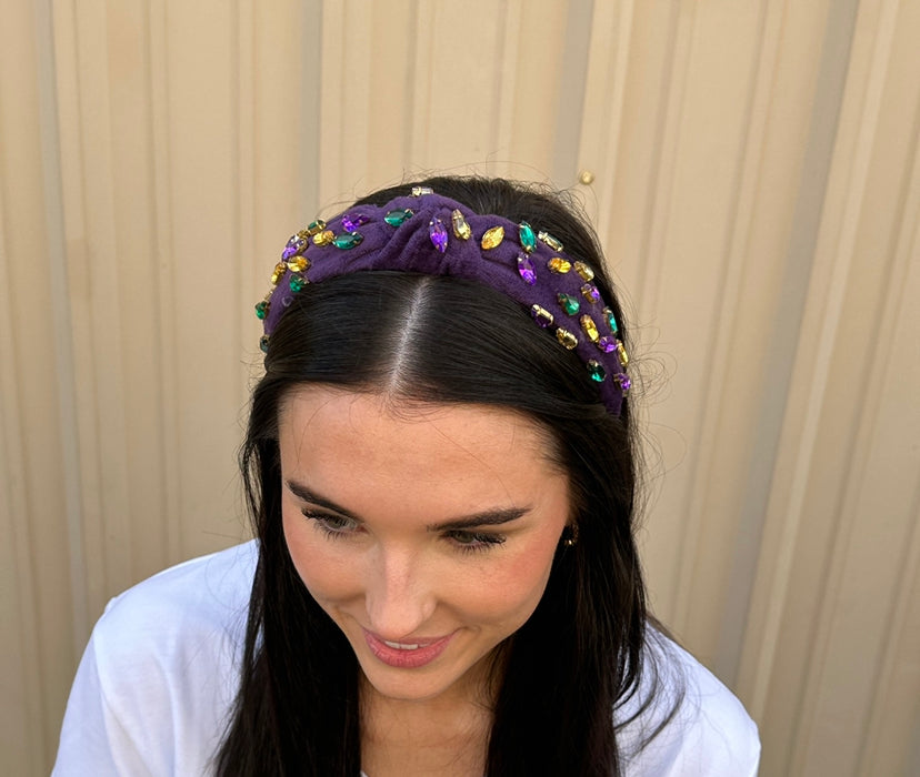 Turn heads this Mardi Gras season! There is no cuter or more fun accessory than this velvet, purple headband with purple, green and gold jeweled stones!