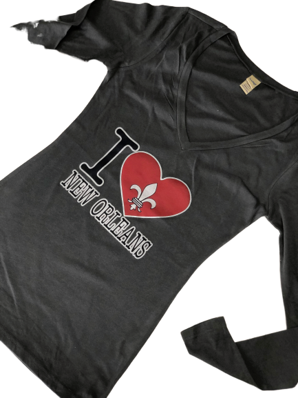Laissez les bon temps rouler! This t-shirt reads "I heart New Orleans" with a fleur de lis inside the heart. Perfect souvenir to remember your visit to New Orleans!
