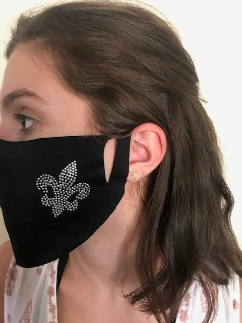 Mask Up in style! This black reusable face mask features a silver jeweled fleur de lis on the left cheek and ear loops. One size fits most.