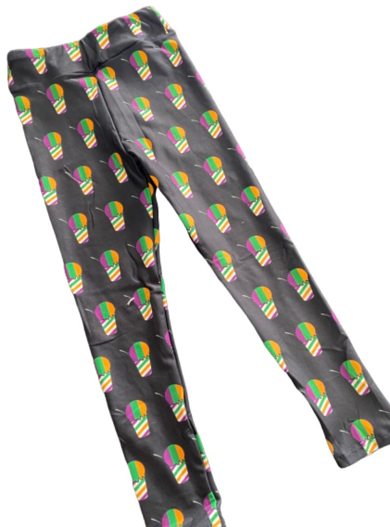 Perfect for your littles and tweens- keep them warm and parading on! We are obsessed with this super cool, fun and colorful purple green and gold iconic Sno ball imprinted spandex leggings! Each one is one of a kind with spandex and our junior sizing also has a yoga band like the adults!
