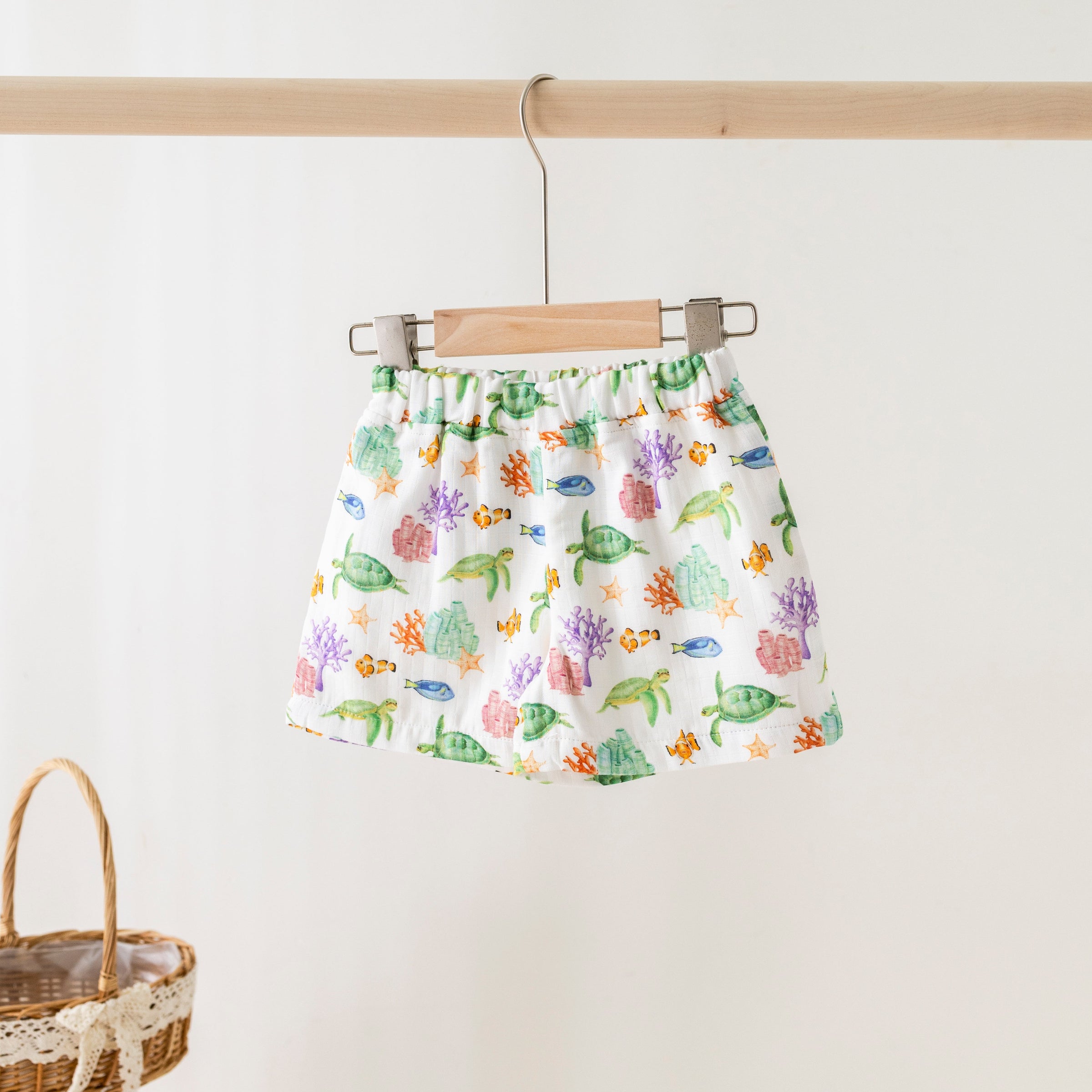 Featuring a colorful underwater print with adorable sea creatures, these lightweight and breathable shorts are perfect for little ocean explorers. Made from GOTS-certified 100% organic muslin, they’re soft, airy, and gentle on delicate skin, ensuring all-day comfort for your little swimmer. The elastic waistband provides a secure yet flexible fit, making them ideal for beach days, playdates, or everyday fun.