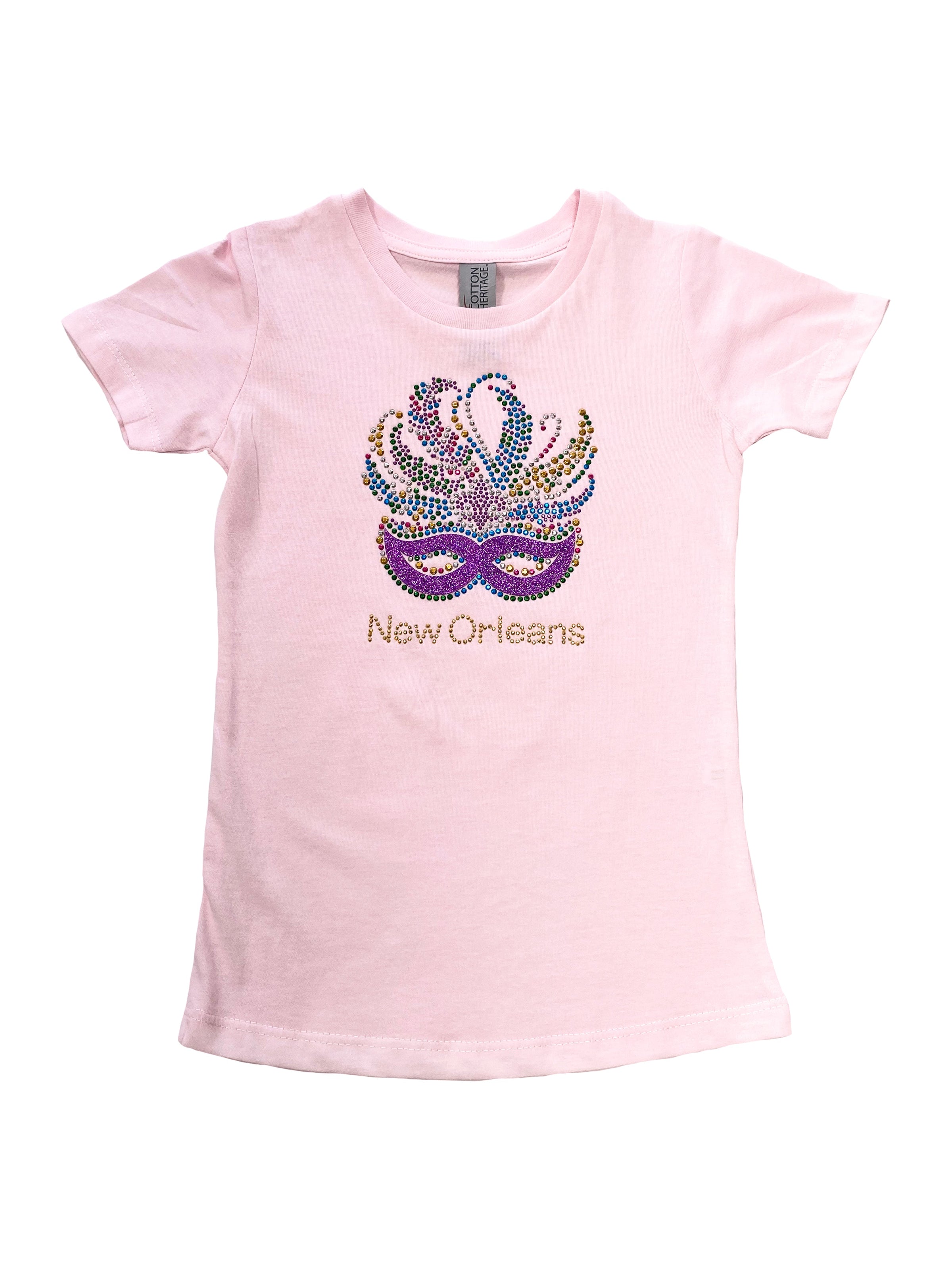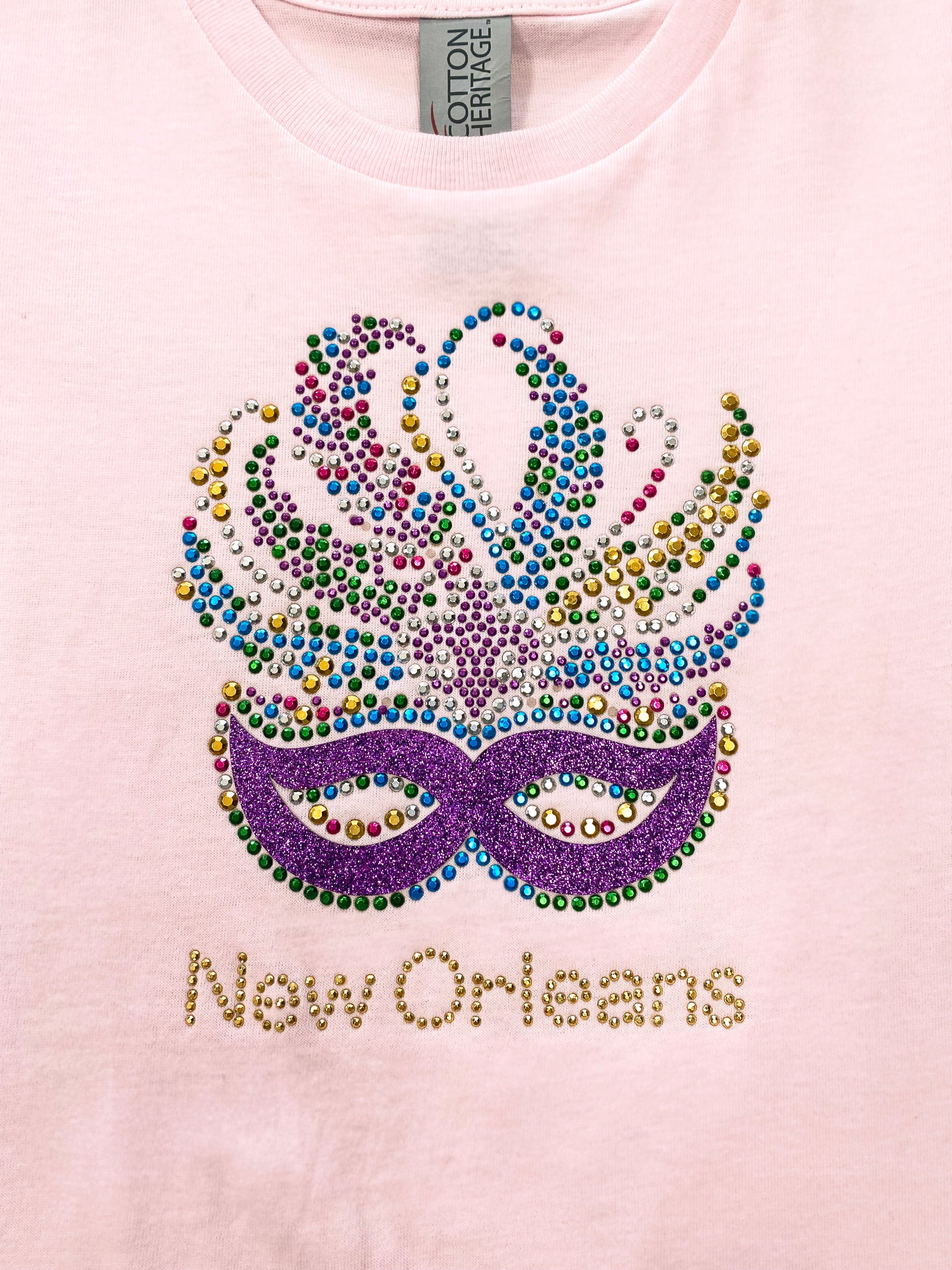 Get ready to party with our Kids Tshirt featuring a Venetian mask center, adorned with feathers and Fleur De Lis in silver glitter. Perfect for Mardi Gras, this shirt adds a touch of sparkle and fun with rhinestones and glitter. Let your little ones shine in style!