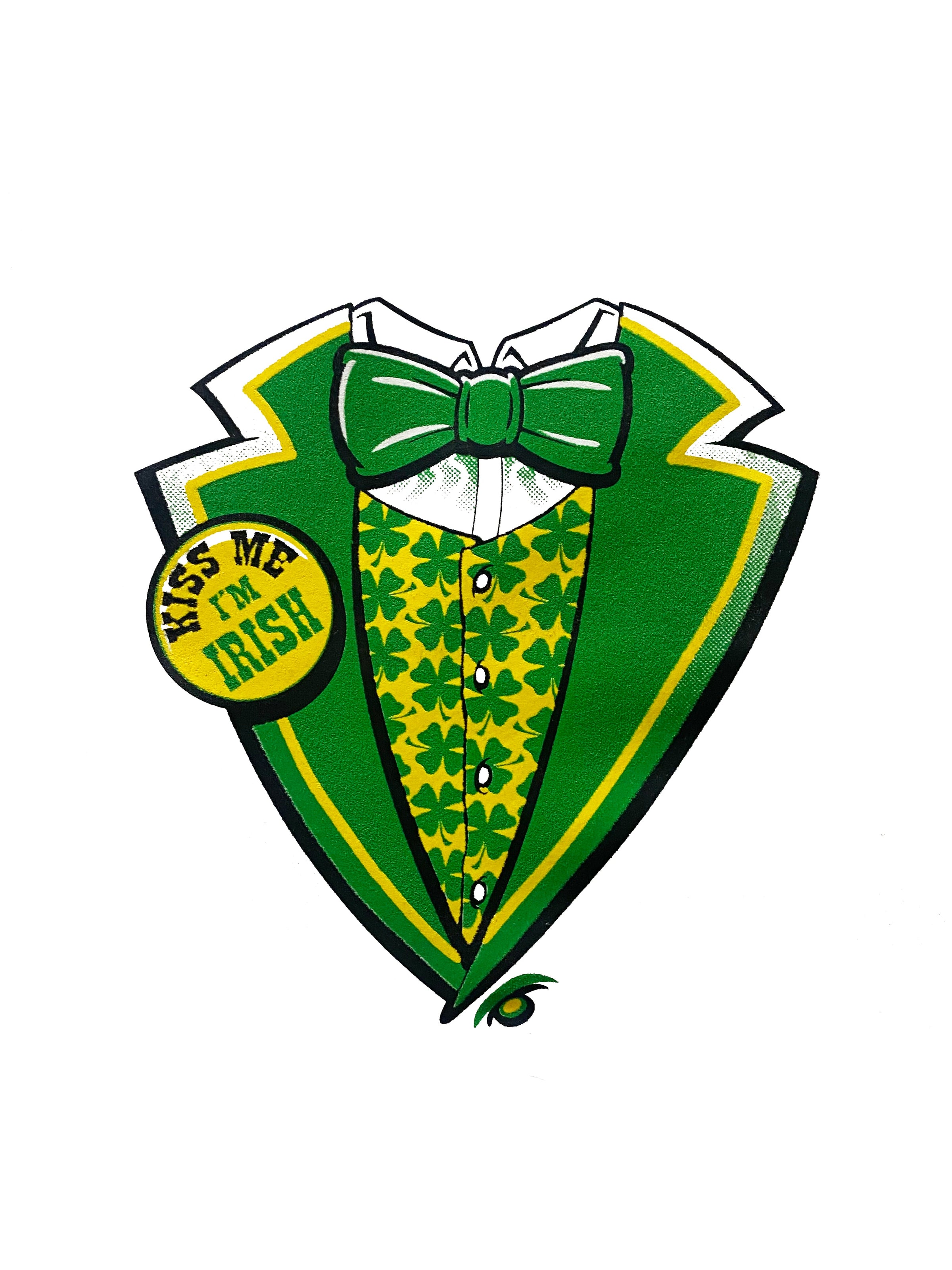 Looking for the perfect St. Patrick's Day outfit? This Kiss Me I'm Irish Tuxedo T-Shirt has got you covered. Featuring playful four leaf clovers, this shirt is sure to bring some luck to your celebration. Show off your Irish pride in style with this quirky and fun tuxedo shirt.