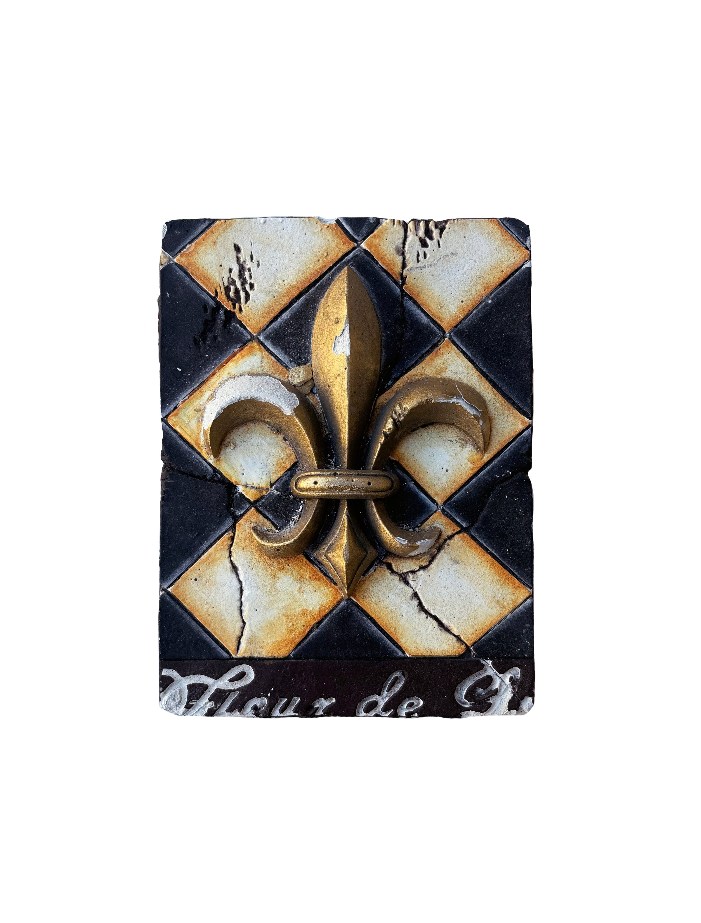 Add a touch of elegance and whimsy to your home decor with this large wall plaque. Featuring a classic fleur de lis design on a unique black and gold checkered background, this piece is sure to stand out. Perfect for any room in your home, this plaque combines traditional style with a touch of playfulness.