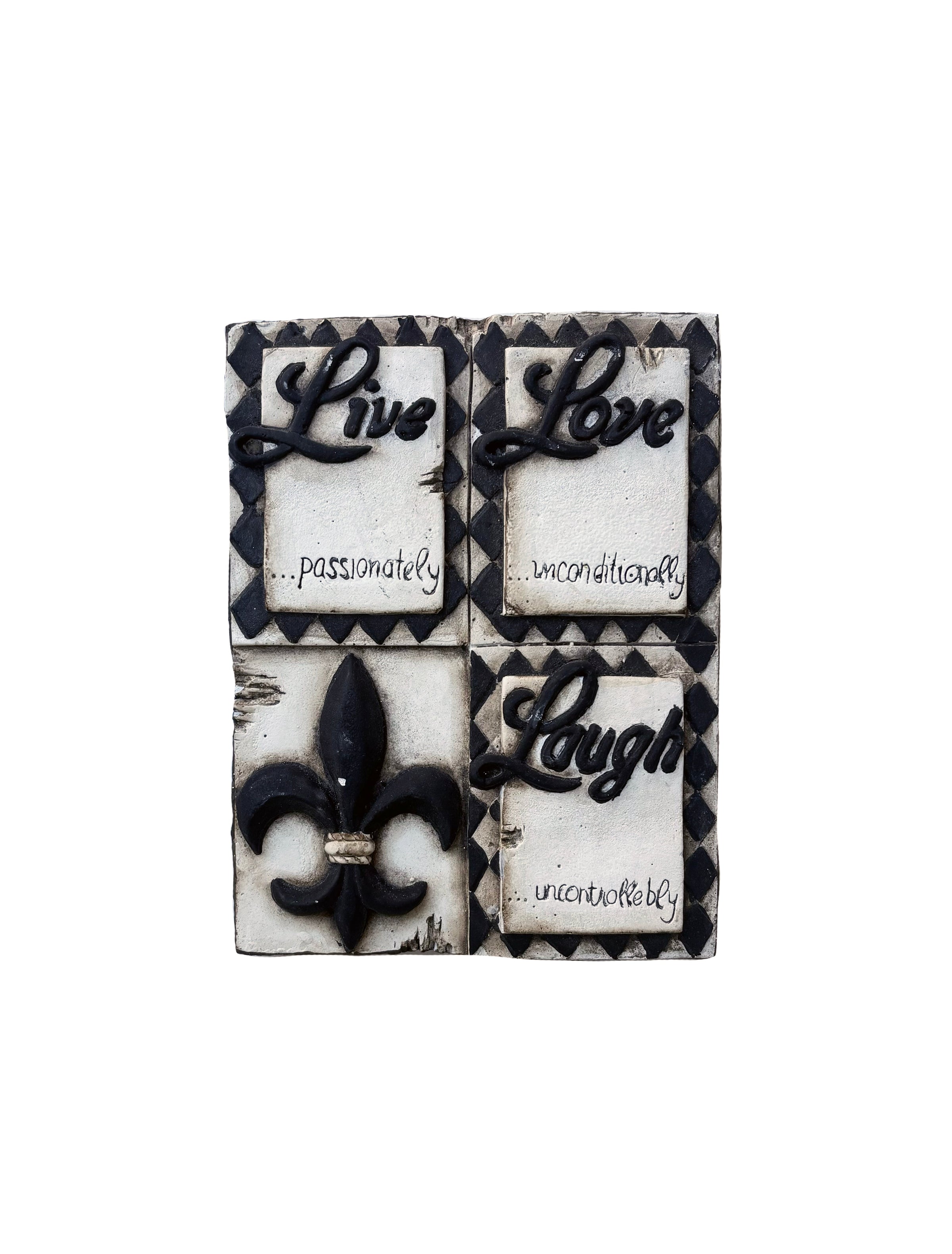 This plaque brings together four tiles with the inspiring words "Live Laugh Love" alongside a charming fleur de lis in the lower left corner, making it an excellent addition to your decor.