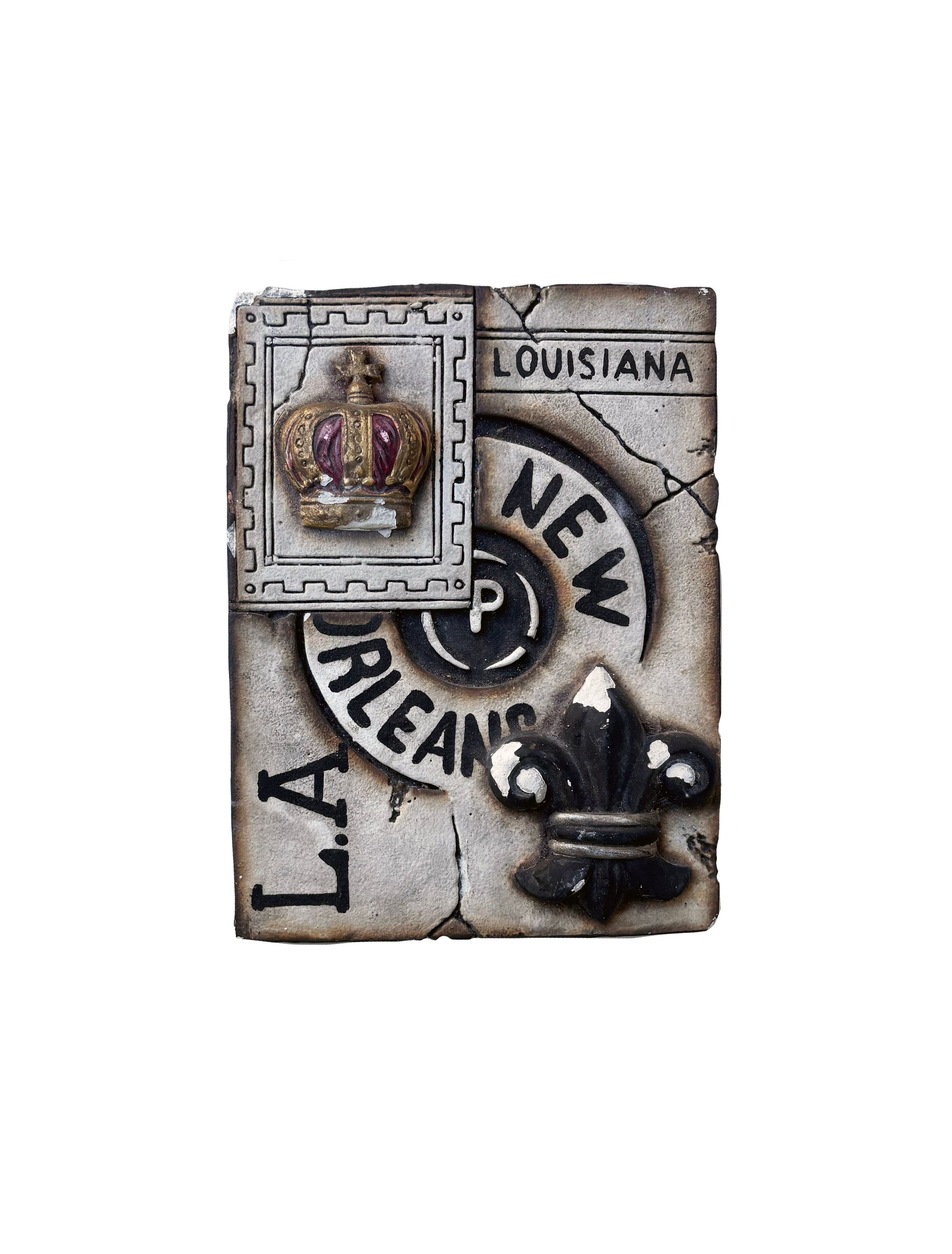 Introducing the Large New Orleans Crown Stamp Plaque! Pay homage to the Big Easy with this quirky plaque featuring a New Orleans stamp-inspired background, topped with a playful crown and iconic fleur de lis. Perfect for adding a touch of the Big Easy to any space.