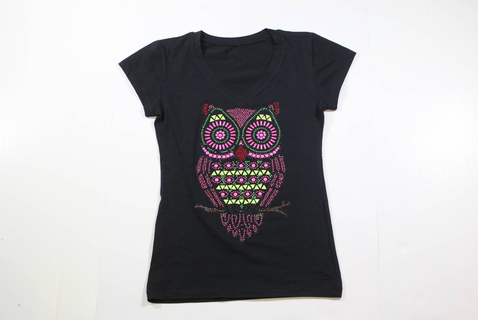 Woot yourself to happiness with this night flyer. This rhinestone shirt features a large pink and green owl sitting on a branch.