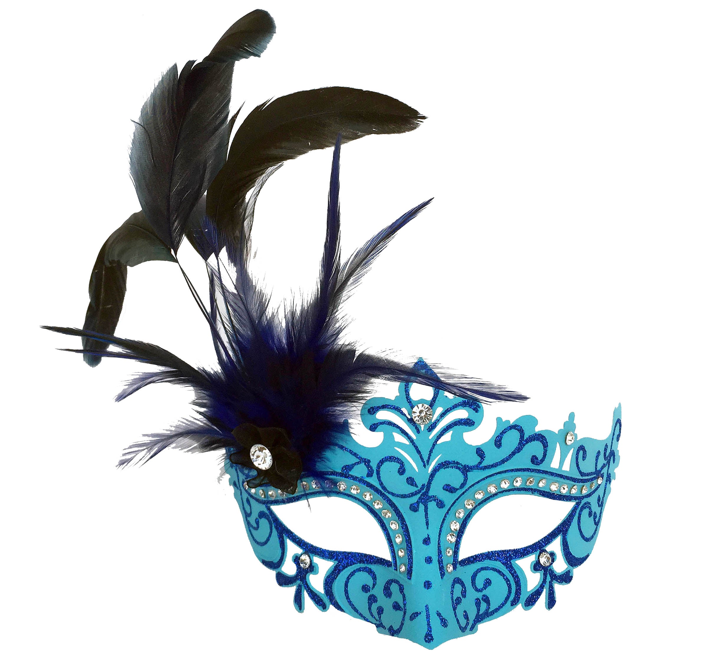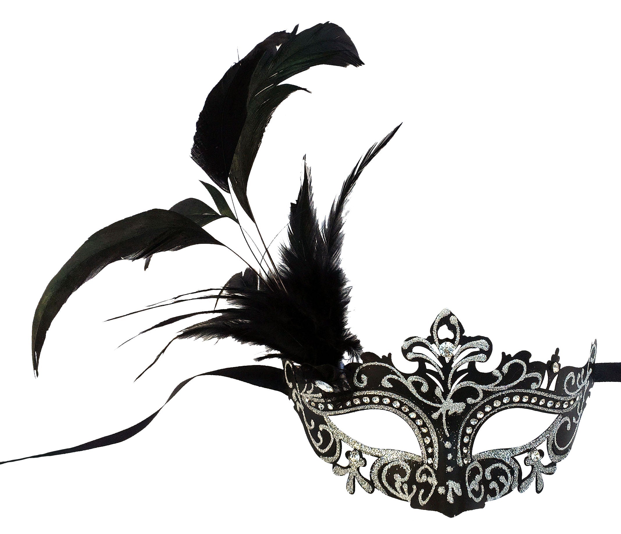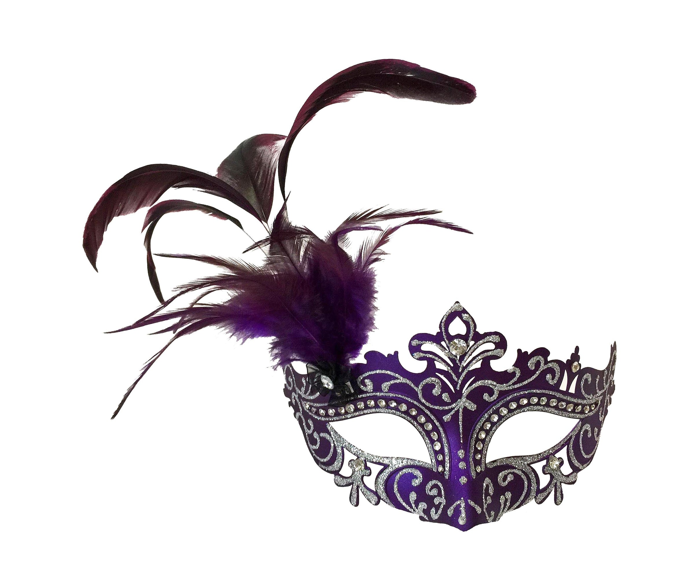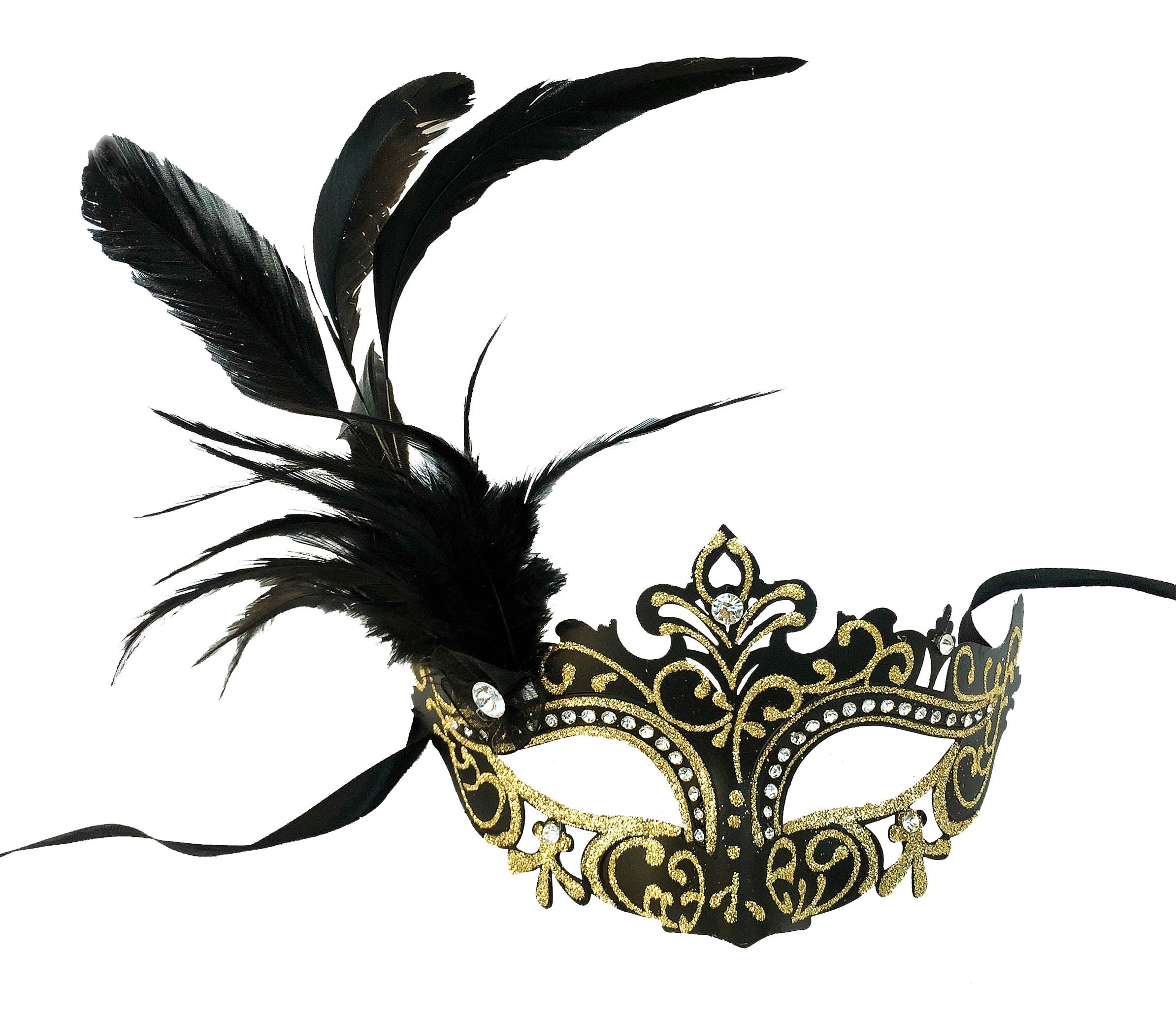 These ornate masks are light weight and have laser cut out accents along the edges of the masks. A beautiful fleur de lis sits at the top with two more small ones accented on the cheeks. Each eyelet is accented with small jewels. Above the right eye of the mask is a feather flair accented with a jewel.  Each masks comes with black ribbons to tie.