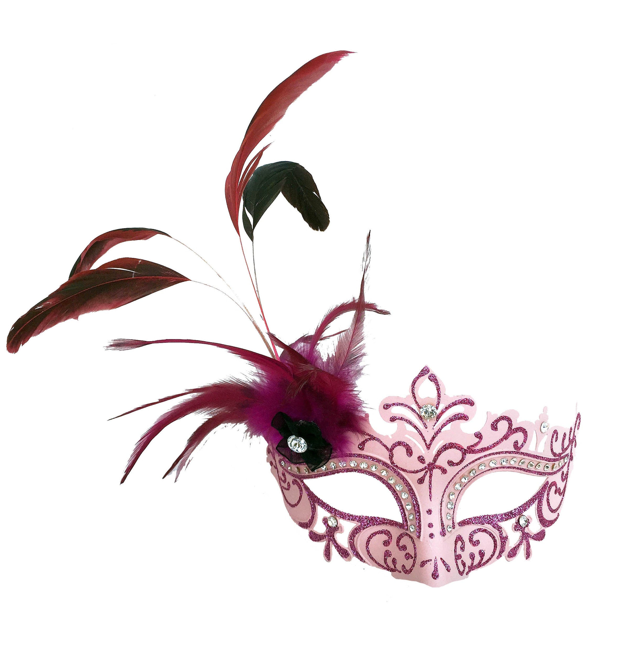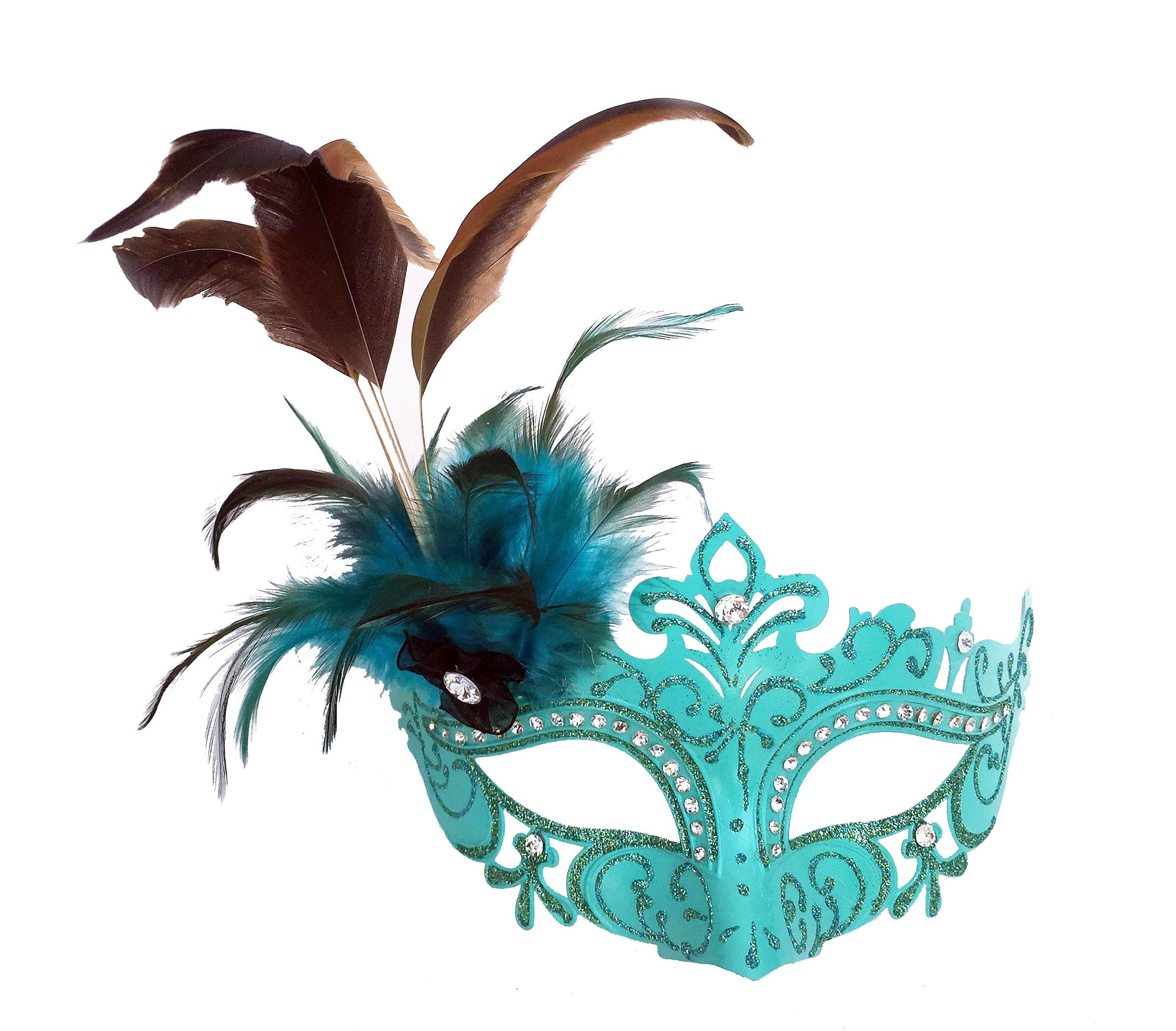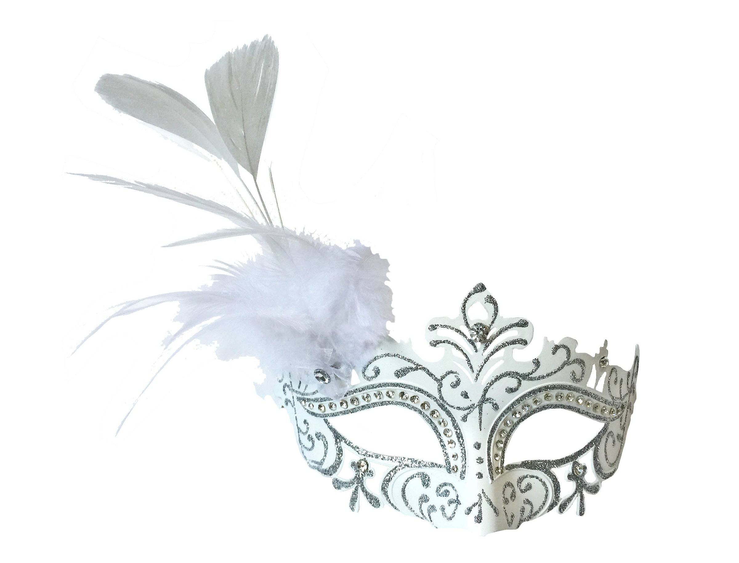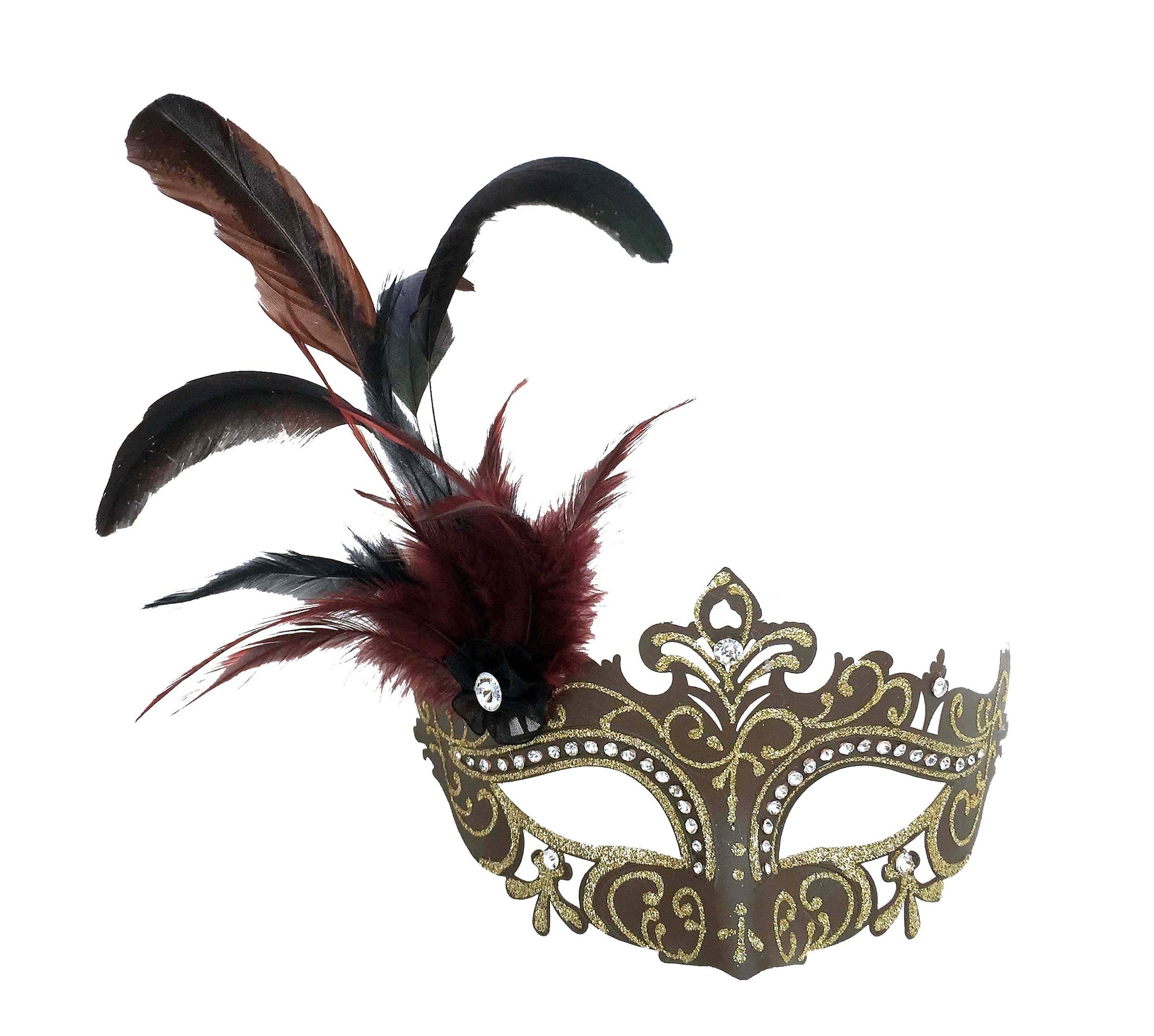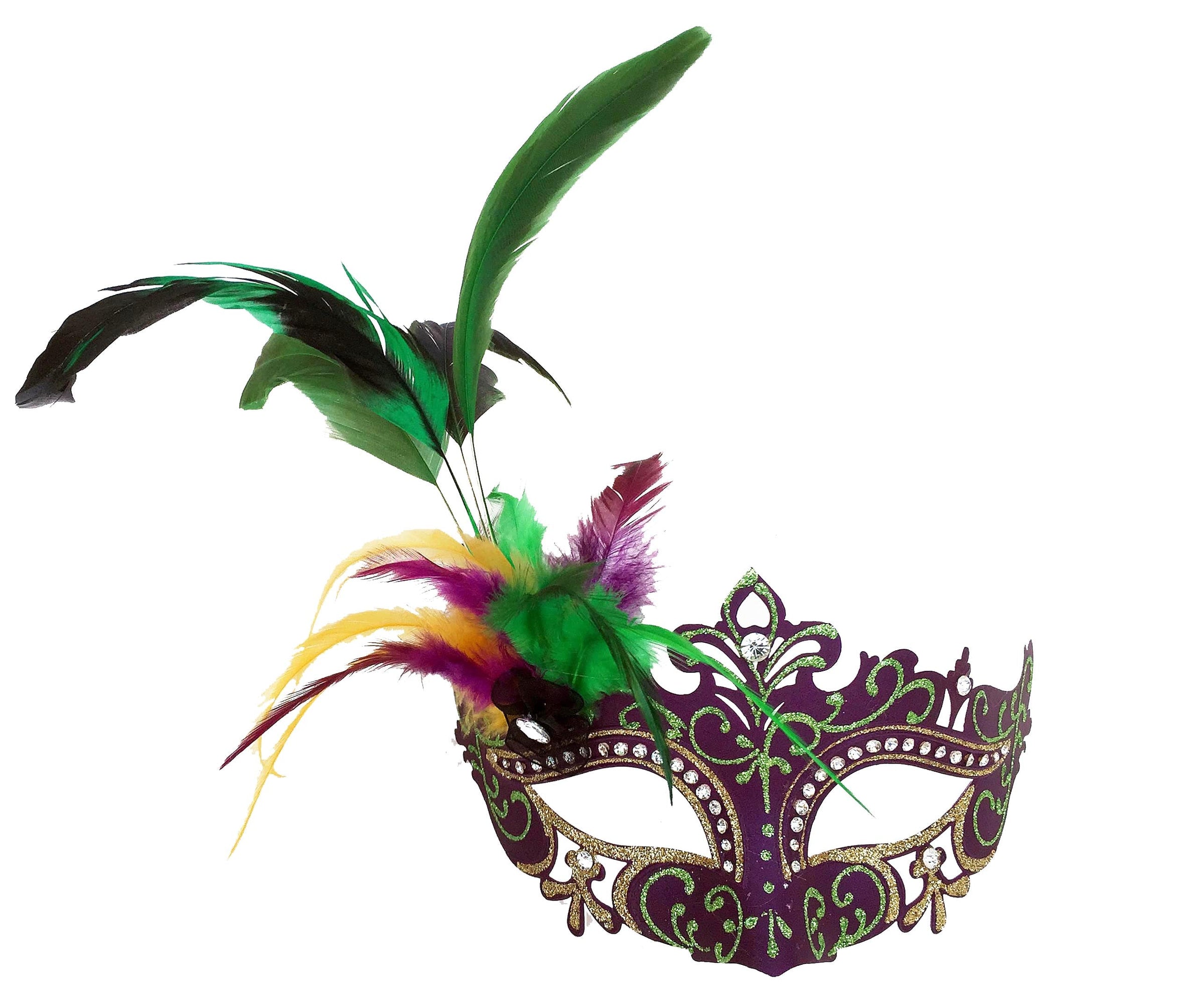 These ornate masks are light weight and have laser cut out accents along the edges of the masks. A beautiful fleur de lis sits at the top with two more small ones accented on the cheeks. Each eyelet is accented with small jewels. Above the right eye of the mask is a feather flair accented with a jewel.  Each masks comes with black ribbons to tie.