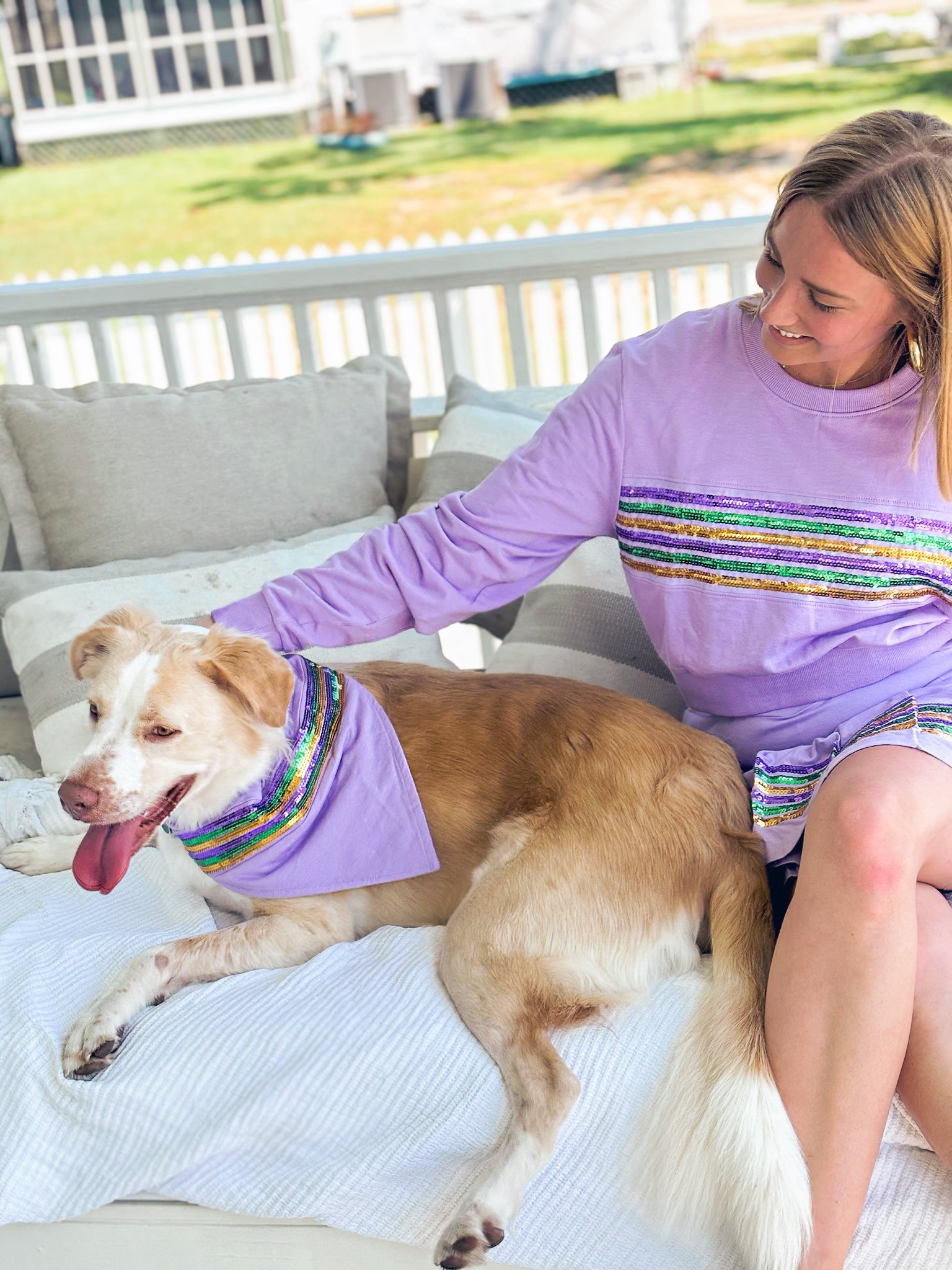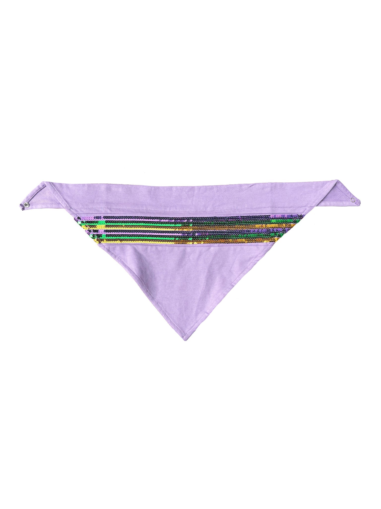 Get ready to paw-ty with our Lavender Sequin Stripe Pet Scarf! This stylish scarf features a festive purple, green, and gold sequin stripe accent, perfect for matching your furry friend at any Mardi Gras celebration. Show off your pet's playful side with this must-have accessory. (Furry fashion never looked so good!)