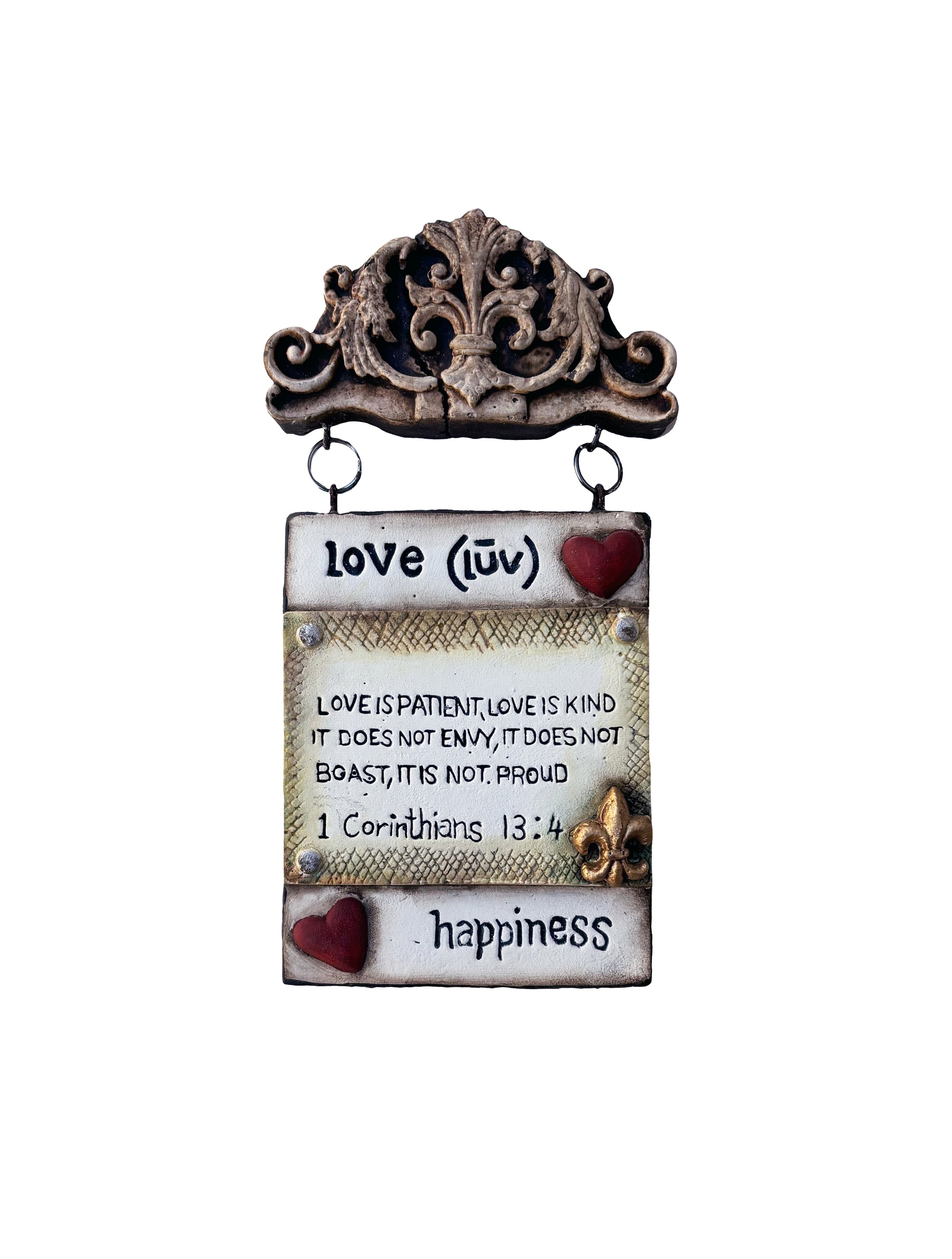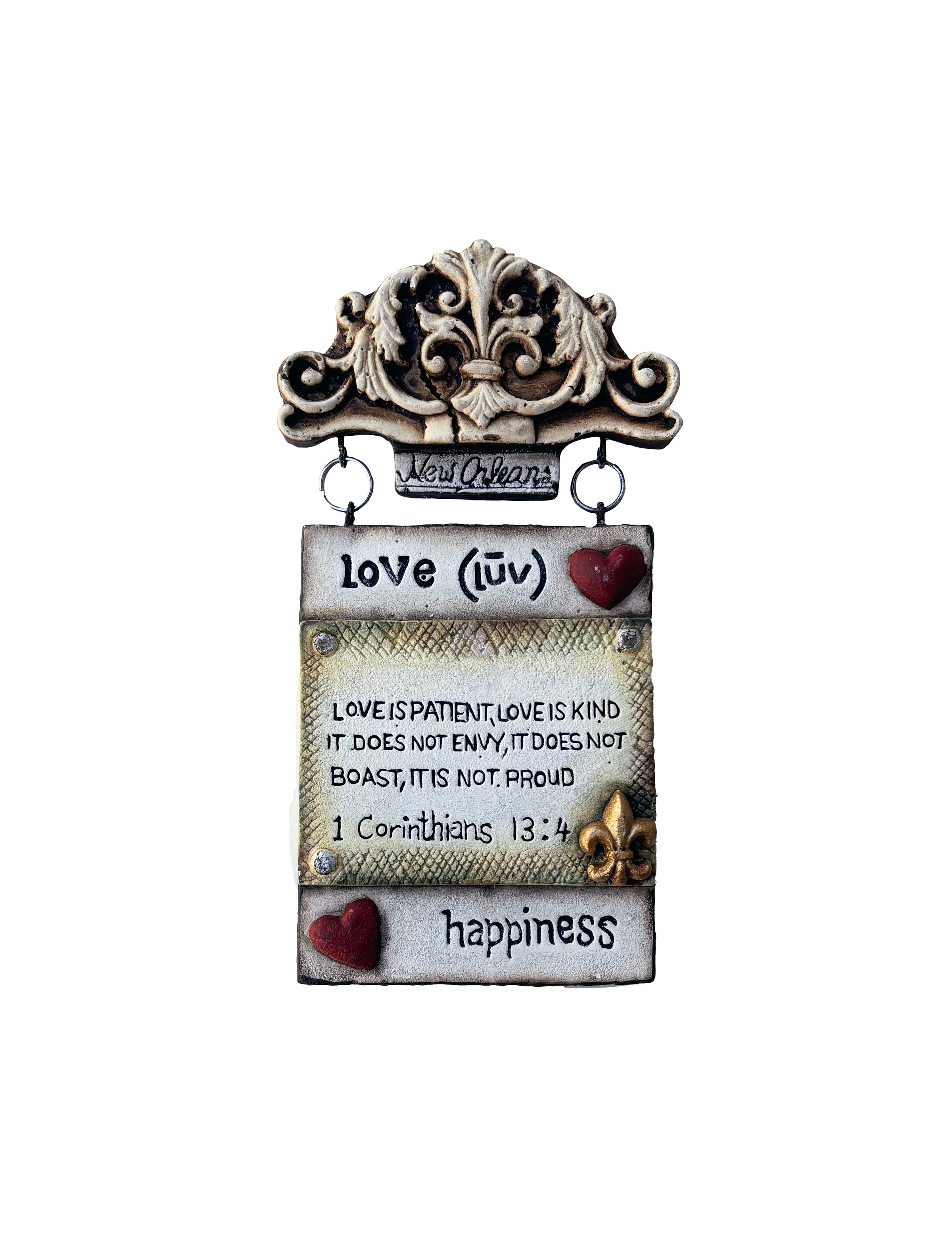 Get an inspirational plaque for yourself or a loved one! This plaque features "Love", "Happiness", and a quote from Corinthians.