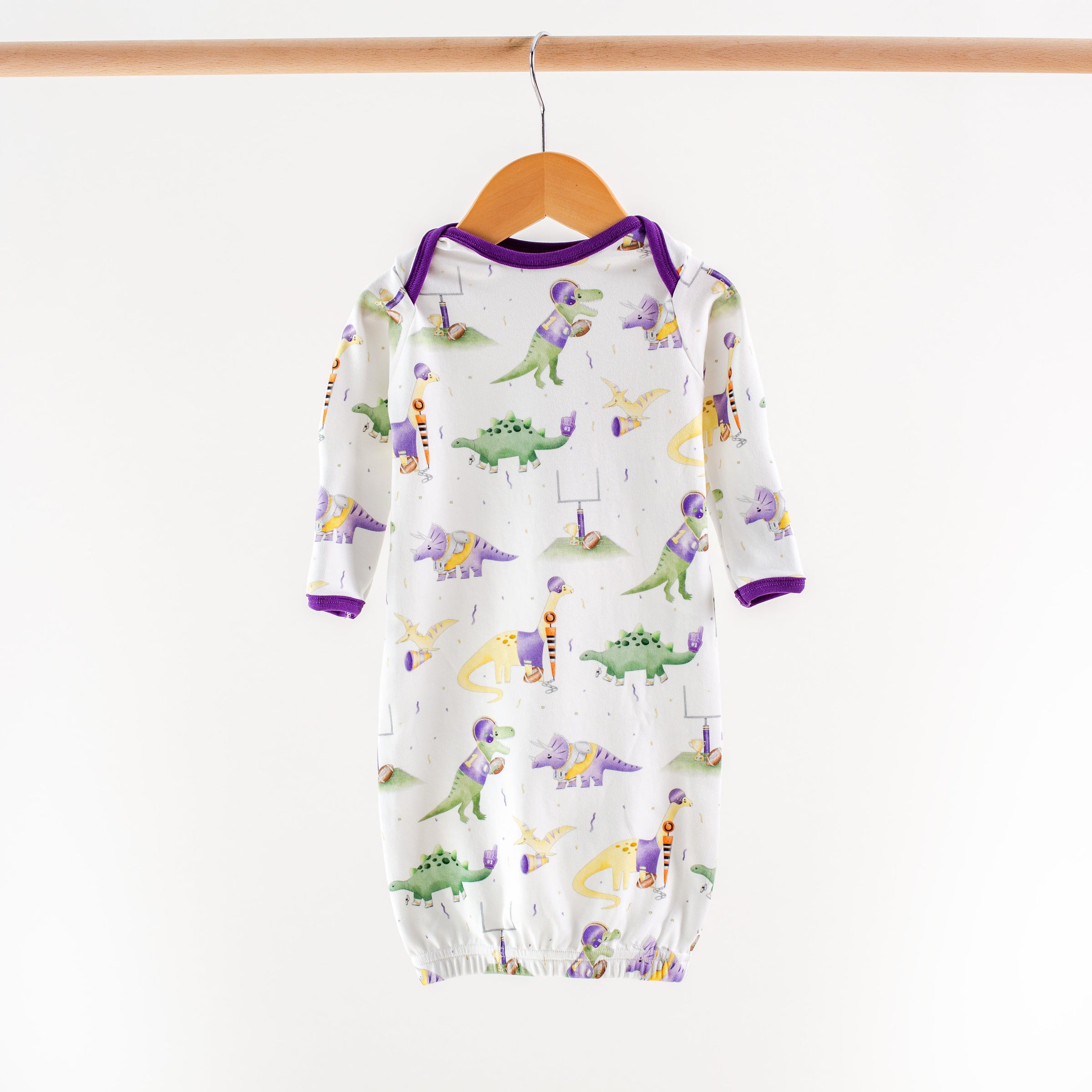 Cheer on the purple and gold with playful dinosaurs charging down the field, tossing footballs, and showing off their game-day moves. This spirited print is perfect for little fans who dream of touchdowns and dino-sized celebrations. Crafted from ultra-soft, GOTS-certified organic cotton, these breathable pajamas keep your child cozy and comfy from the first whistle to bedtime. Whether they’re watching the big game or snuggling in for the night, these PJs blend comfort, team pride, and prehistoric fun for a look that’s always a win.