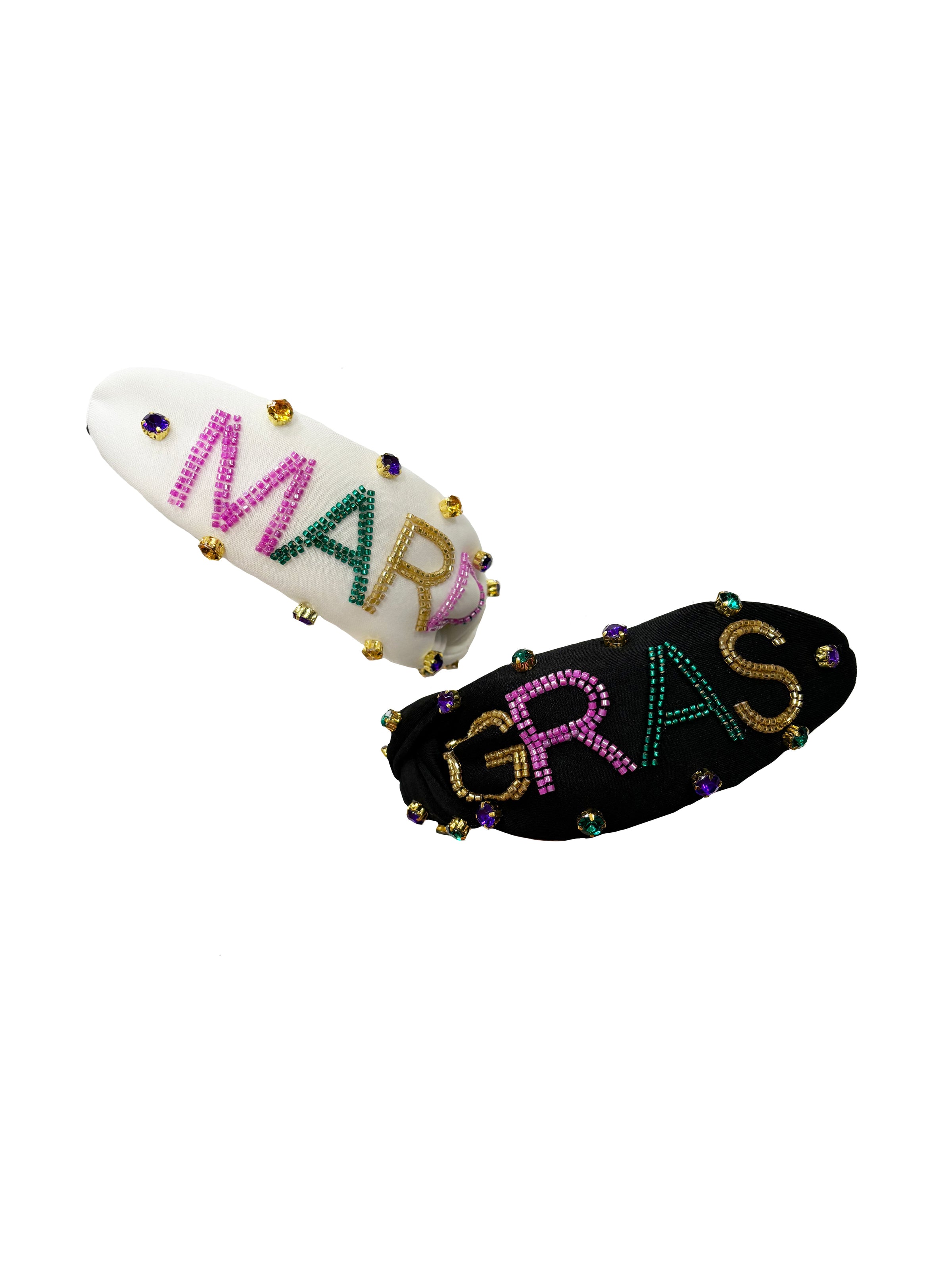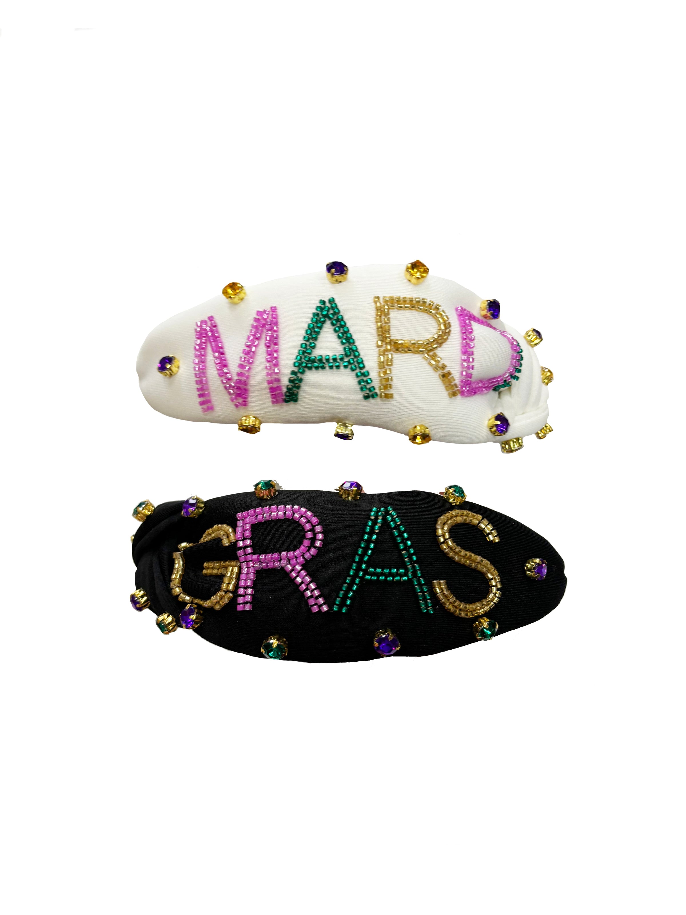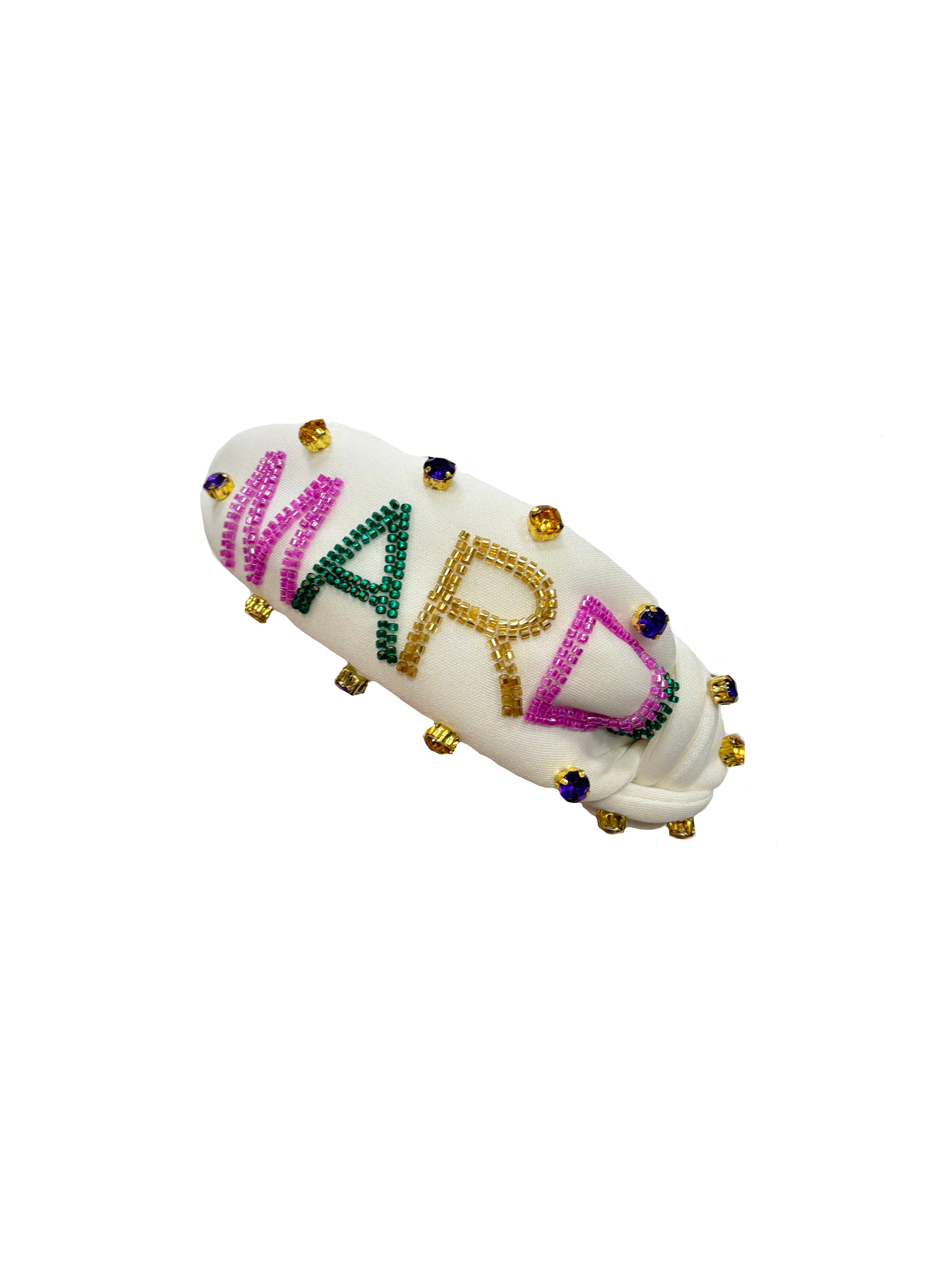 Jazz up your Mardi Gras look with this White Beaded Headband! With sparkling jewels and beads spelling out the words "Mardi Gras", this headband is sure to make you stand out in the crowd. Perfect for parades, parties, or just adding a touch of fun to any outfit!