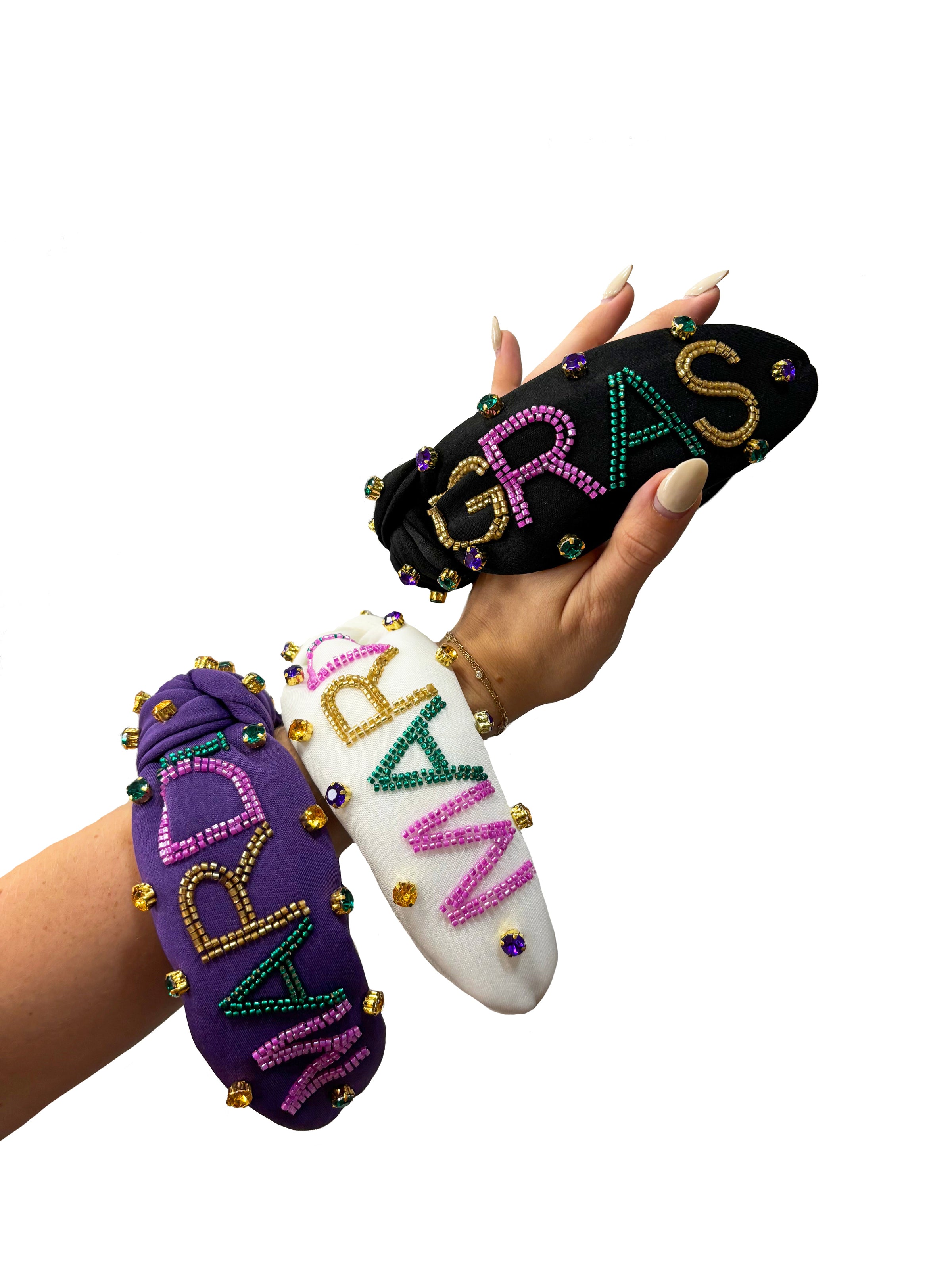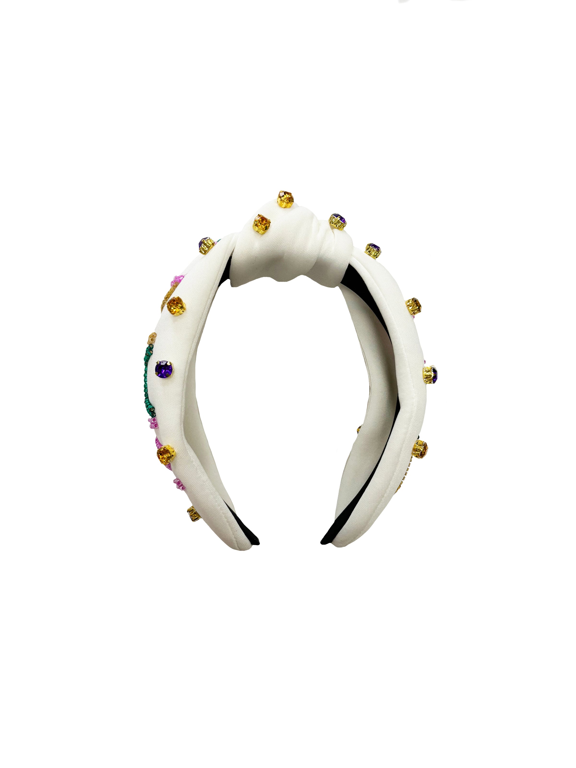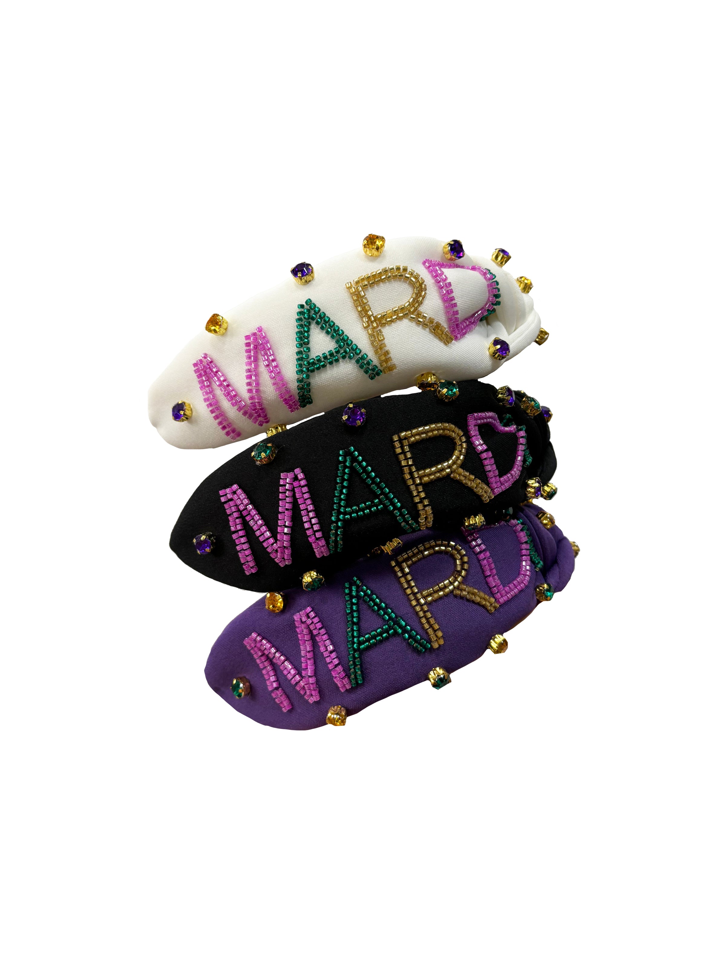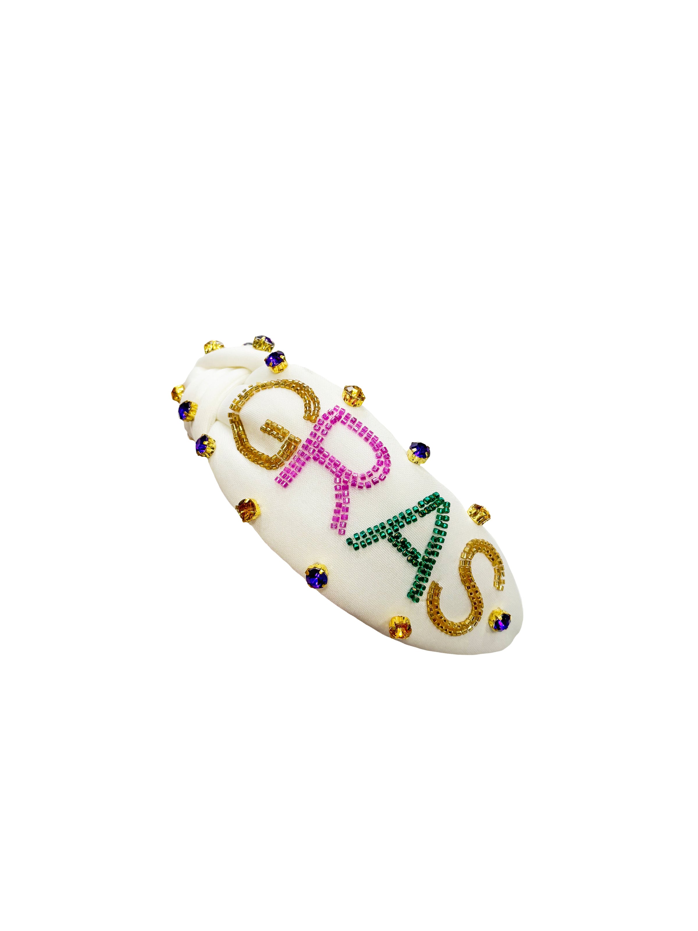Jazz up your Mardi Gras look with this White Beaded Headband! With sparkling jewels and beads spelling out the words "Mardi Gras", this headband is sure to make you stand out in the crowd. Perfect for parades, parties, or just adding a touch of fun to any outfit!