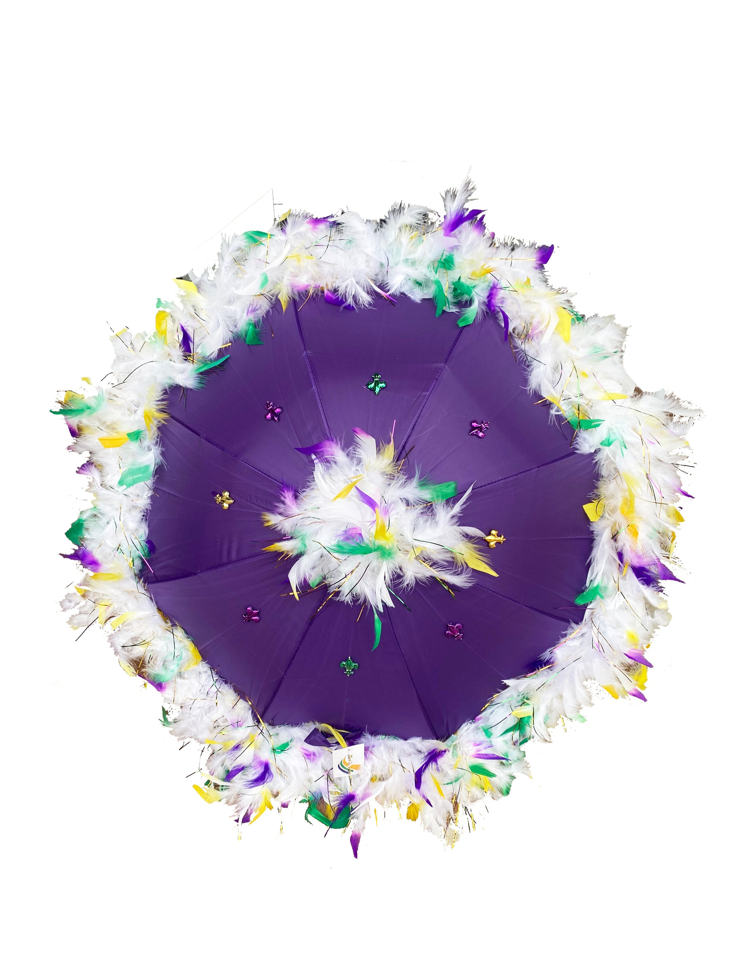 Join the party with our Mardi Gras Feathered Parasol featuring white feathers! Perfect for parades and second line celebrations, this parasol adds a touch of fun to any event. Don't miss out, grab yours today and let the good times roll!