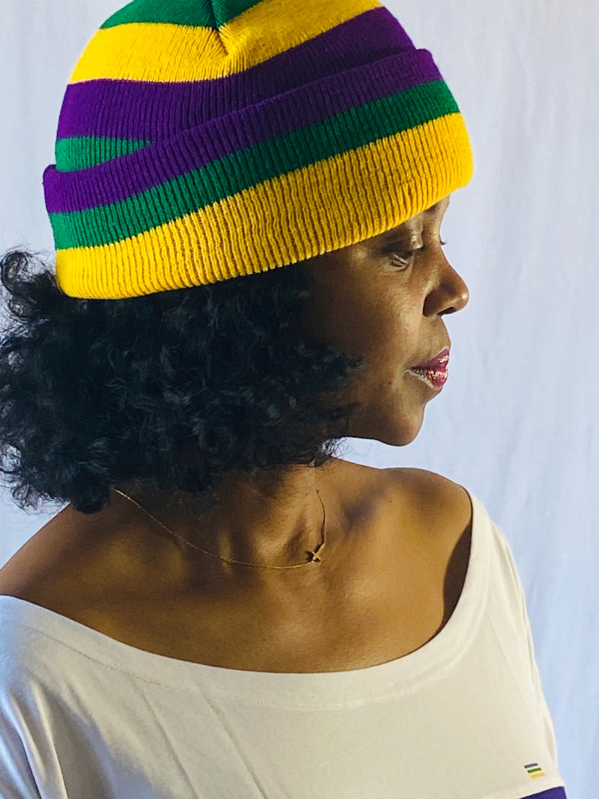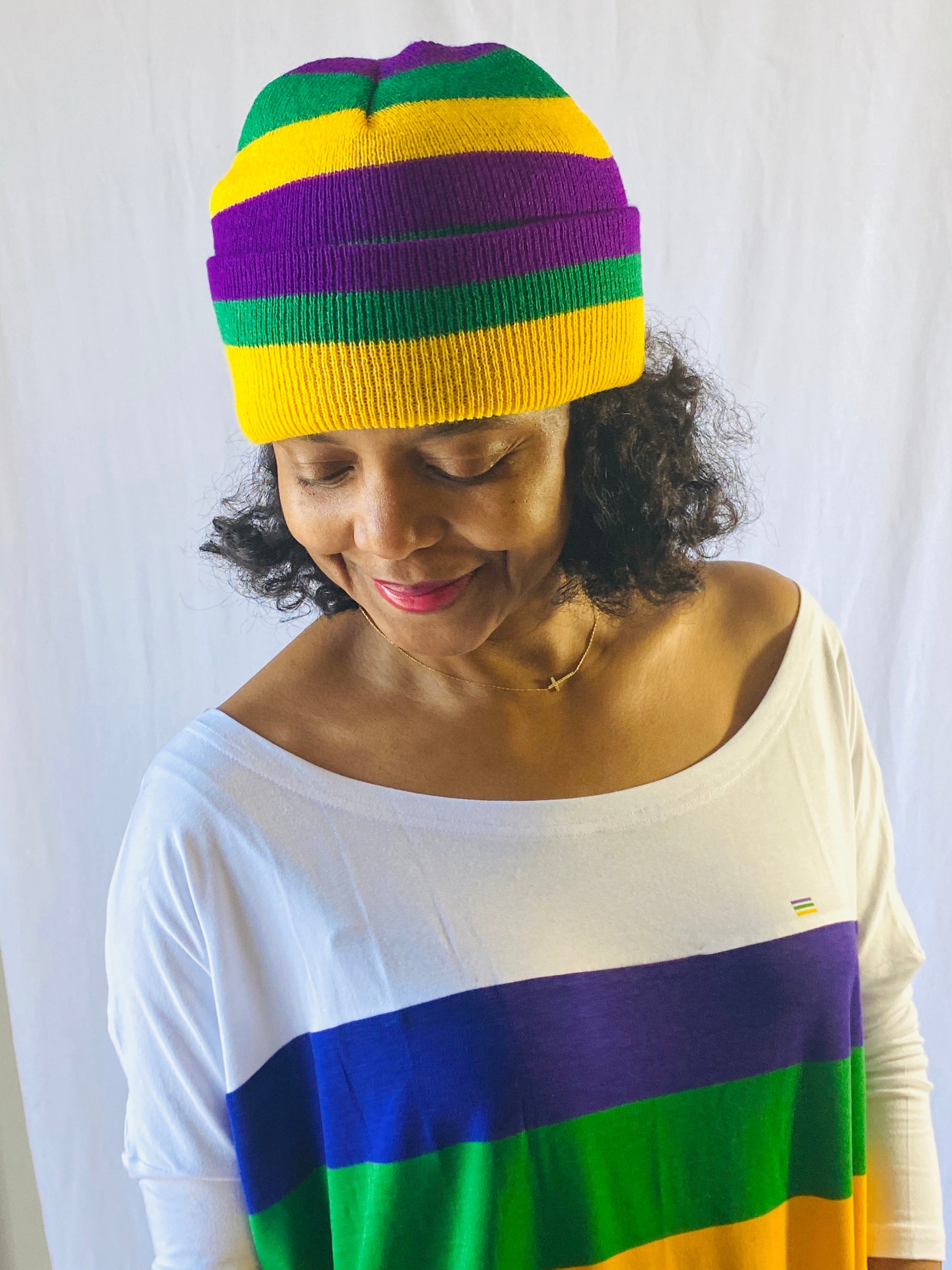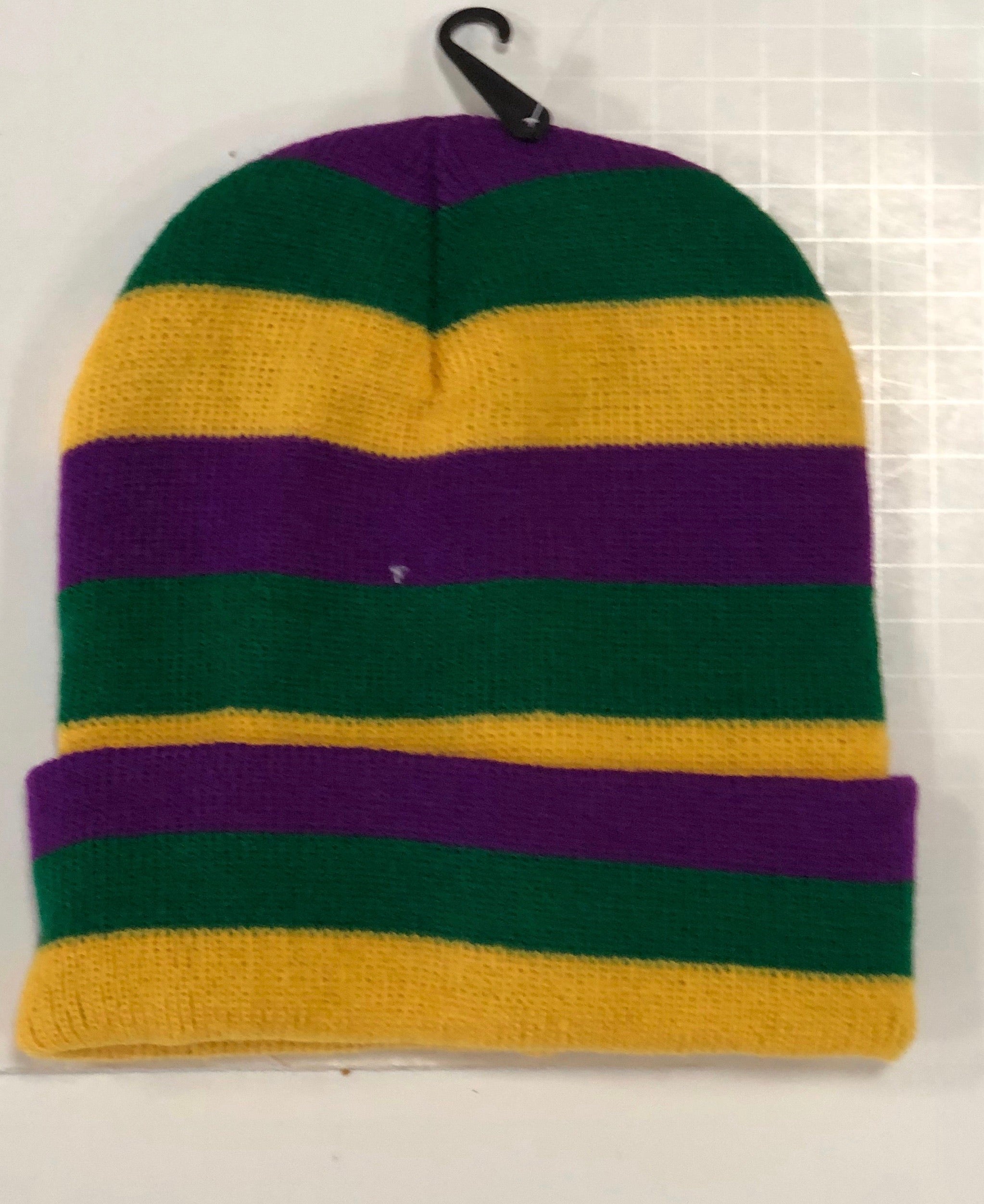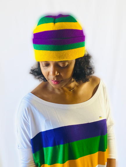This classic, purple/green/gold rugby striped beanie is the must have accessory this parade season! Stay warm and party on! Laissez les bon temps rouler.