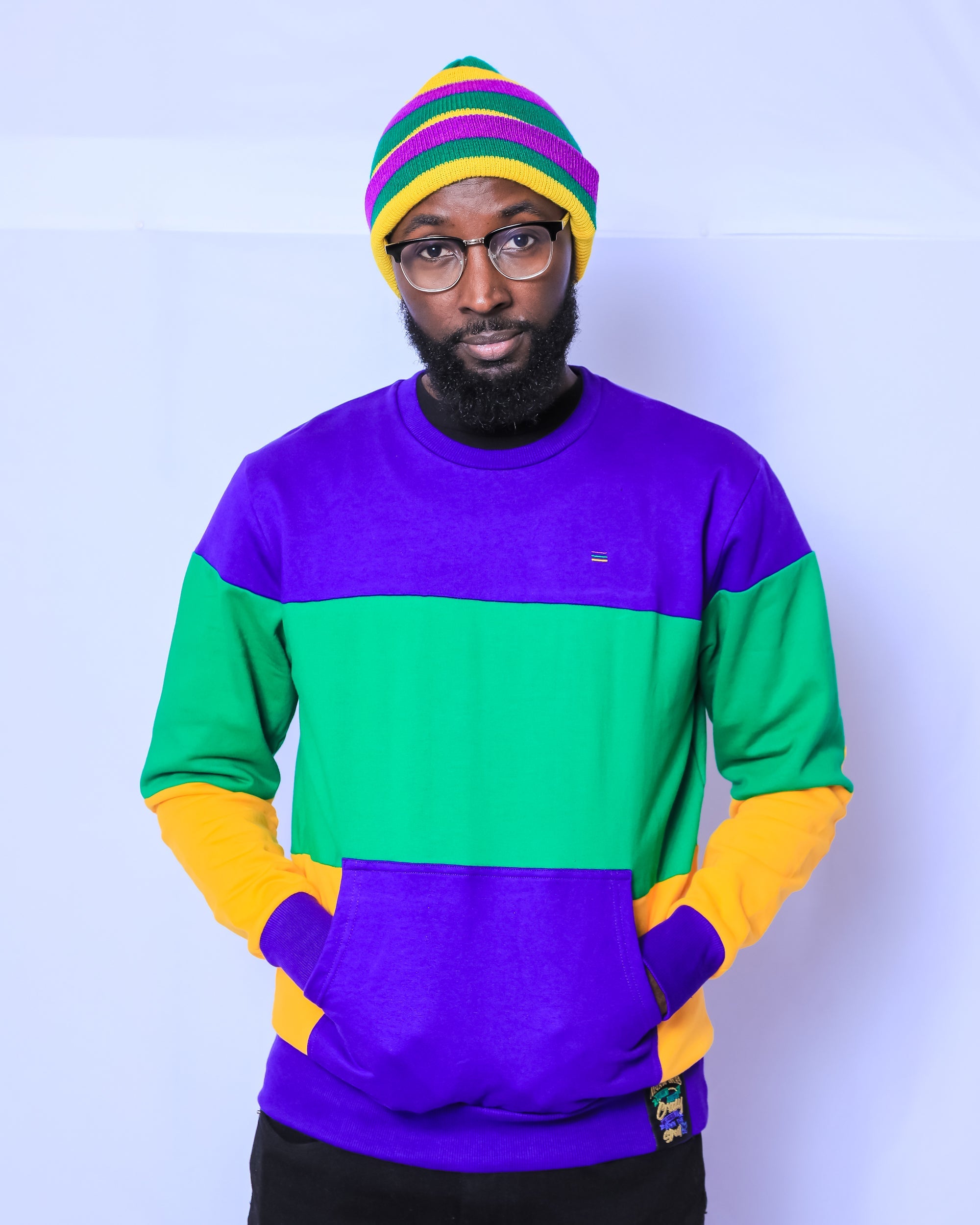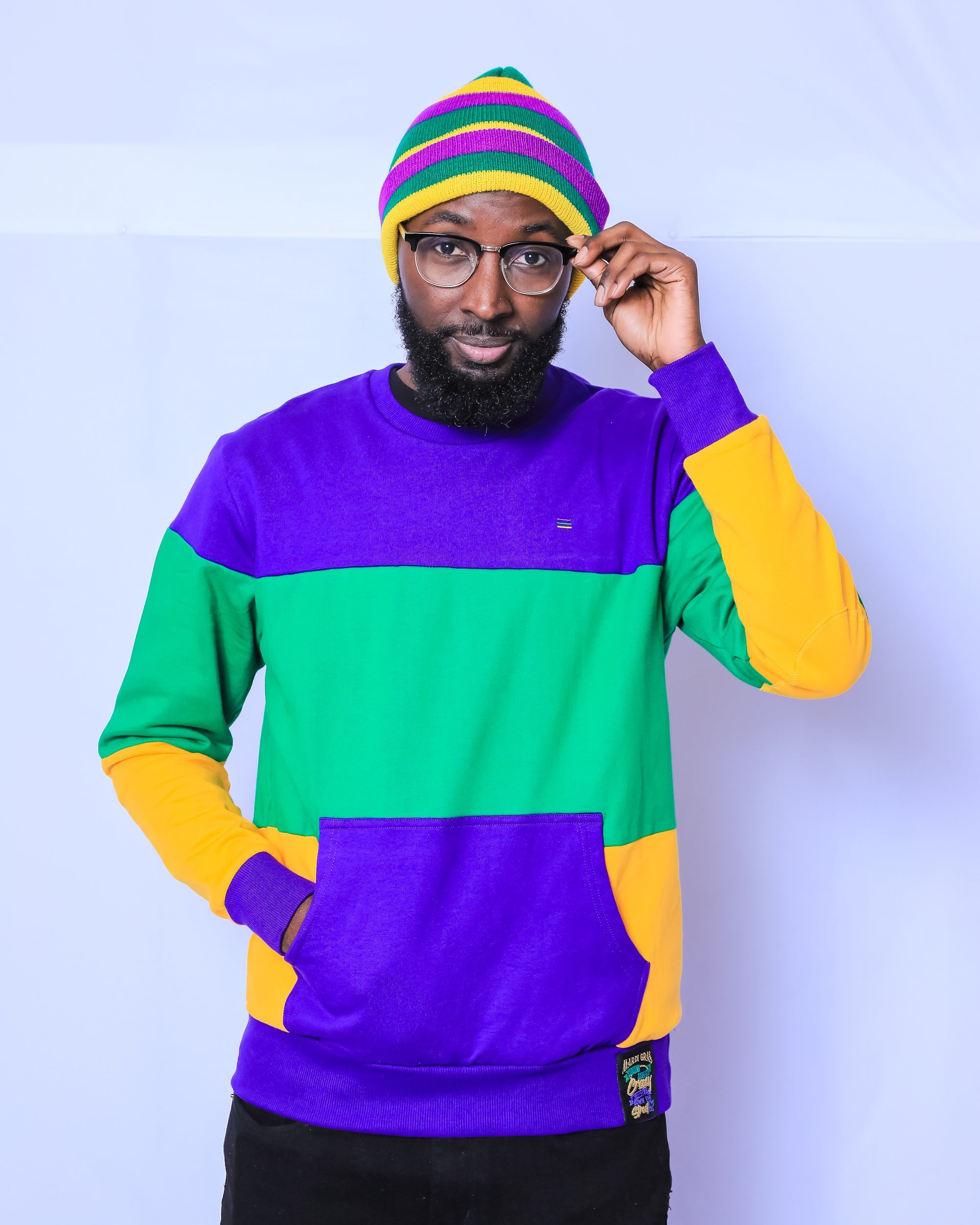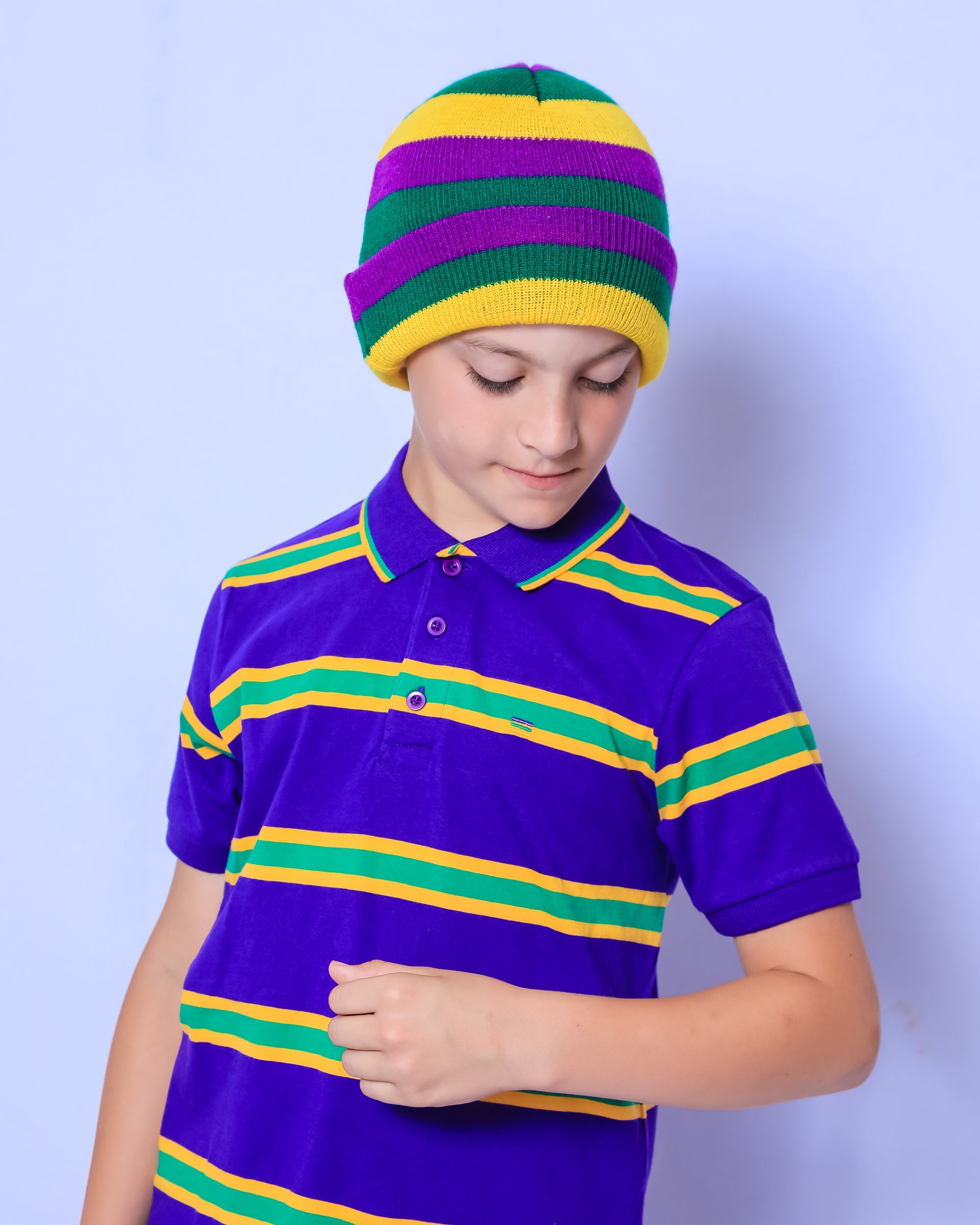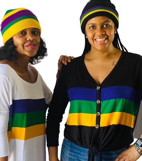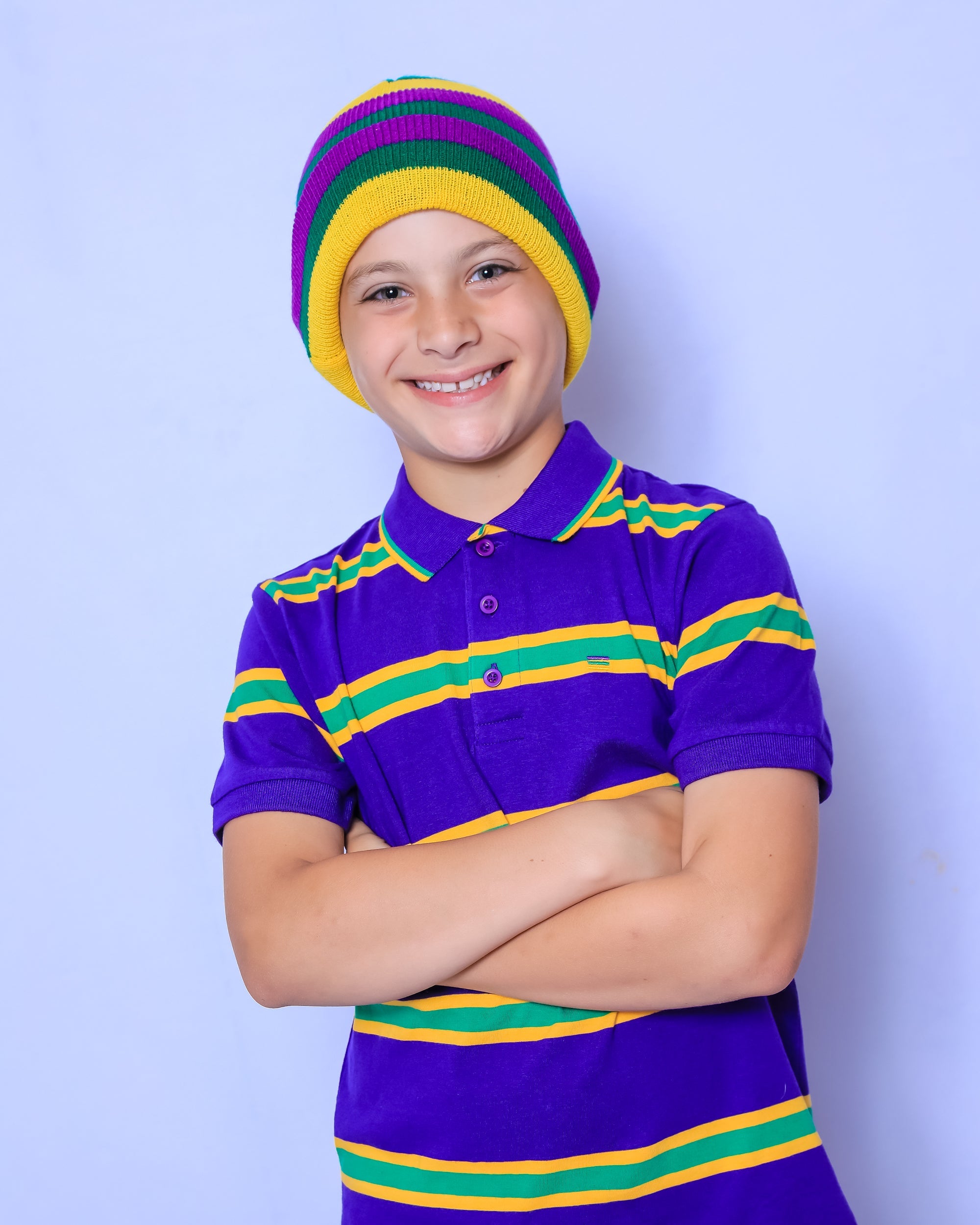 This classic, purple/green/gold rugby striped beanie is the must have accessory this parade season! Stay warm and party on! Laissez les bon temps rouler.