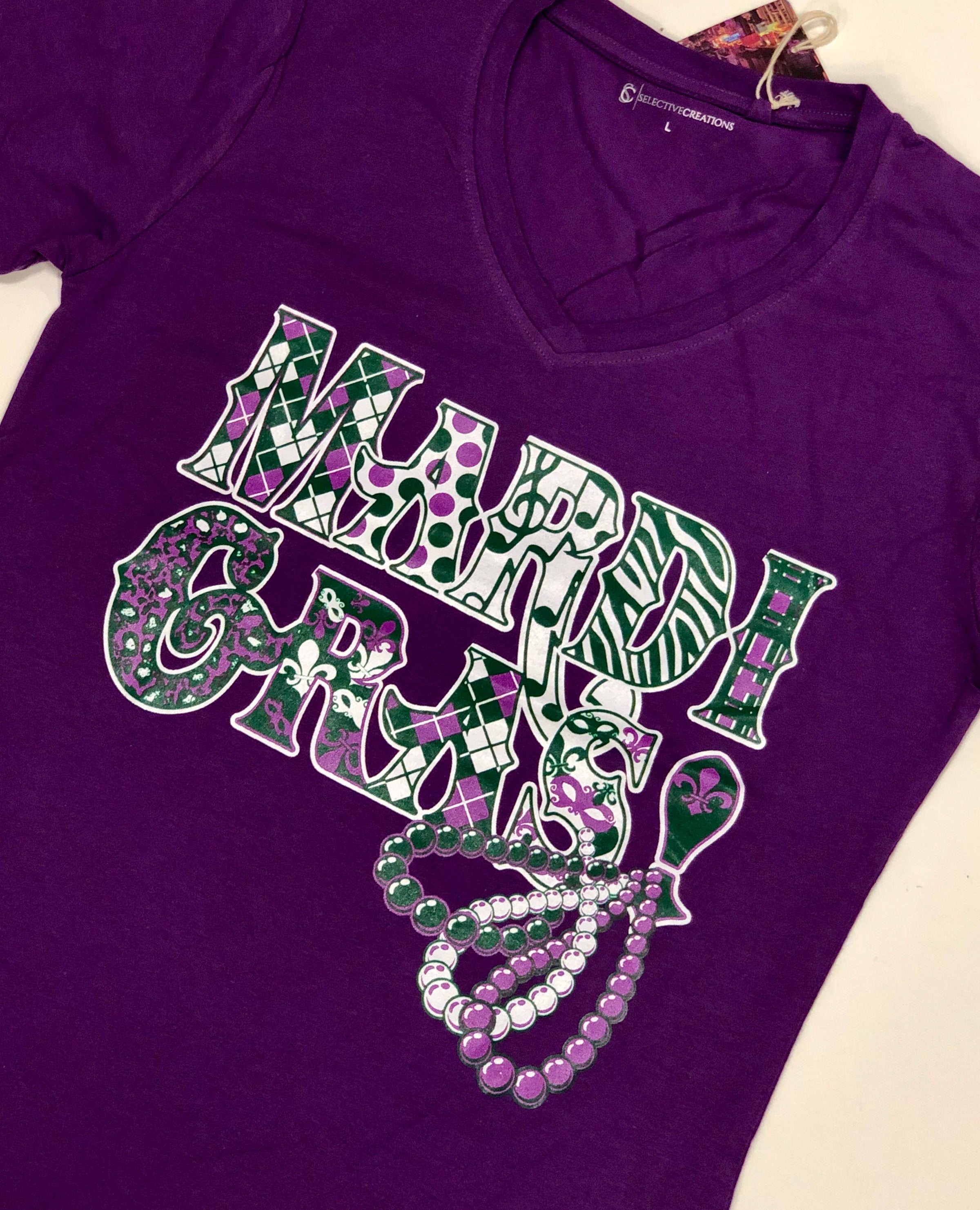Laissez les bon temps rouler! This t-shirt reads "Mardi Gras!" in fun purple and green patterns with beads.