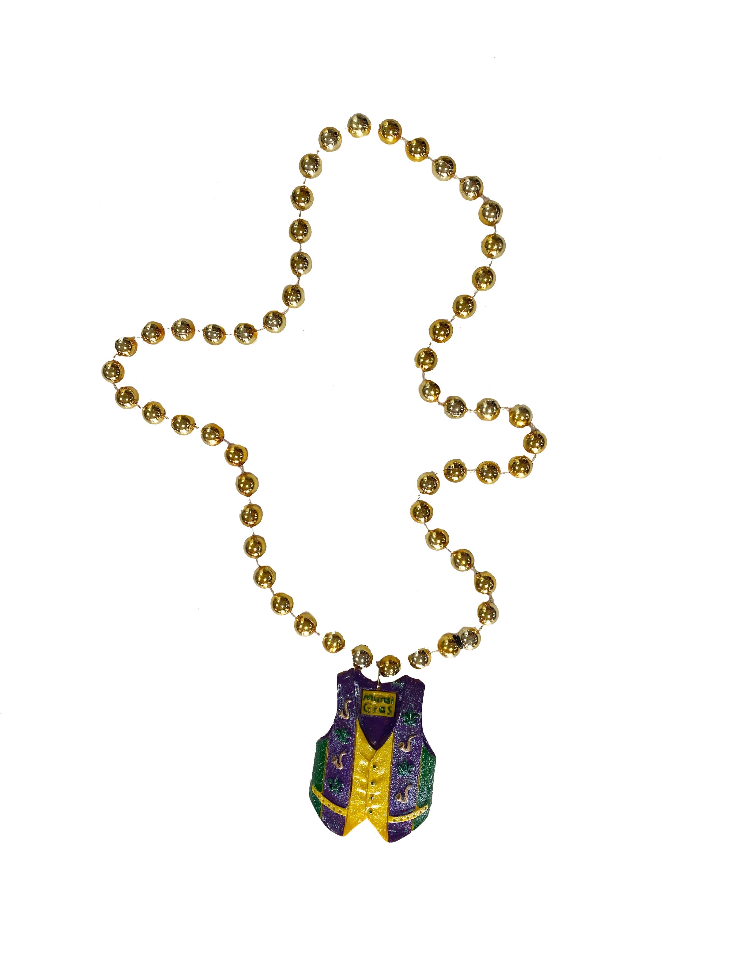 Add some flair to your Mardi Gras outfit with our colorful vest medallion on a gold specialty bead. With shades of purple, green, and gold, you'll stand out from the parade crowd. Time to let the good times roll!