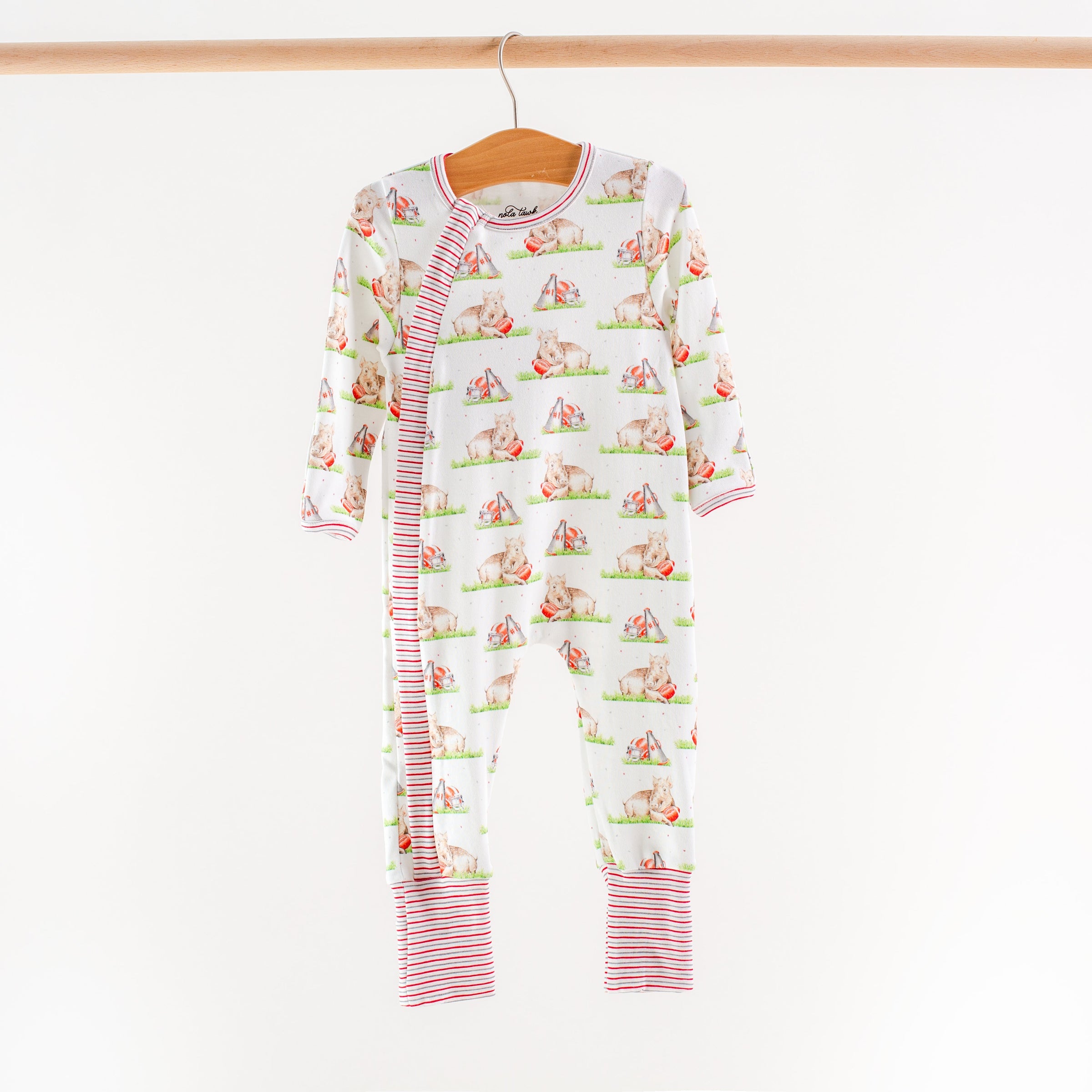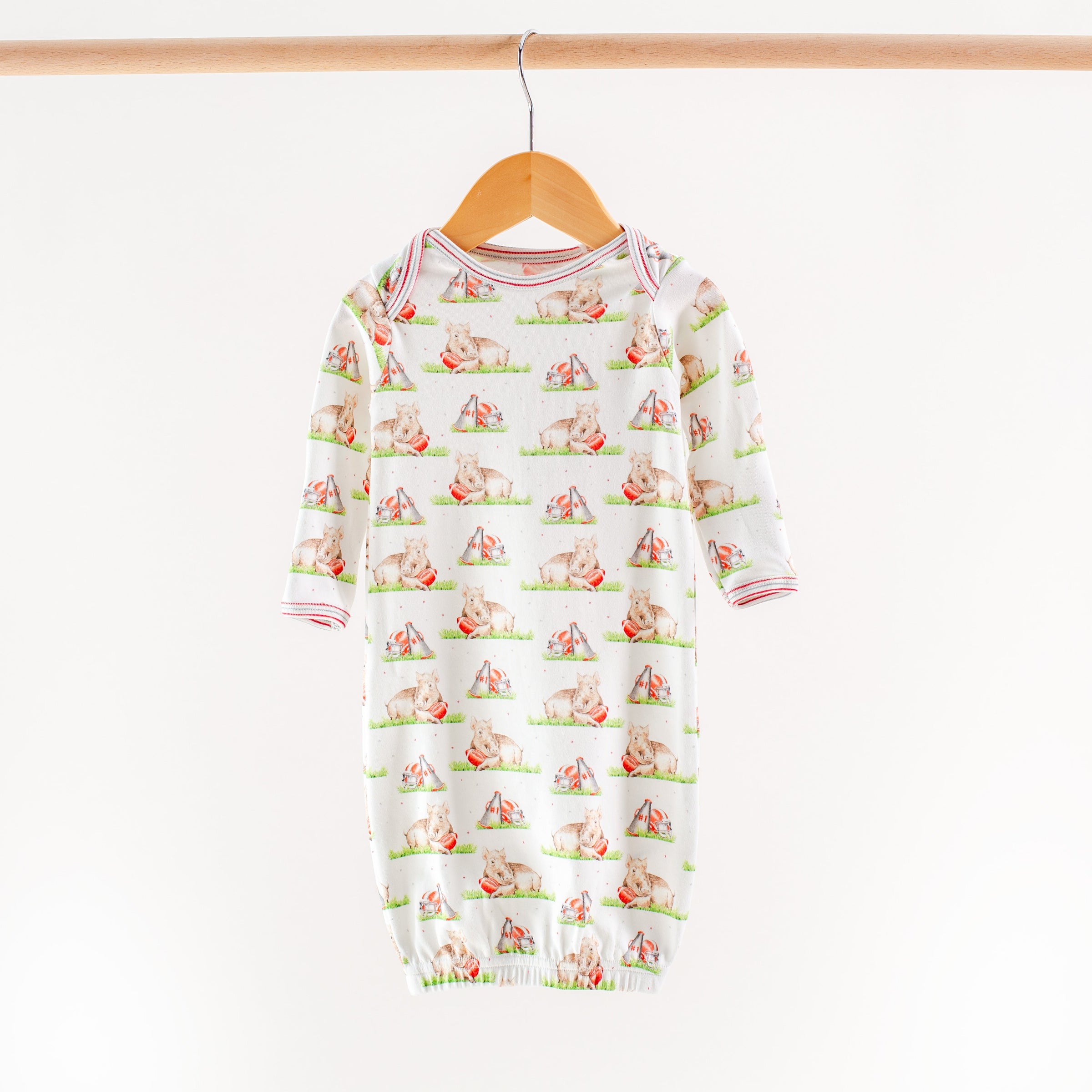 Featuring a playful print of hog mascots, team tents, and Arkansas spirit accented with red-striped cuffs, neckline, and waistband, this set is perfect for storytime, bedtime, and all-night comfort.