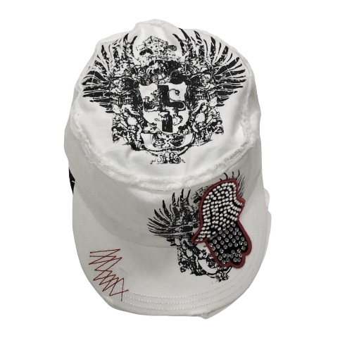We are total fans of this white cap with an abstract black print and red bordered Hamsa sequined symbol. Perfect for all your summer fun!