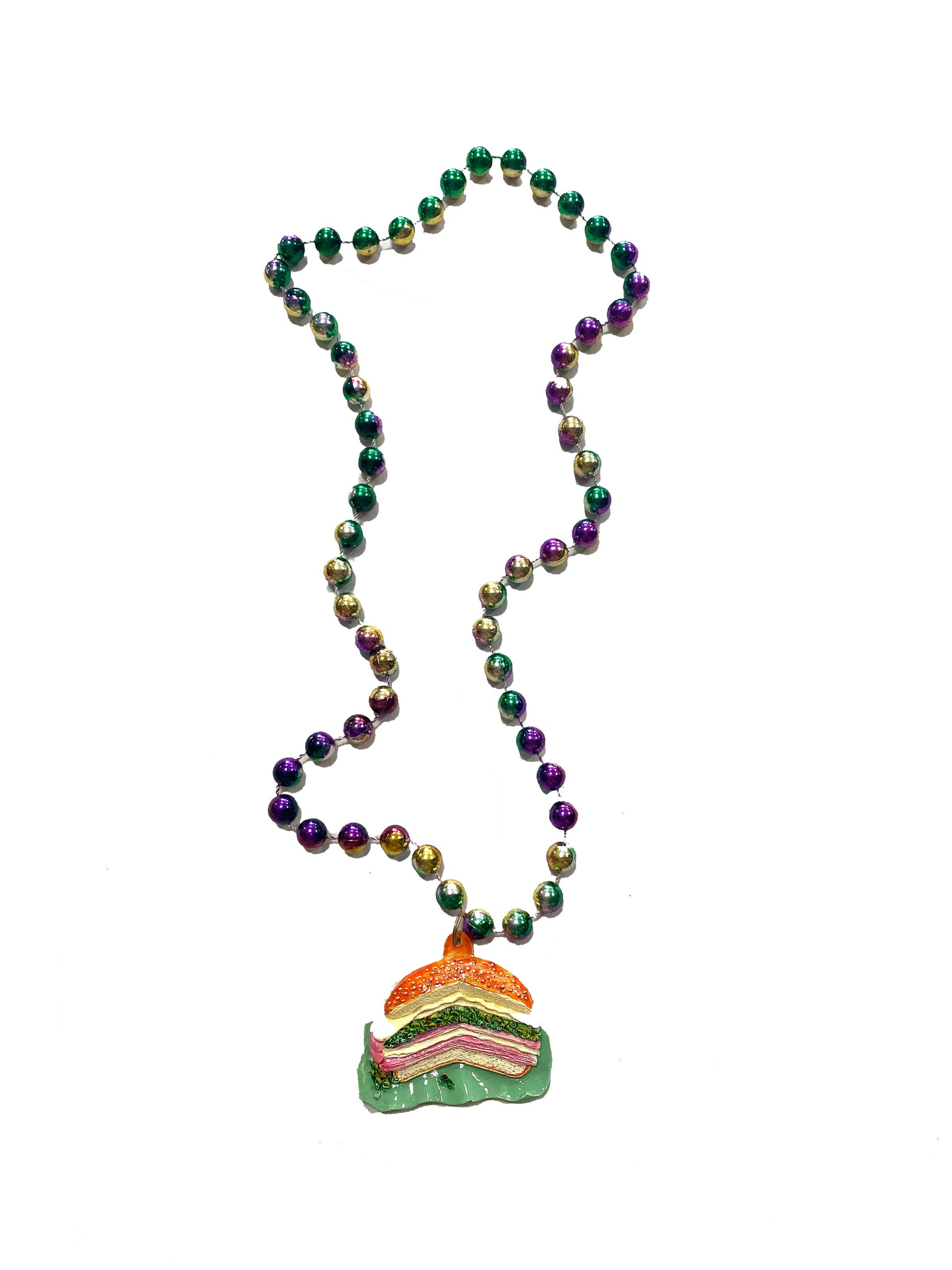 Ready for a delicious style upgrade? Adorn yourself with this unique Muffuletta Medallion, crafted with a muffuletta sandwich on a vibrant purple, green, and gold bead! Savor the flavor of the New Orleans classic without the mess. (No mayo-drenched fingers required!)