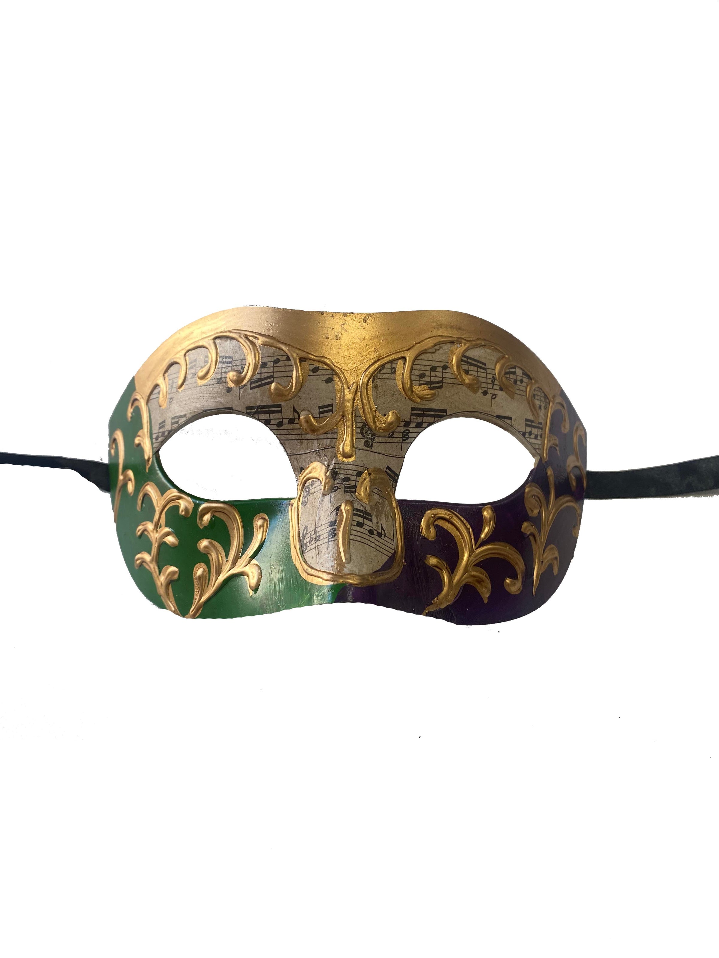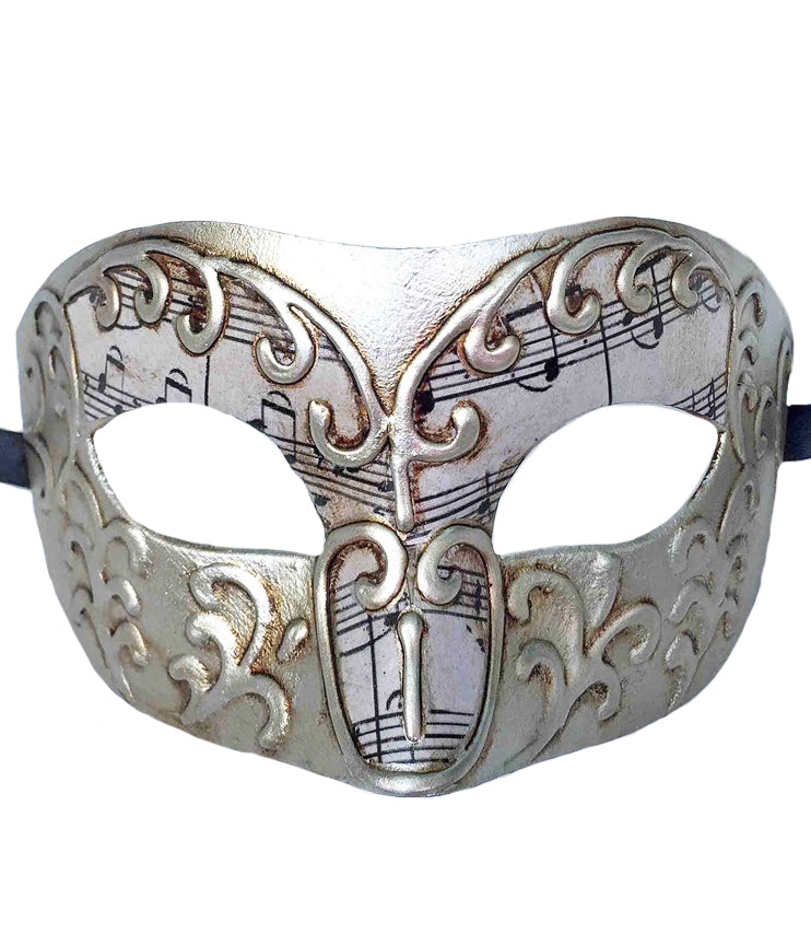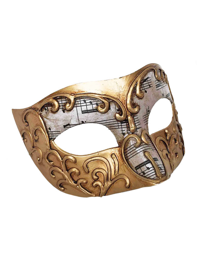 This mask features a music sheet underlay with a textured tased gold swirl overlay to make an intricate mask design. Each mask comes with black ribbon to tie.