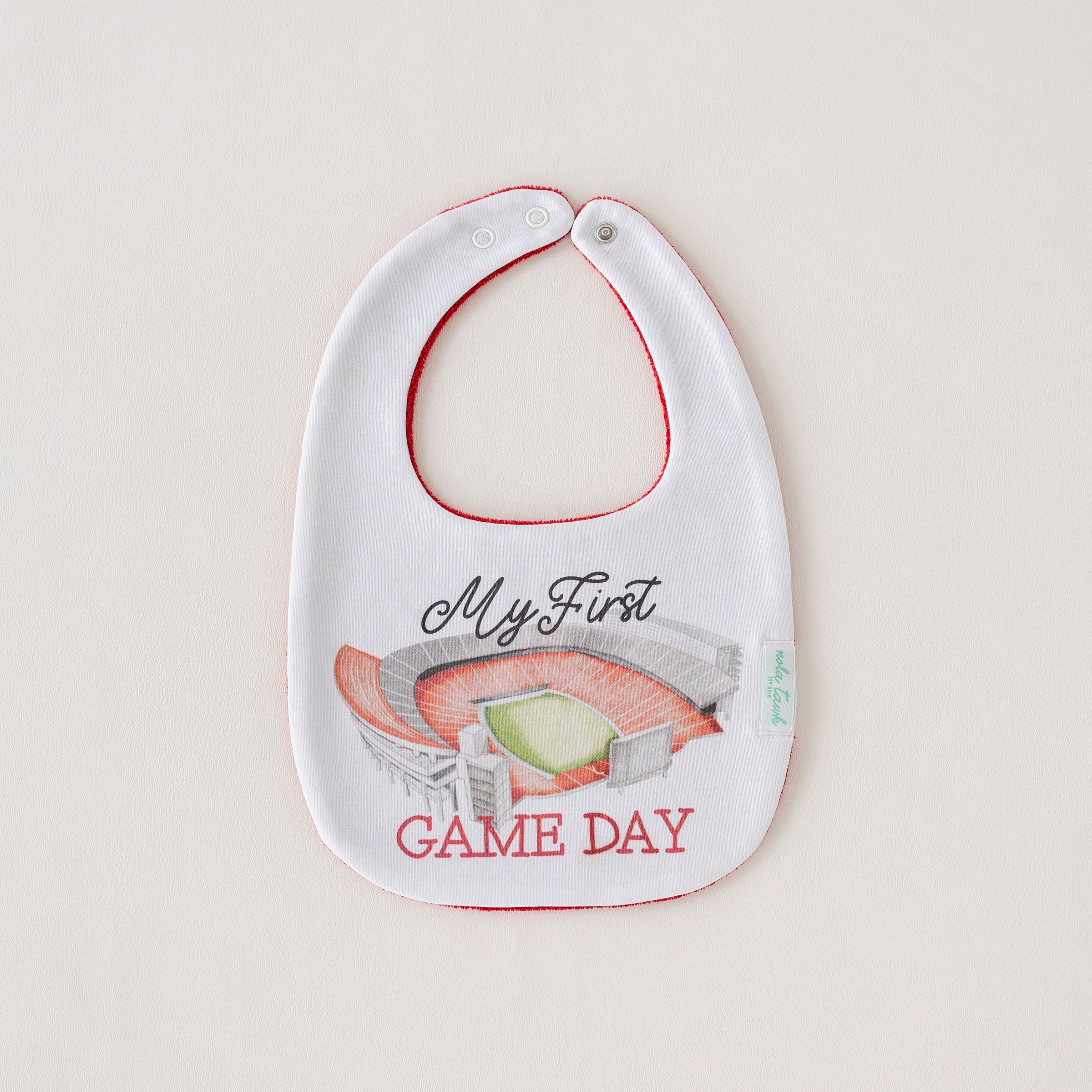 Celebrate your baby’s very first Georgia Bulldogs game day with our “My First Game Day” organic cotton baby bib! Featuring a vibrant illustration of Sanford Stadium on the front and a soft, absorbent red terrycloth back, this bib keeps little fans comfy and mess-free while showing off their Dawg pride. Perfect for game days, tailgates, and everyday wear, it’s a must-have accessory for every future Georgia fan.