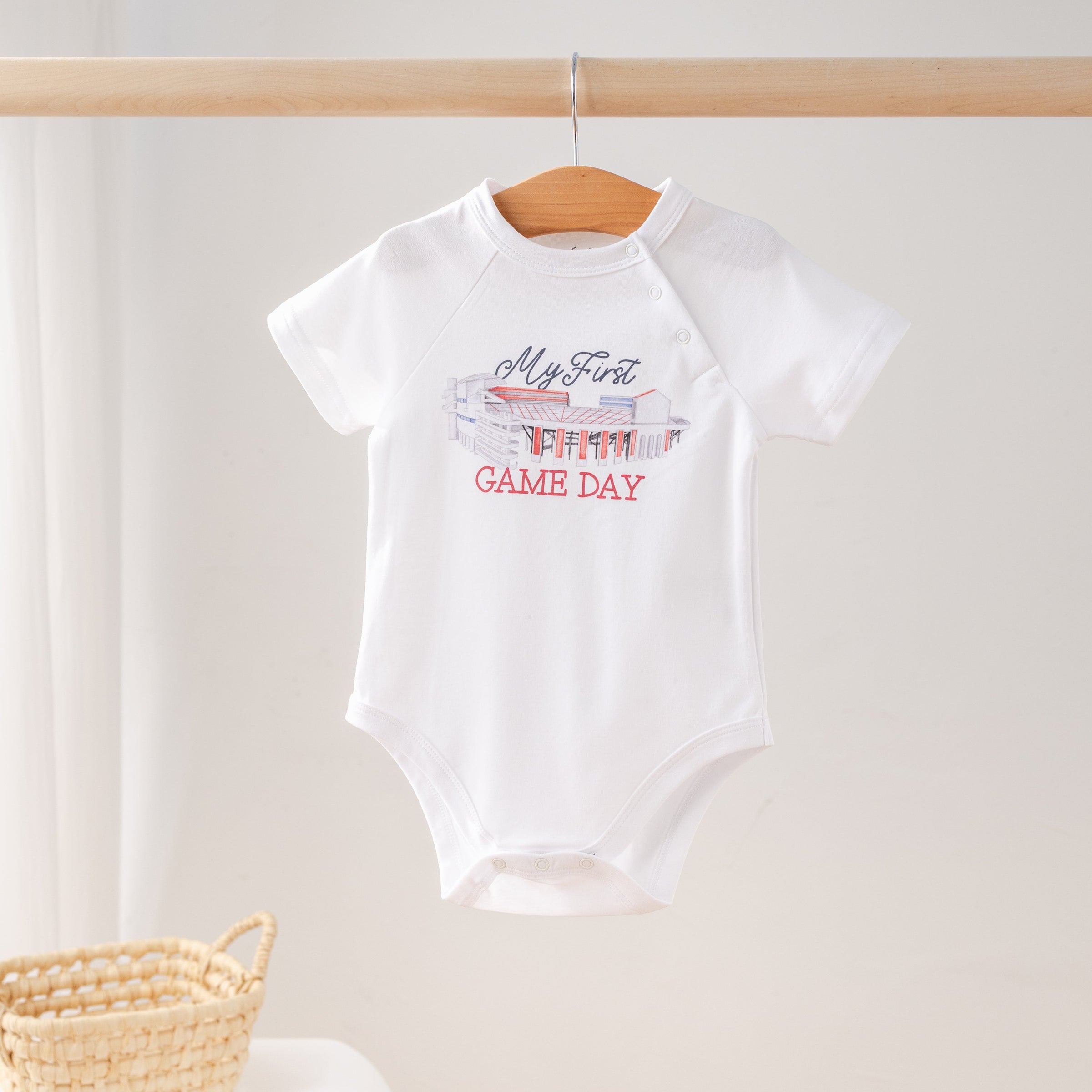 Hotty Toddy in our “My First Game Day” Organic Cotton Baby Onesie! Featuring a charming illustration of Vaught-Hemingway Stadium, this cozy piece is perfect for the tiniest Rebels fans making their debut. Whether it’s tailgating in The Grove, celebrating a touchdown, or enjoying their first “Hotty Toddy” cheer, this soft and breathable onesie brings Ole Miss pride to every moment. From kickoff to the final victory shout, it’s a winning choice for comfort, cuteness, and game day spirit.
