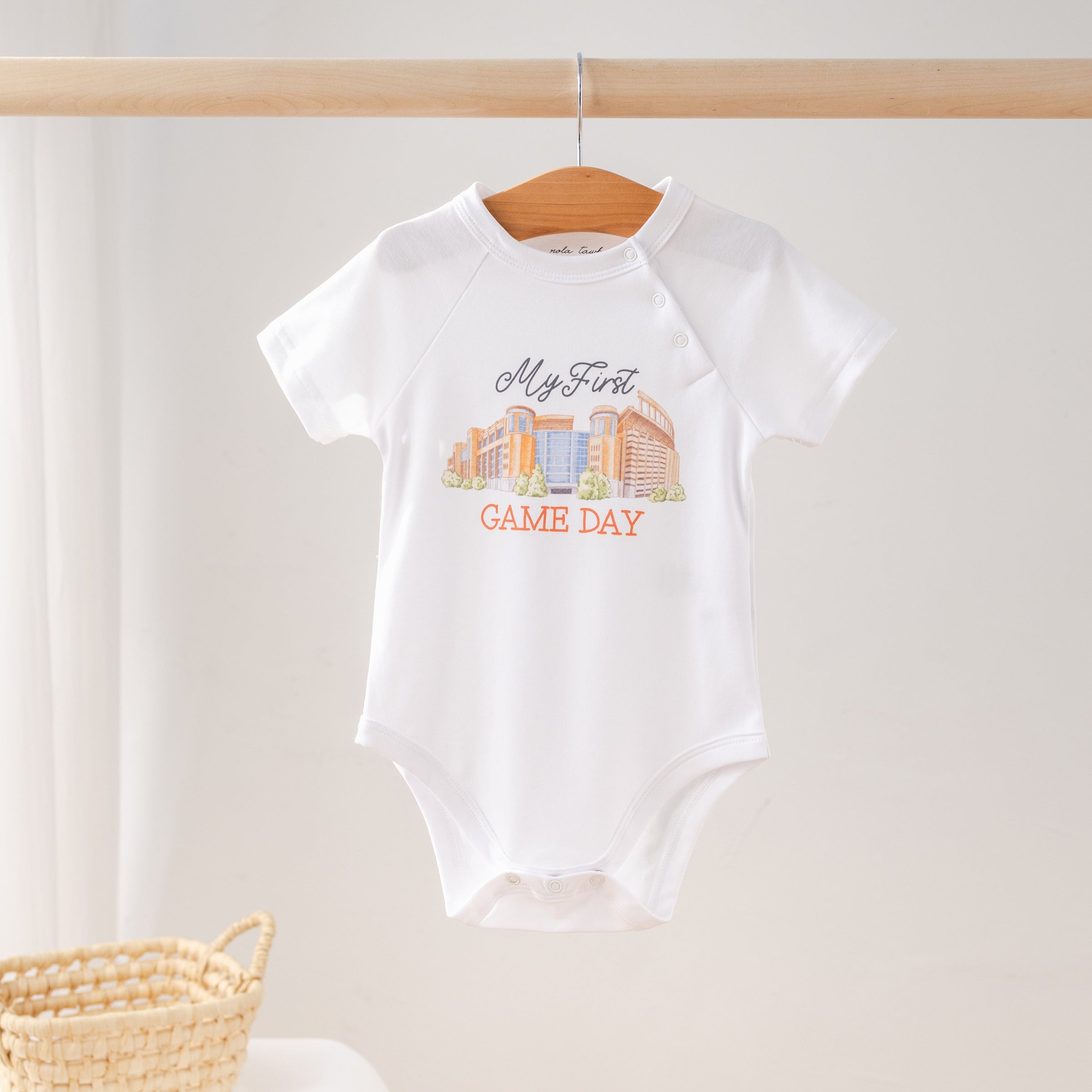 Hook ’Em in our “My First Game Day” Organic Cotton Baby Onesie! Featuring a charming illustration of Darrell K Royal–Texas Memorial Stadium, this cozy piece is perfect for the tiniest Longhorns fans making their debut. Whether it’s tailgating in Austin, cheering for a touchdown, or throwing up their first Hook ’Em Horns, this soft and breathable onesie brings burnt orange pride to every moment. From the opening kickoff to the final victory cheer, it’s a winning choice for comfort, cuteness, and game day spirit.