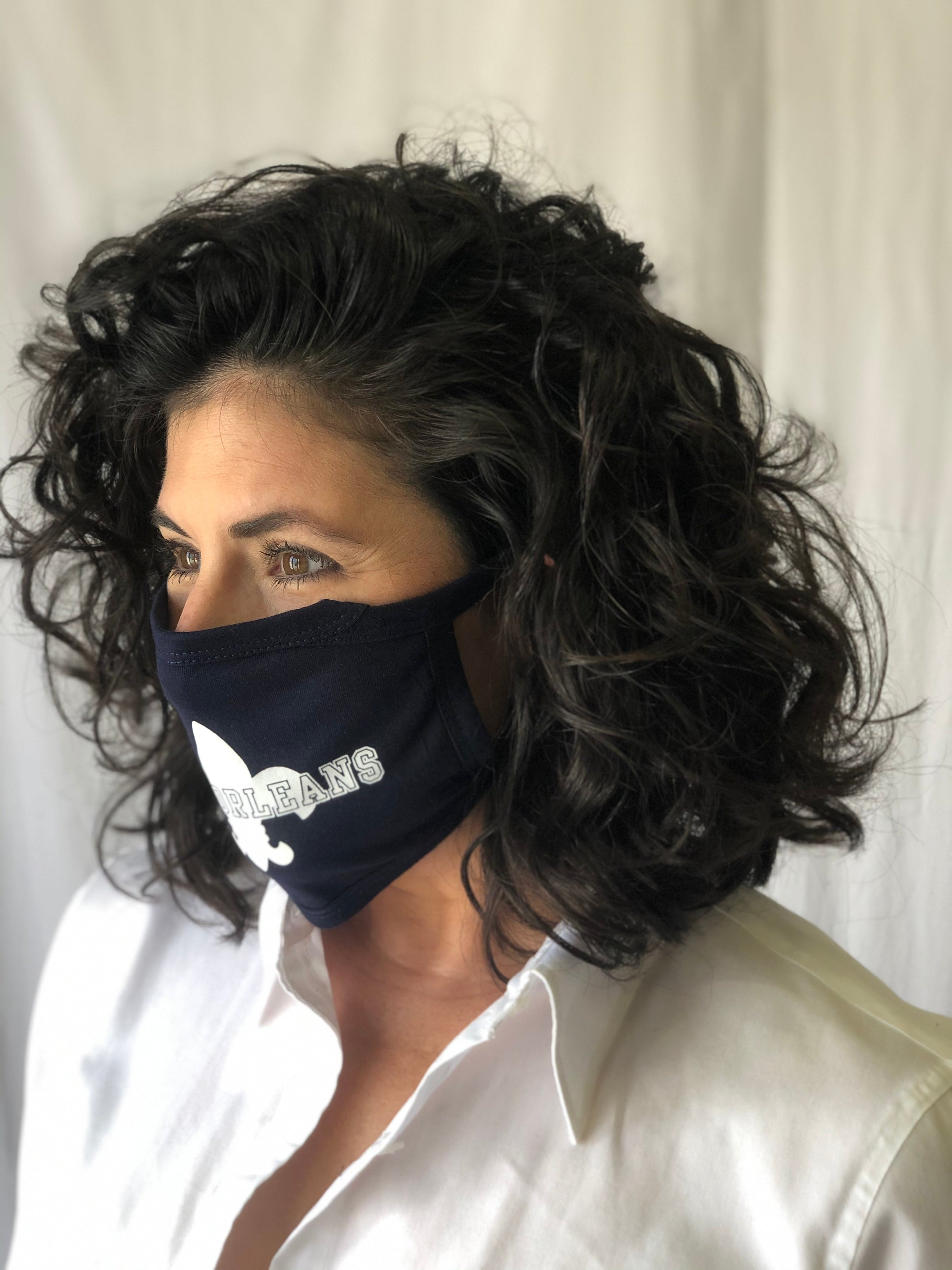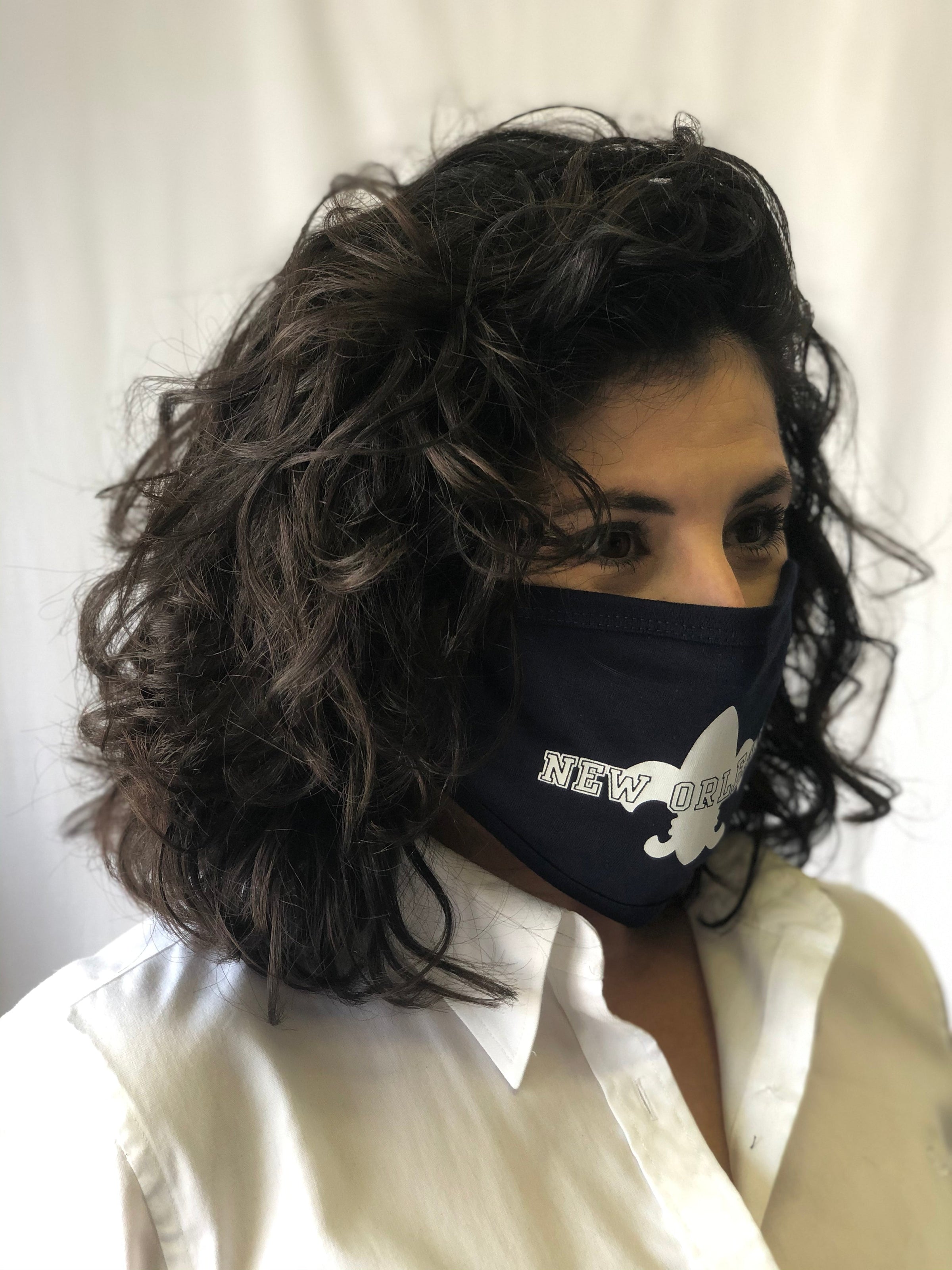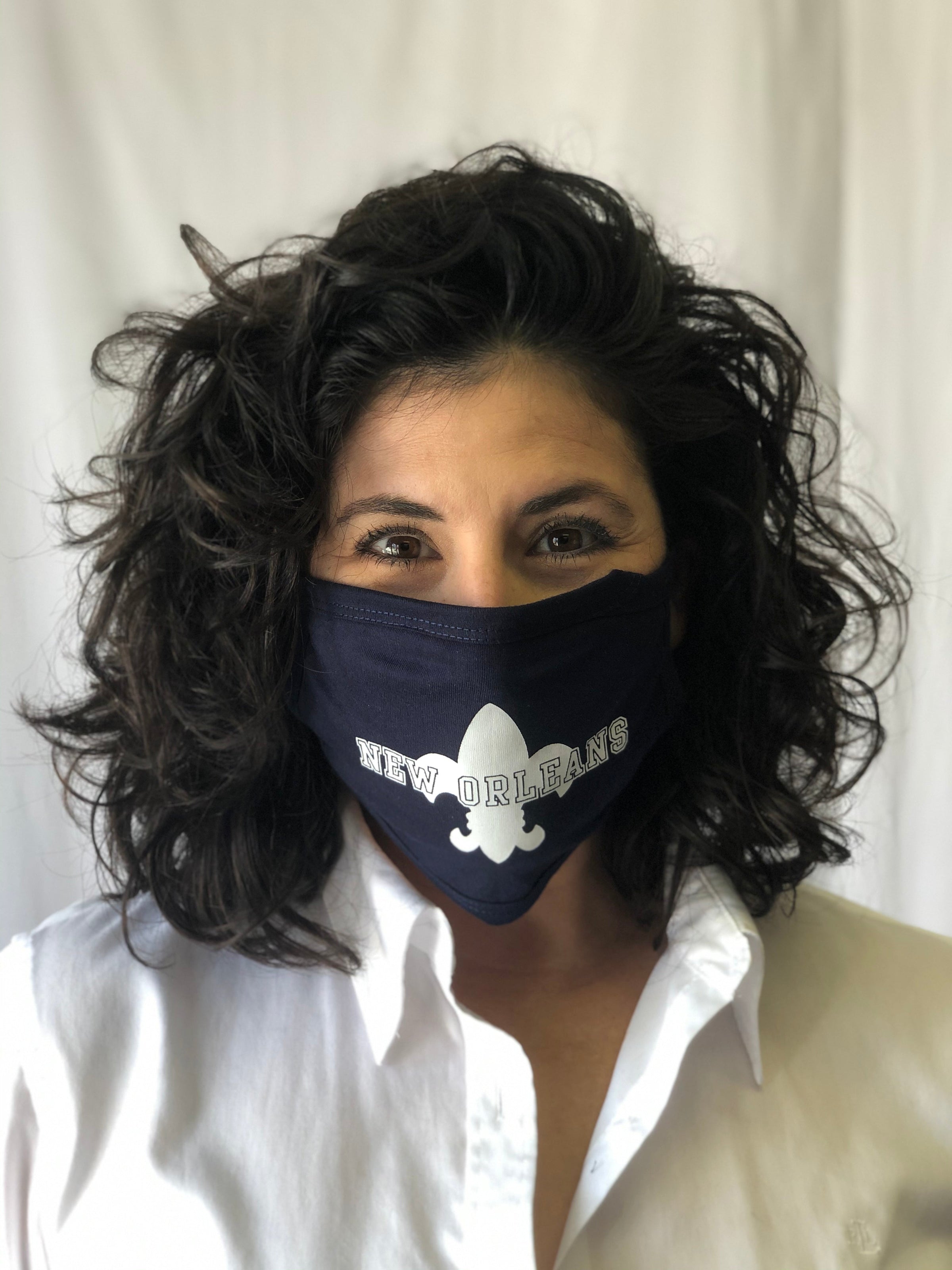 Mask Up in style! This navy reusable face mask features a white fleur de lis in the center and reads "New Orleans". One size fits most.