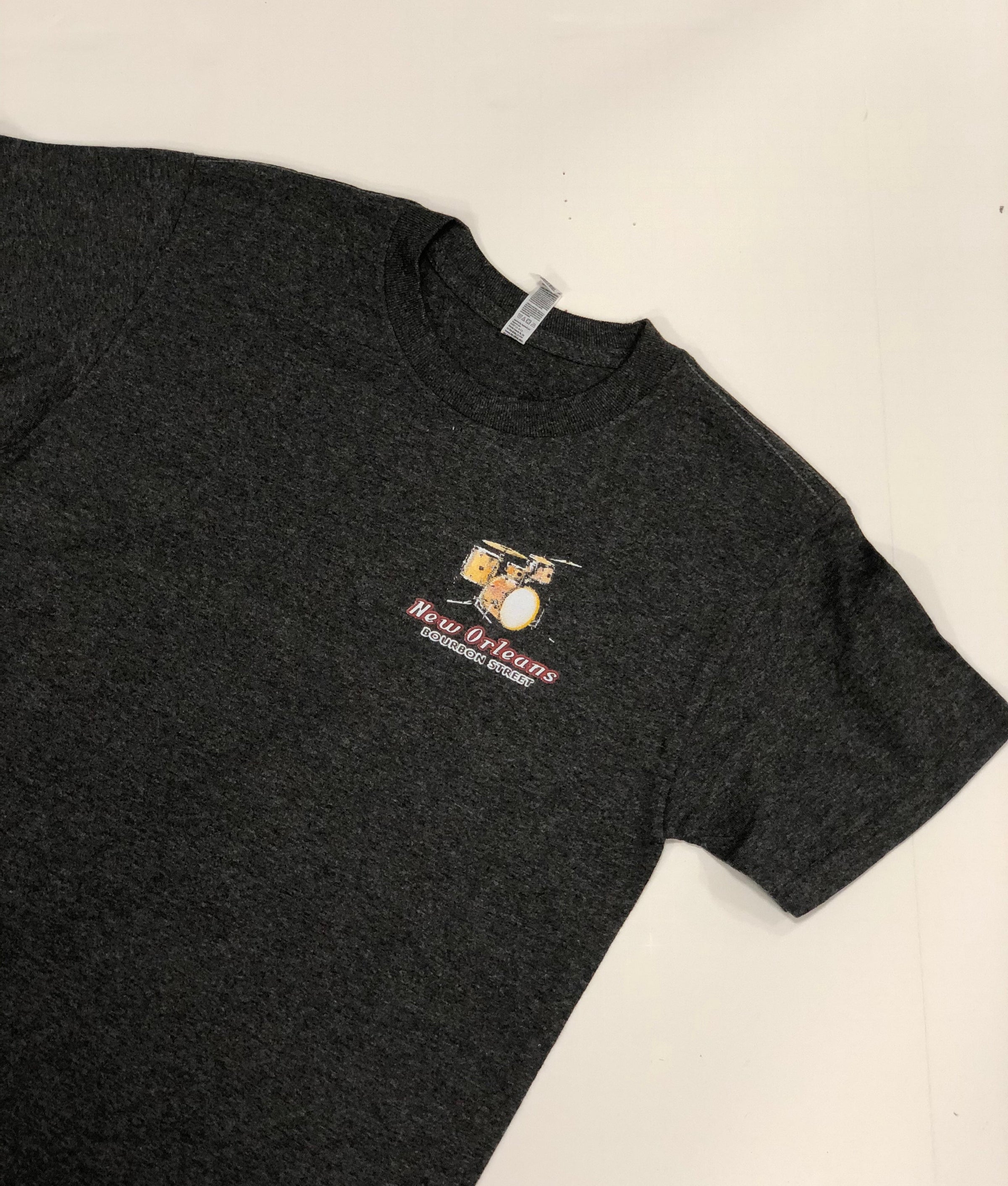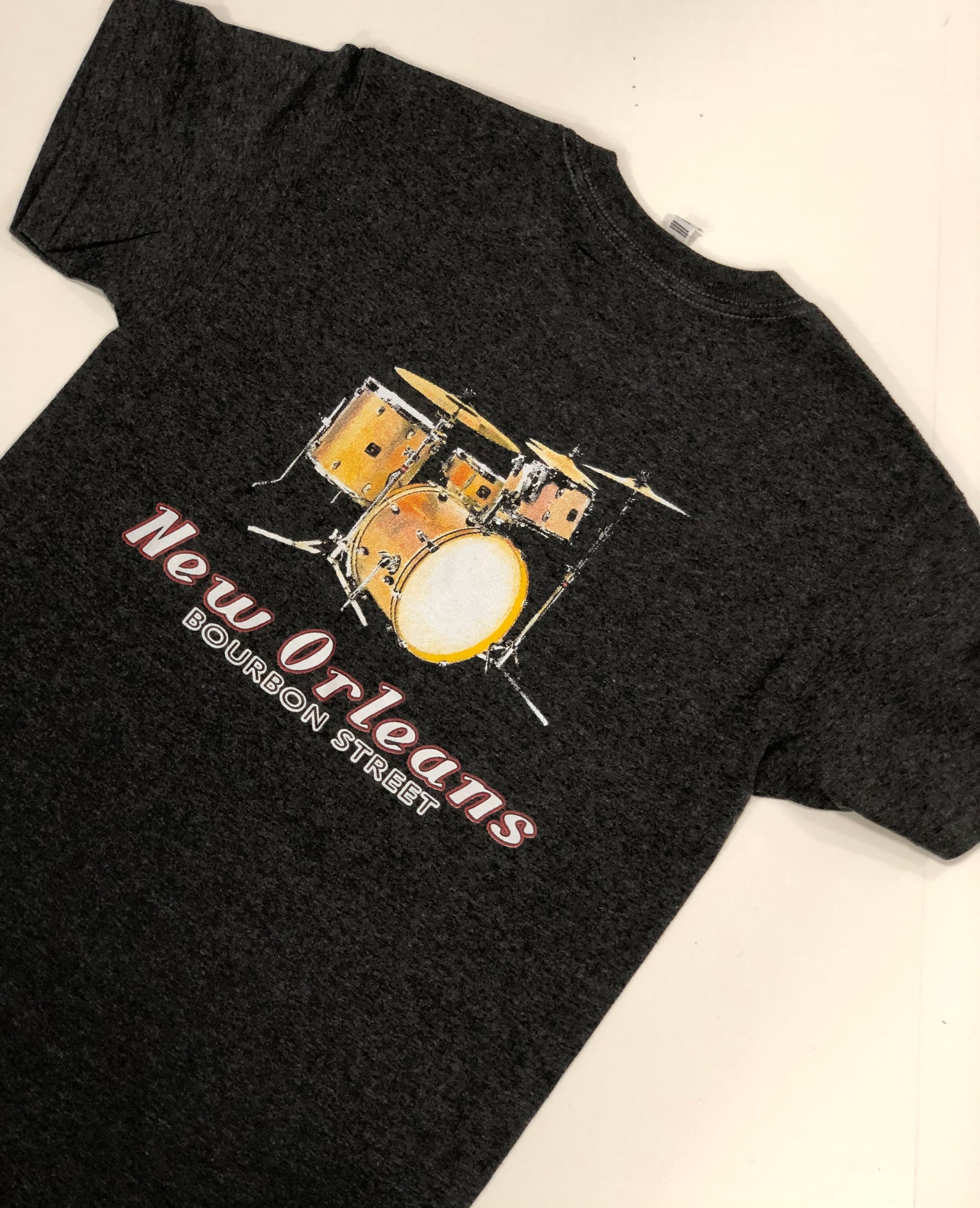New Orleans is a city of music! This T-shirt features a drum set with "New Orleans Bourbon Street" under it.