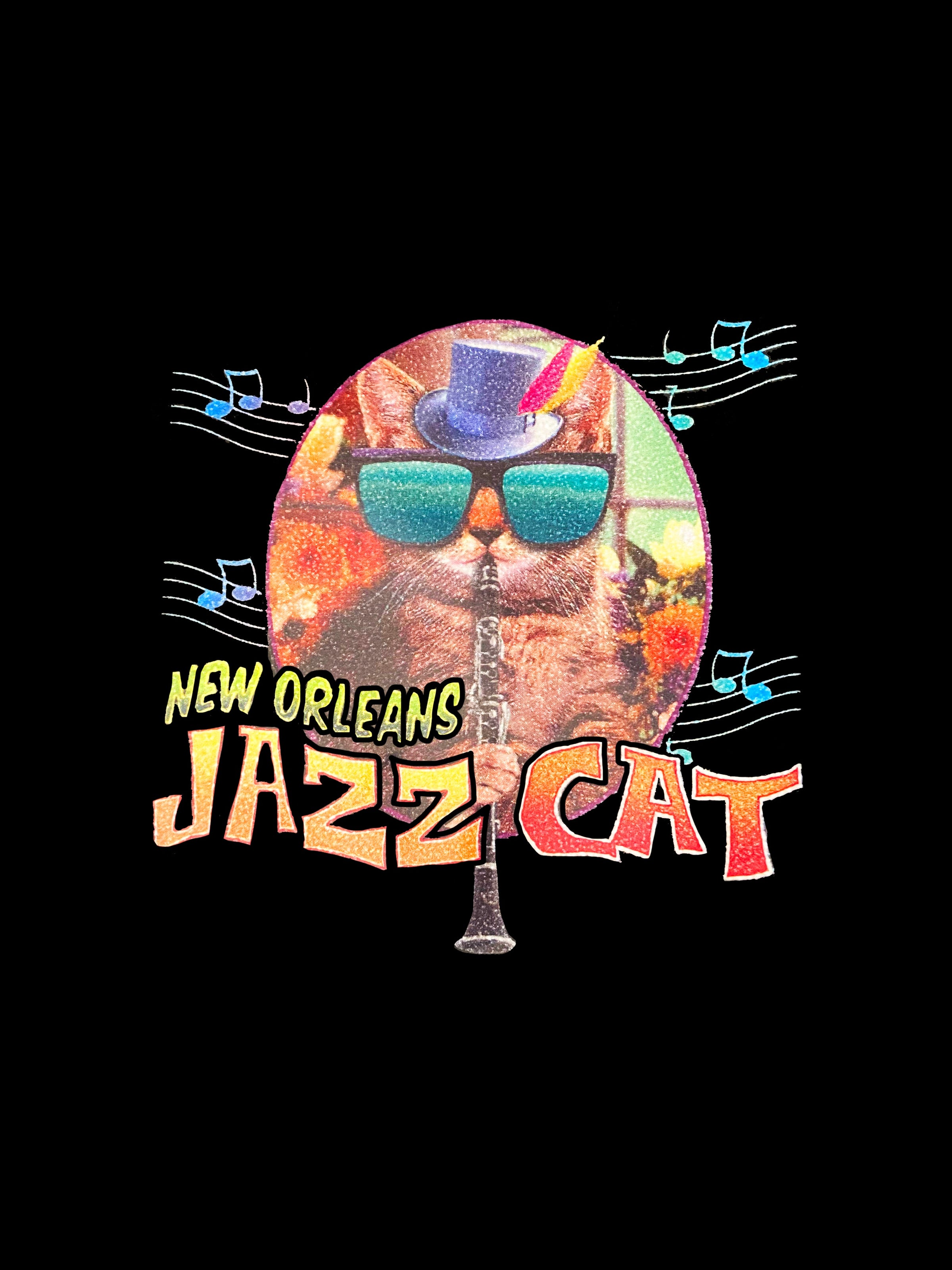 Get groovy with our New Orleans Jazz Cat T-Shirt! This cool cat, sporting shades and playing a clarinet, adds a playful touch to any outfit. Show off your love for music and felines with this quirky shirt.