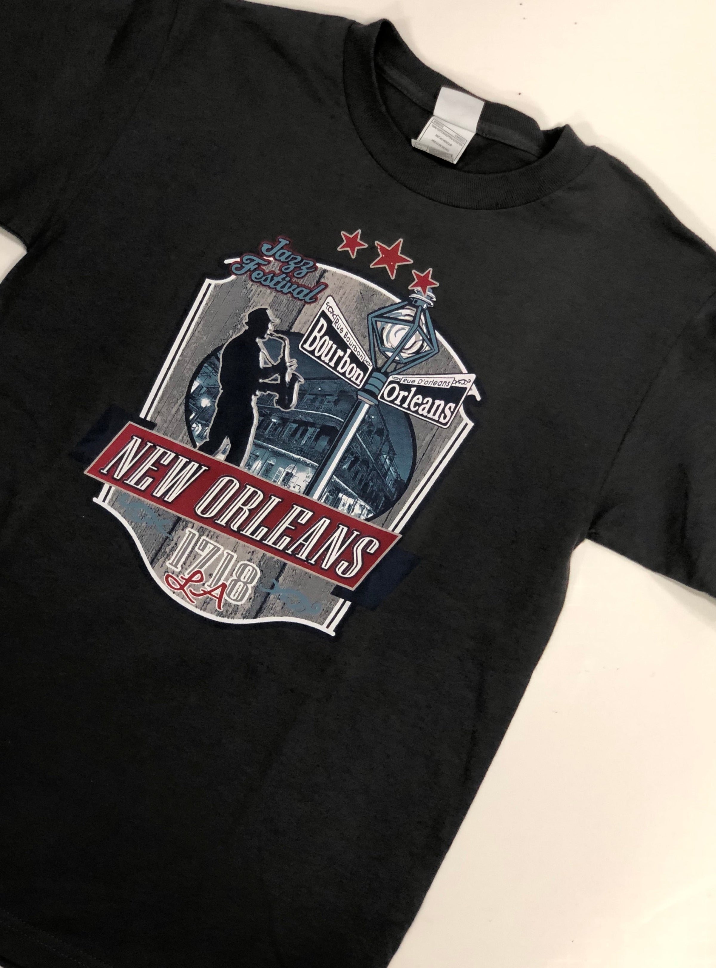 New Orleans is a city of music! This T-shirt features a man playing the saxophone next to a French Quarter streetlamp. T-Shirt reads "Jazz Festival, New Orleans".