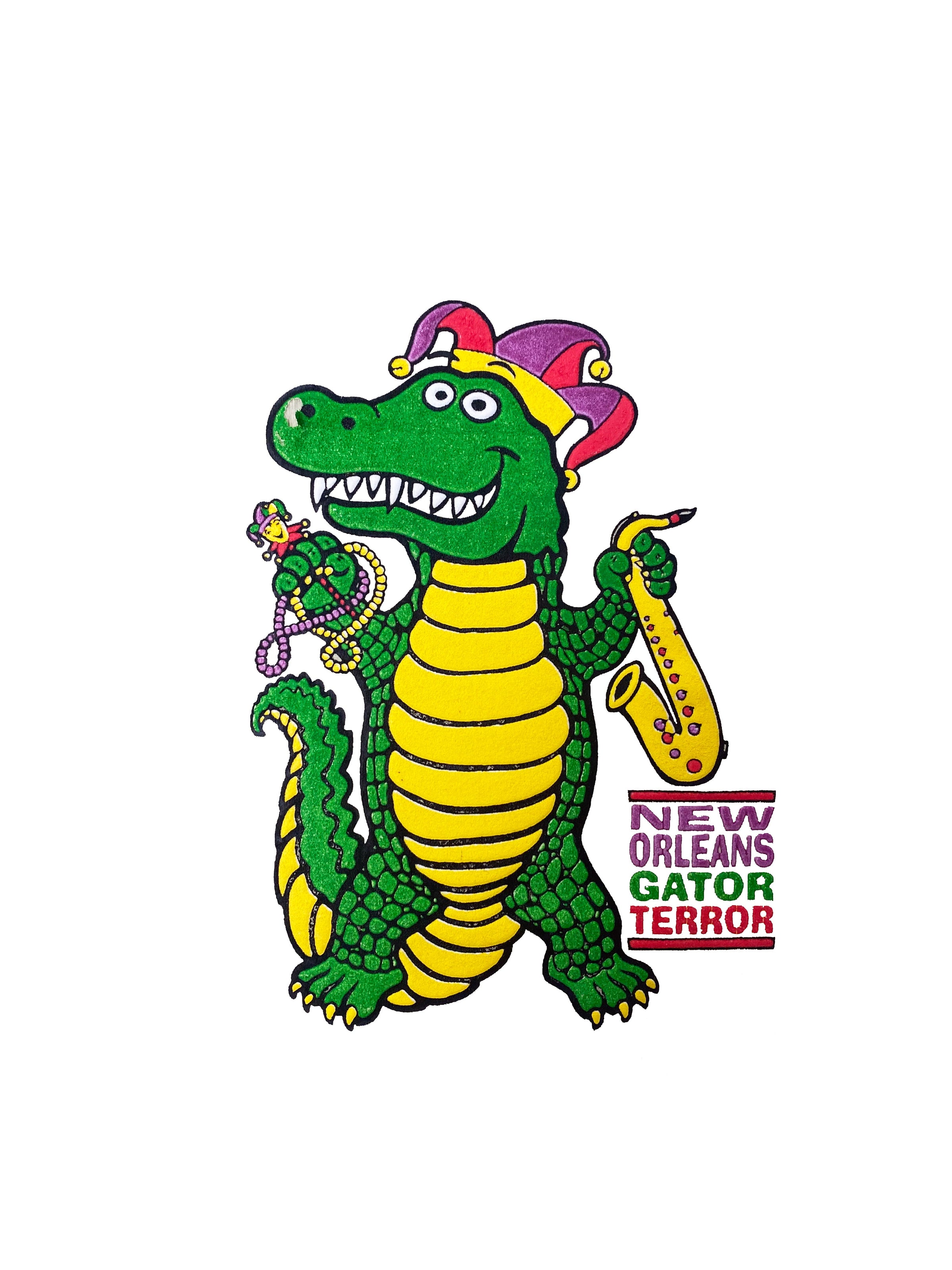 Get ready to party with the New Orleans Mardi Gras Gator Terror Kid's T-Shirt! This funky shirt features a jazzy alligator wearing a jester hat and carrying a saxophone. Show off your quirky style and let the good times roll with this unique design!