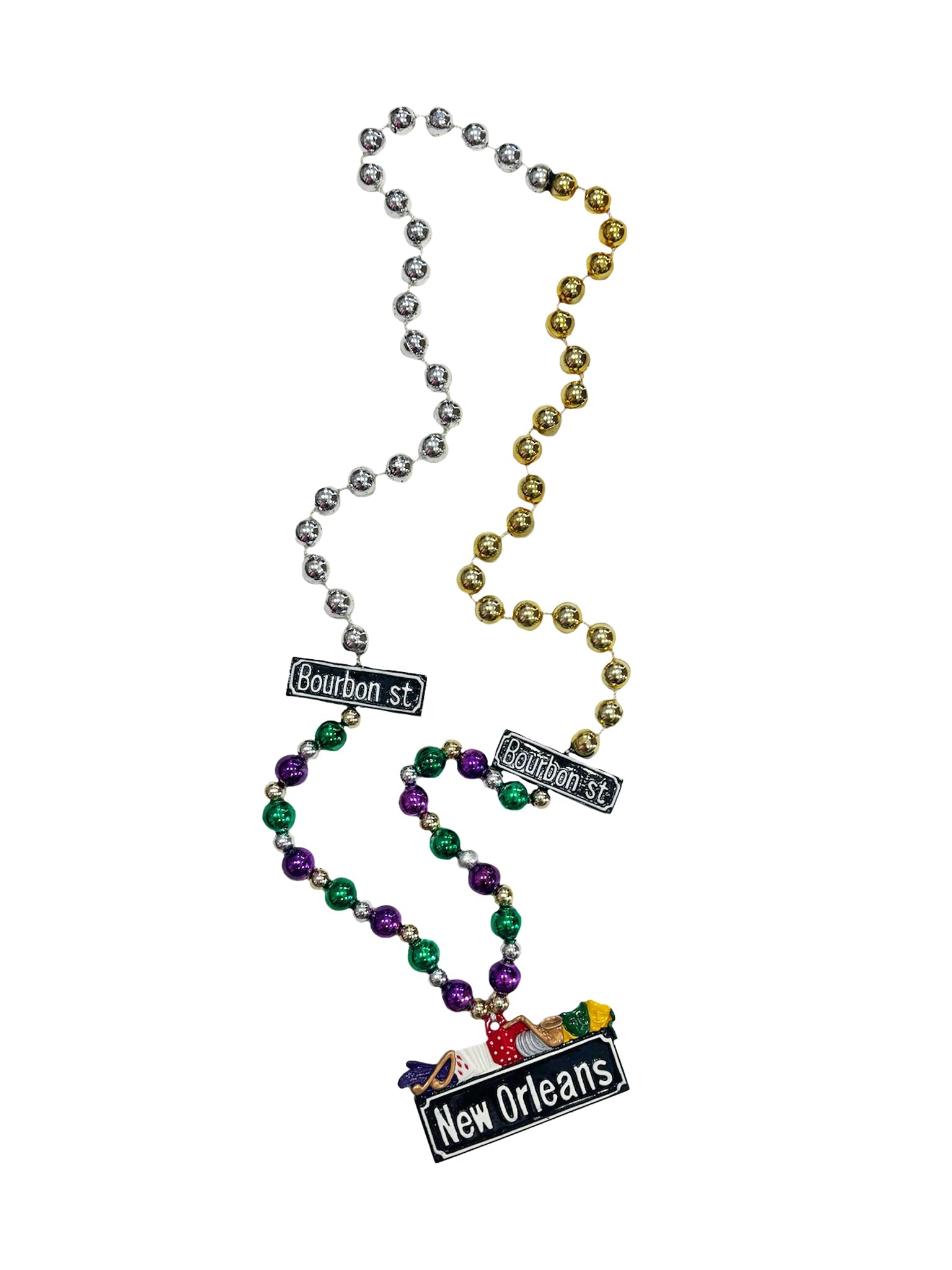 Party in New Orleans with this street sign styled bead featuring a casino theme. The 3 1/2" wide x 1 1/2" high New Orleans sign is topped with gold musical notes and saxophone. It also has dice, cards and poker chips with the green and gold comedy/tragedy masks on the end. The two smaller bourbon street signs are evenly distributed along the bottom of the hand strung purple, green and gold 12mm beaded 42" long necklace.