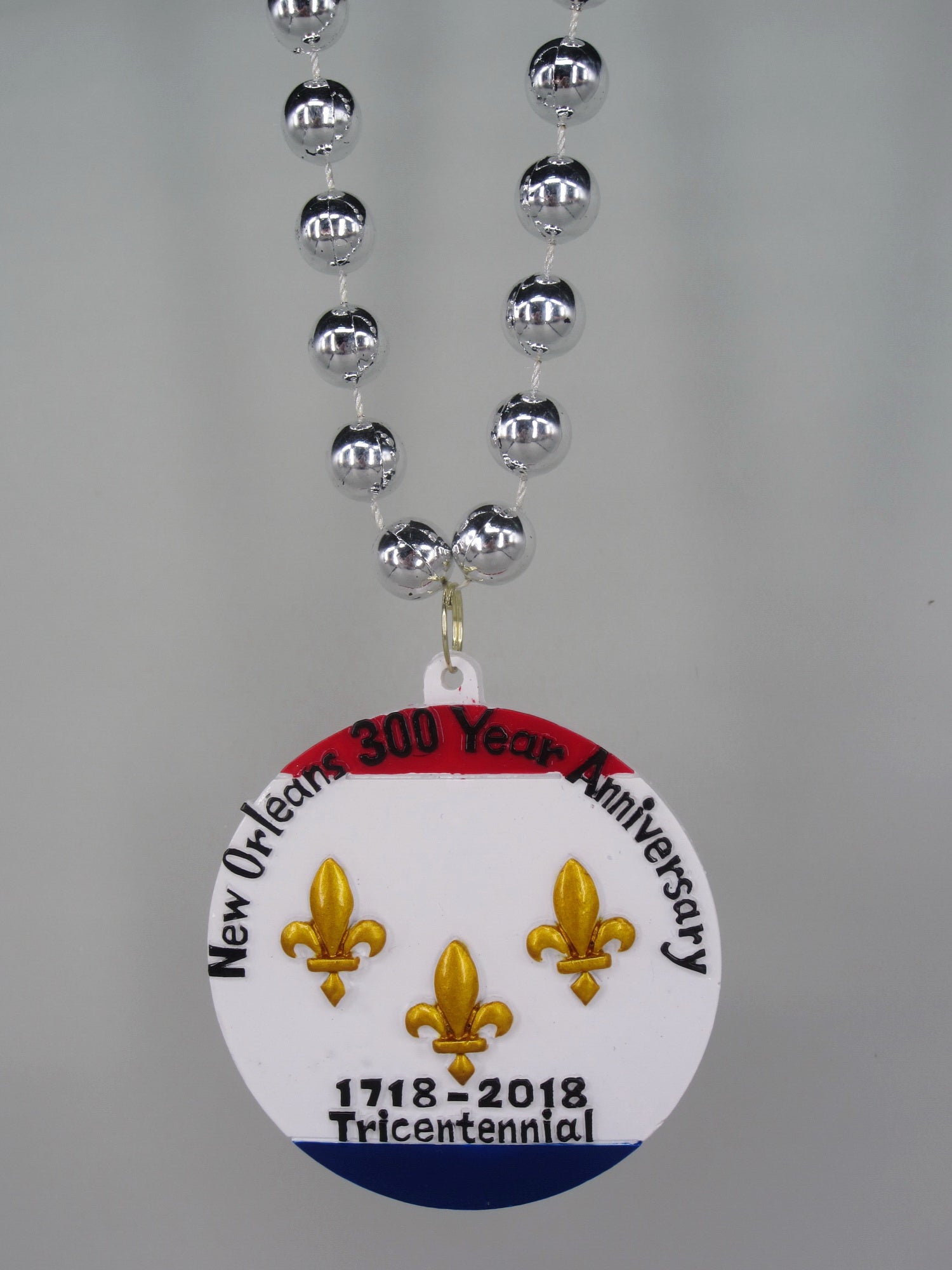 This traditional 2 1/2" diameter medallion is made to commemorate Louisiana's 300 year anniversary. The red, white and blue medallion states New Olreans 300 Year Anniversary, 1718 - 2018 Tricentennial. The medallion sits on a 12 mm silver beaded 42" long necklace.