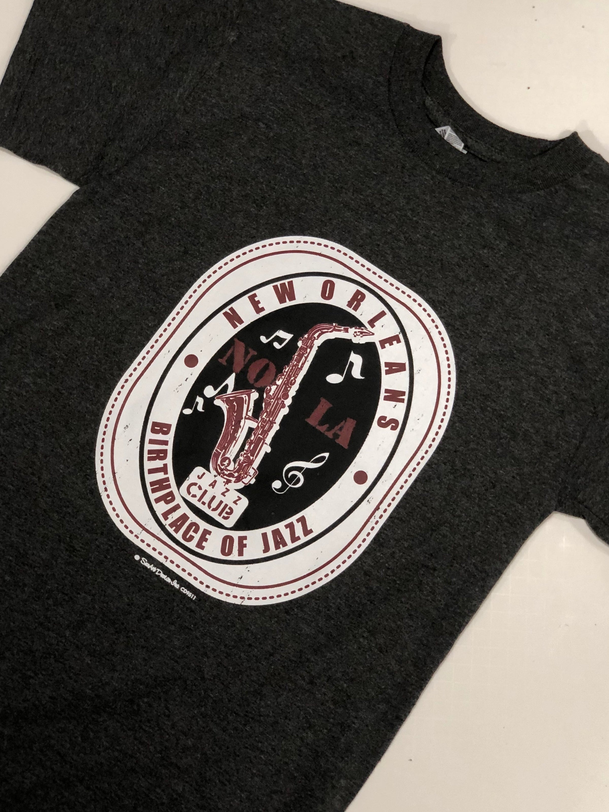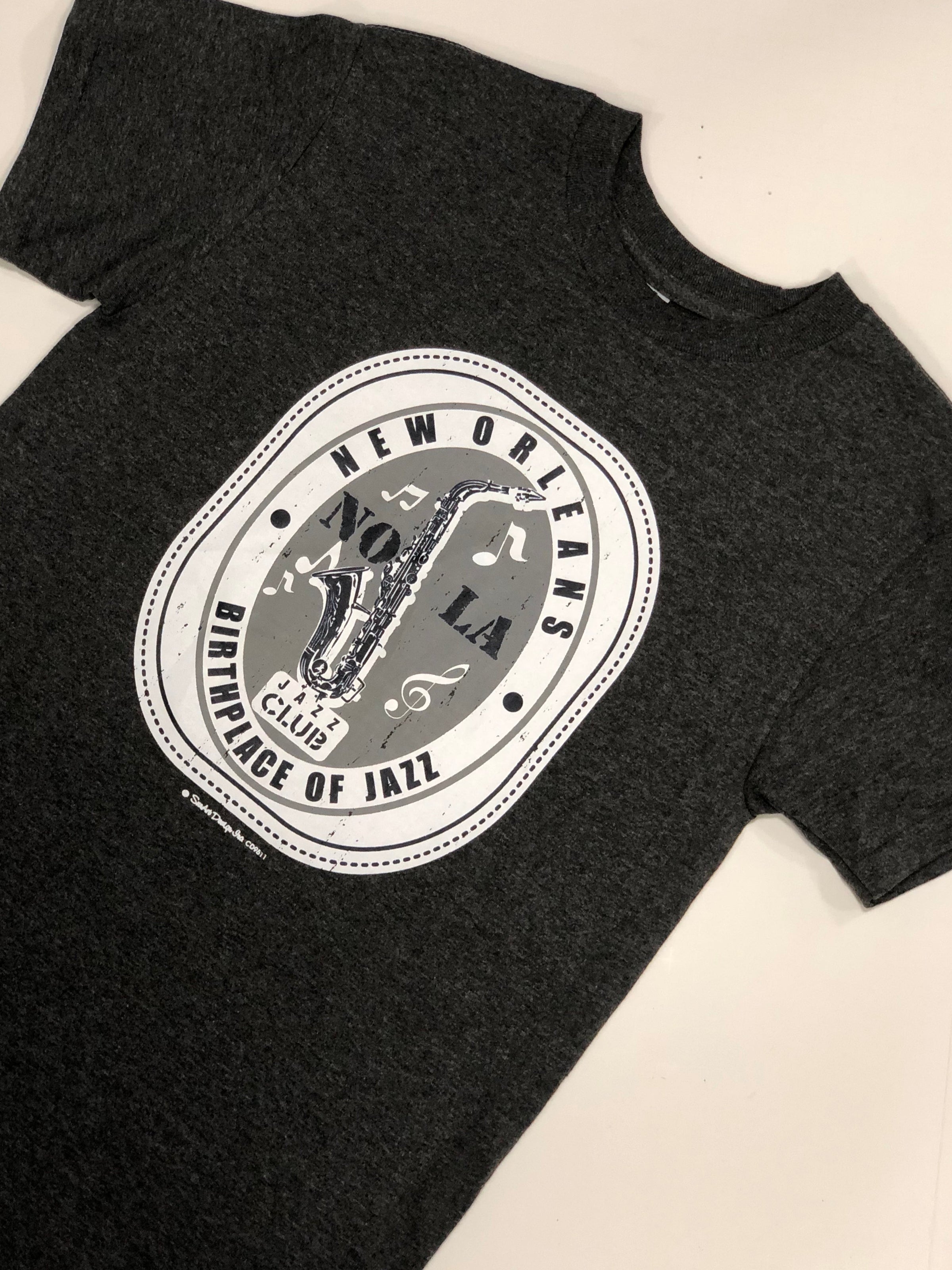 New Orleans is a city of music! This T-shirt features a saxophone and reads "New Orleans NOLA Birthplace of Jazz"