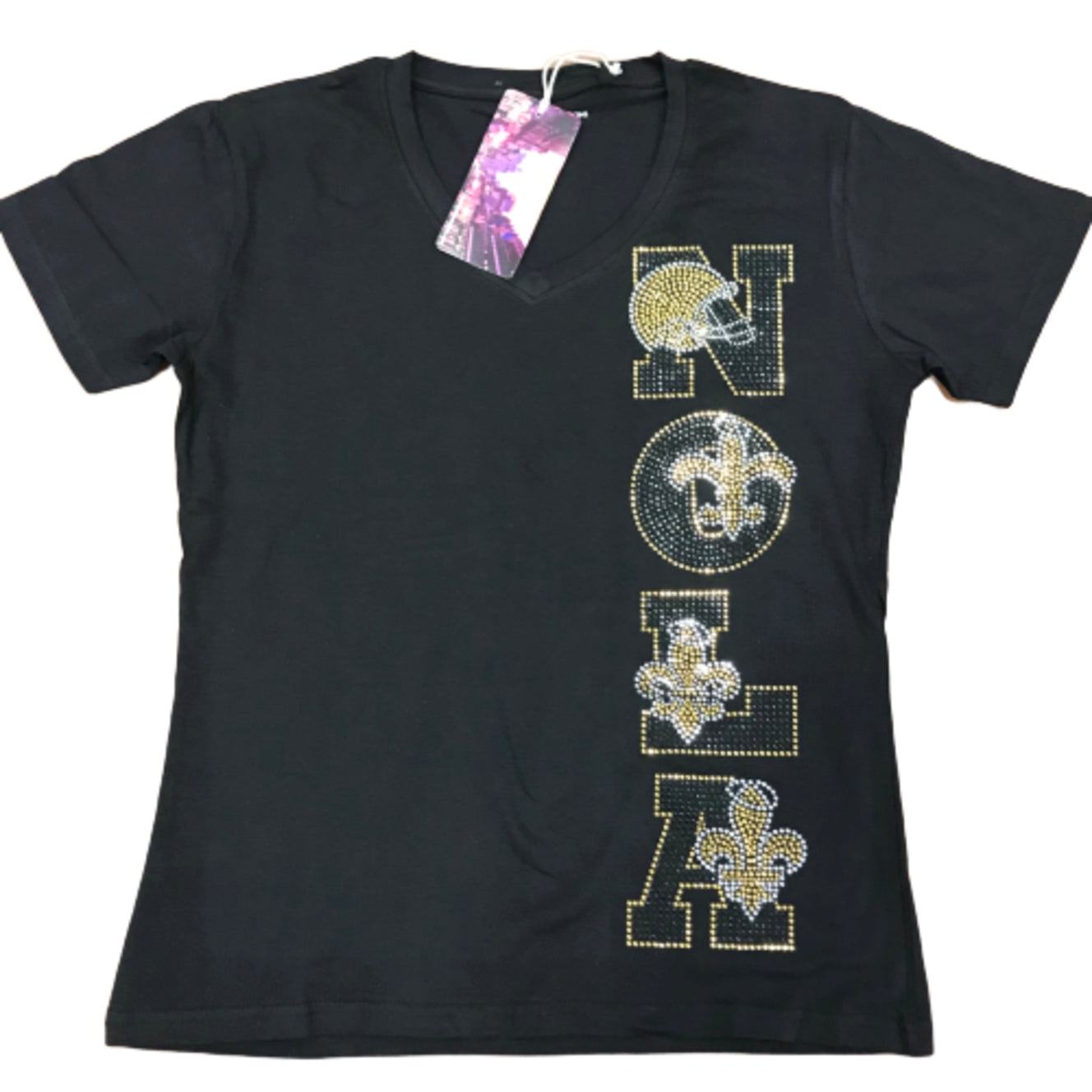 Show your team spirit in this NOLA rhinestone v-neck short sleeve t-shirt for all Saints games! This shirt is super cute and comfortable!