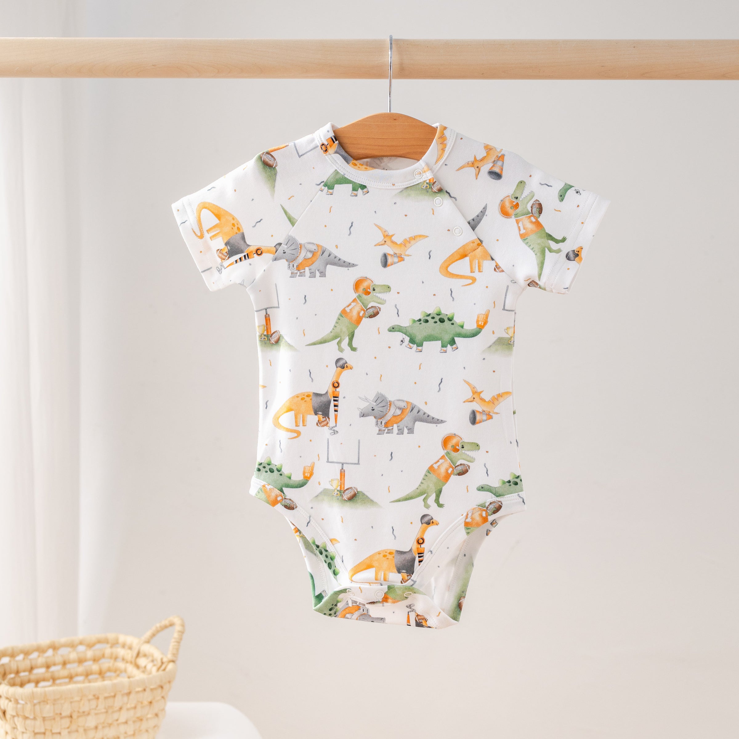 Suit up your smallest fan with our Game Day Dinos Organic Cotton Onesie! Bursting with playful orange dinosaurs ready to hit the field—helmets on, tails out, and team spirit high—this cozy one-piece is perfect for cheering on any orange-loving team. From pre-game cuddles to post-game naps, the ultra-soft, breathable fabric keeps your little MVP comfy all day. Easy snap closures make changes quick, so you can get back to celebrating every roaring touchdown.