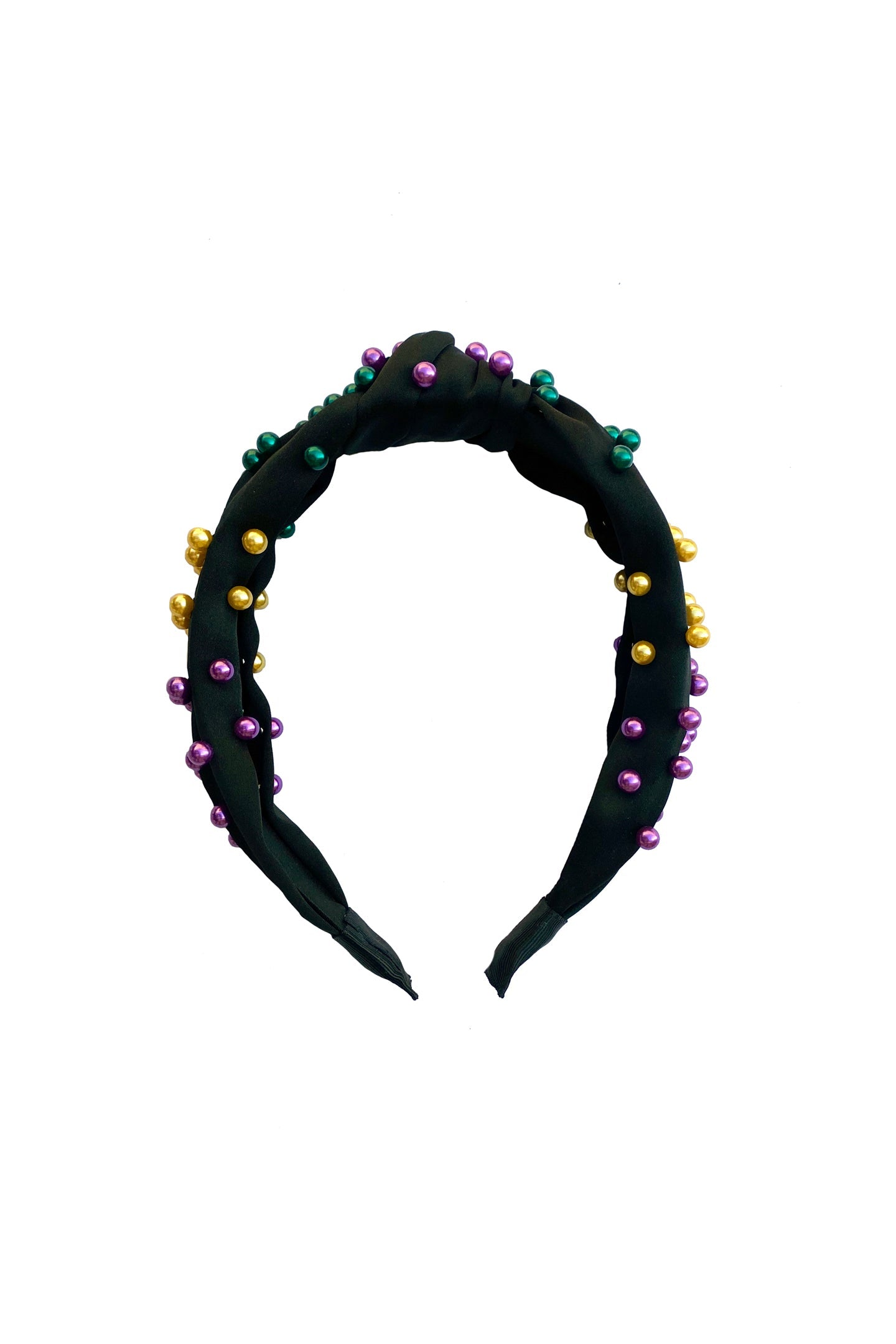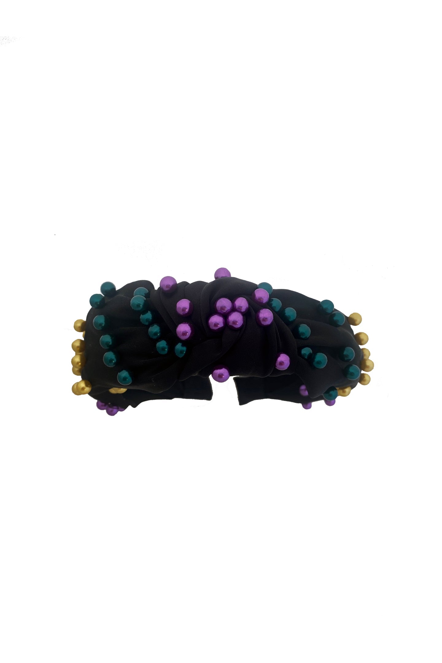 Turn heads this Mardi Gras season! There is no cuter or more fun accessory than this black headband with purple, green and gold pearls!
