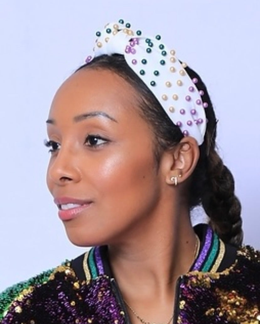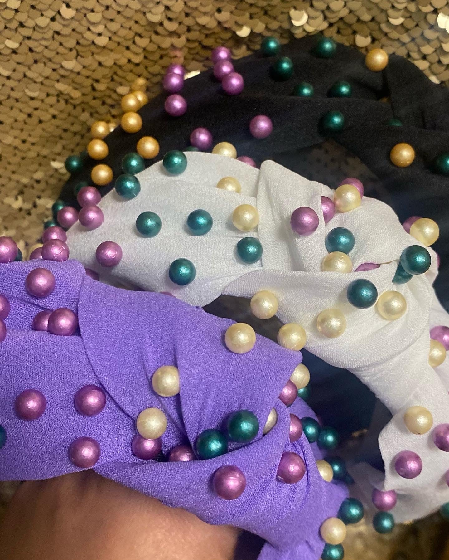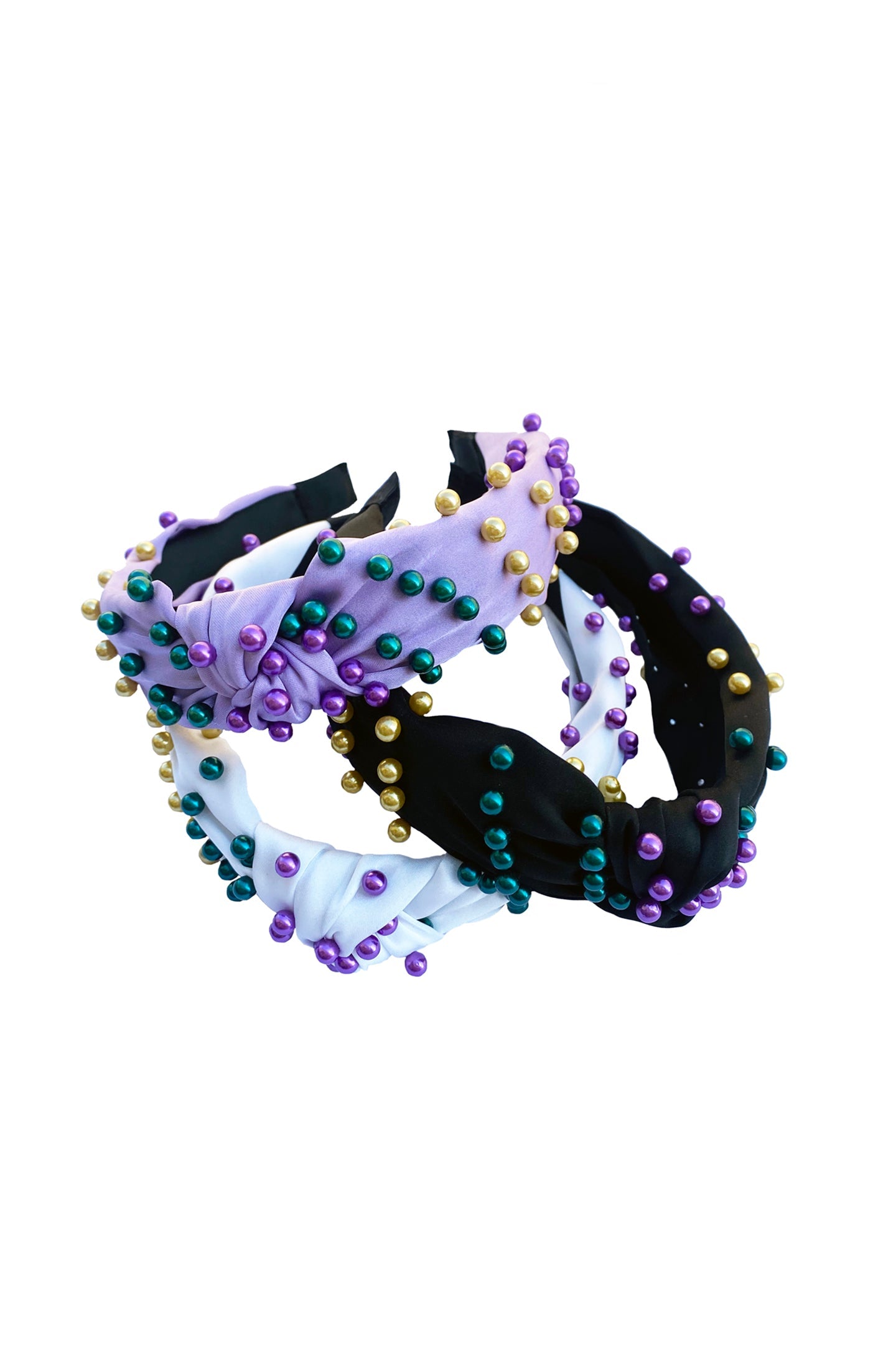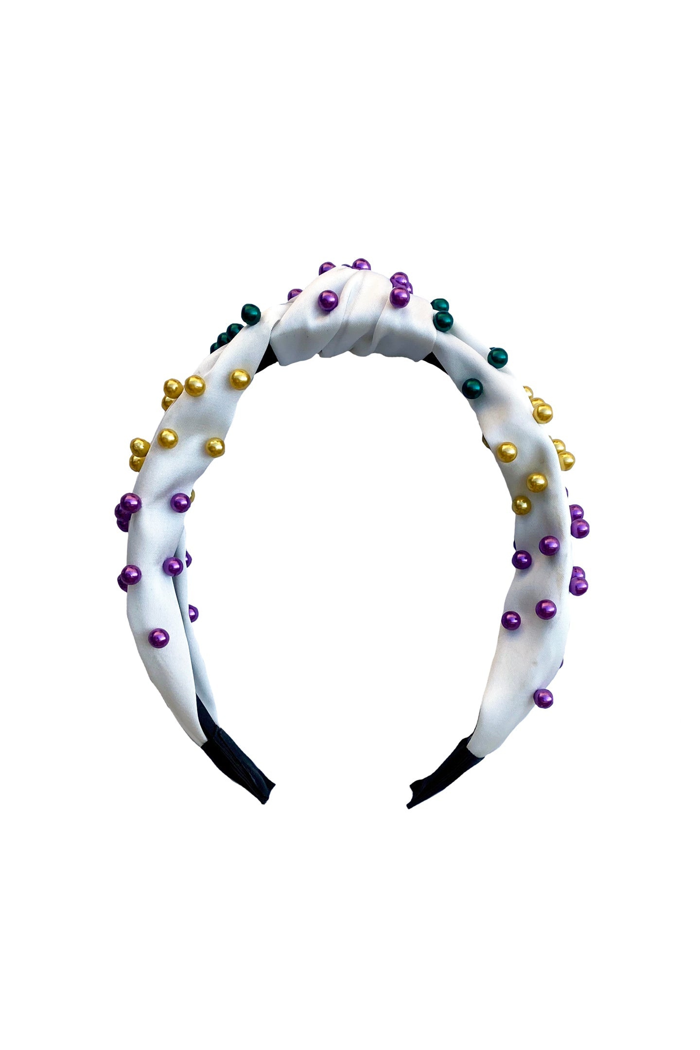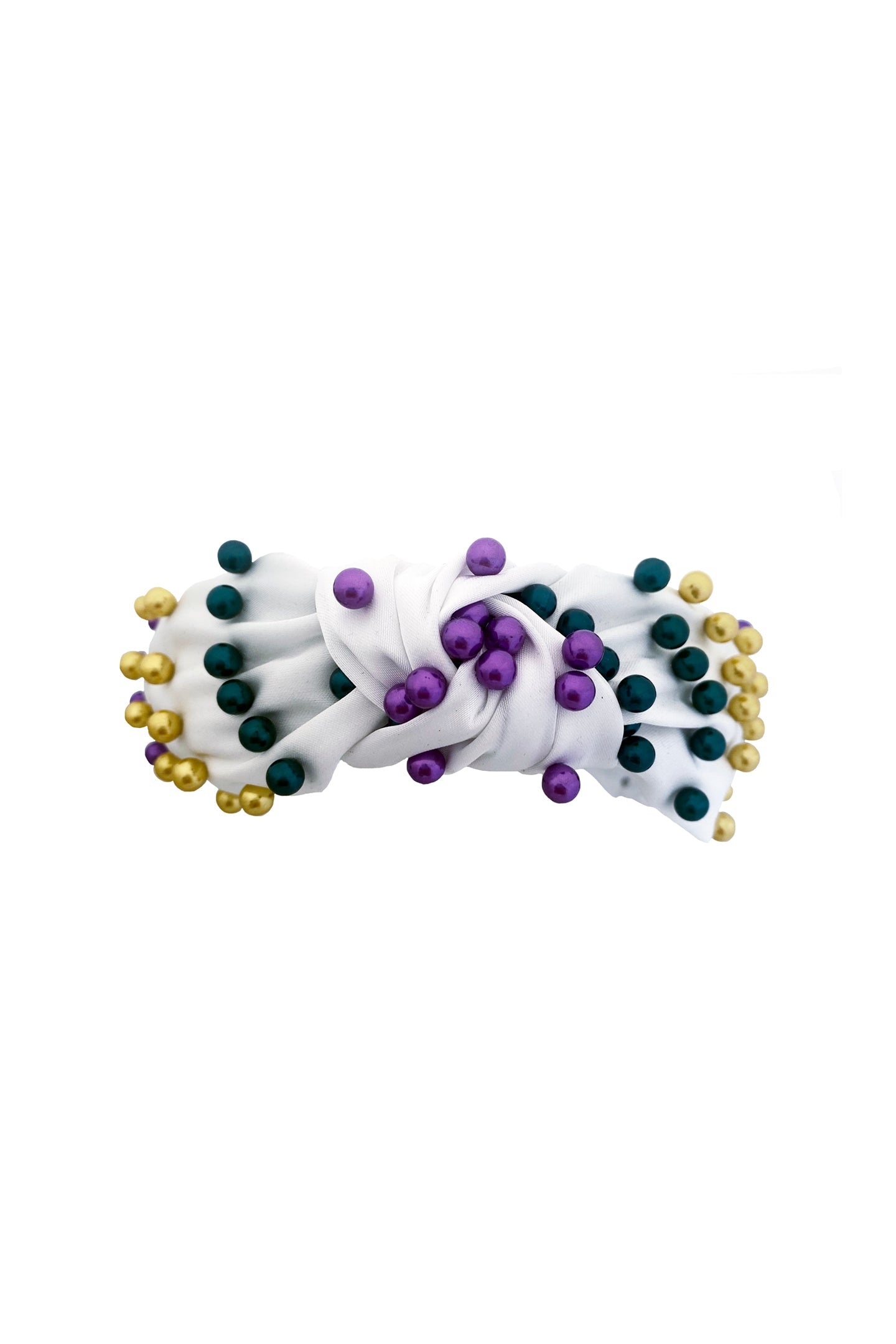 Turn heads this Mardi Gras season! There is no cuter or more fun accessory than this white headband with purple, green and gold pearls!
