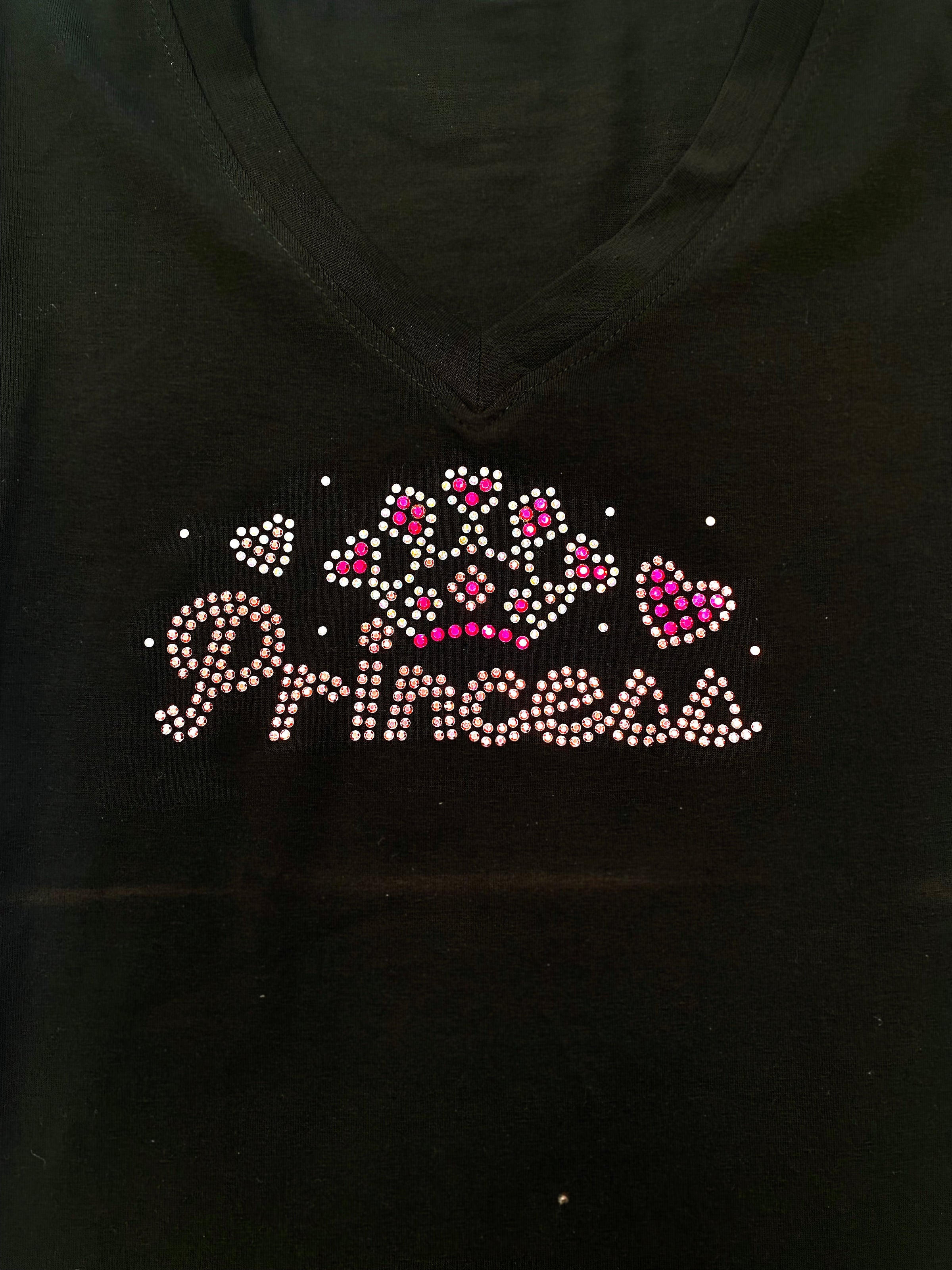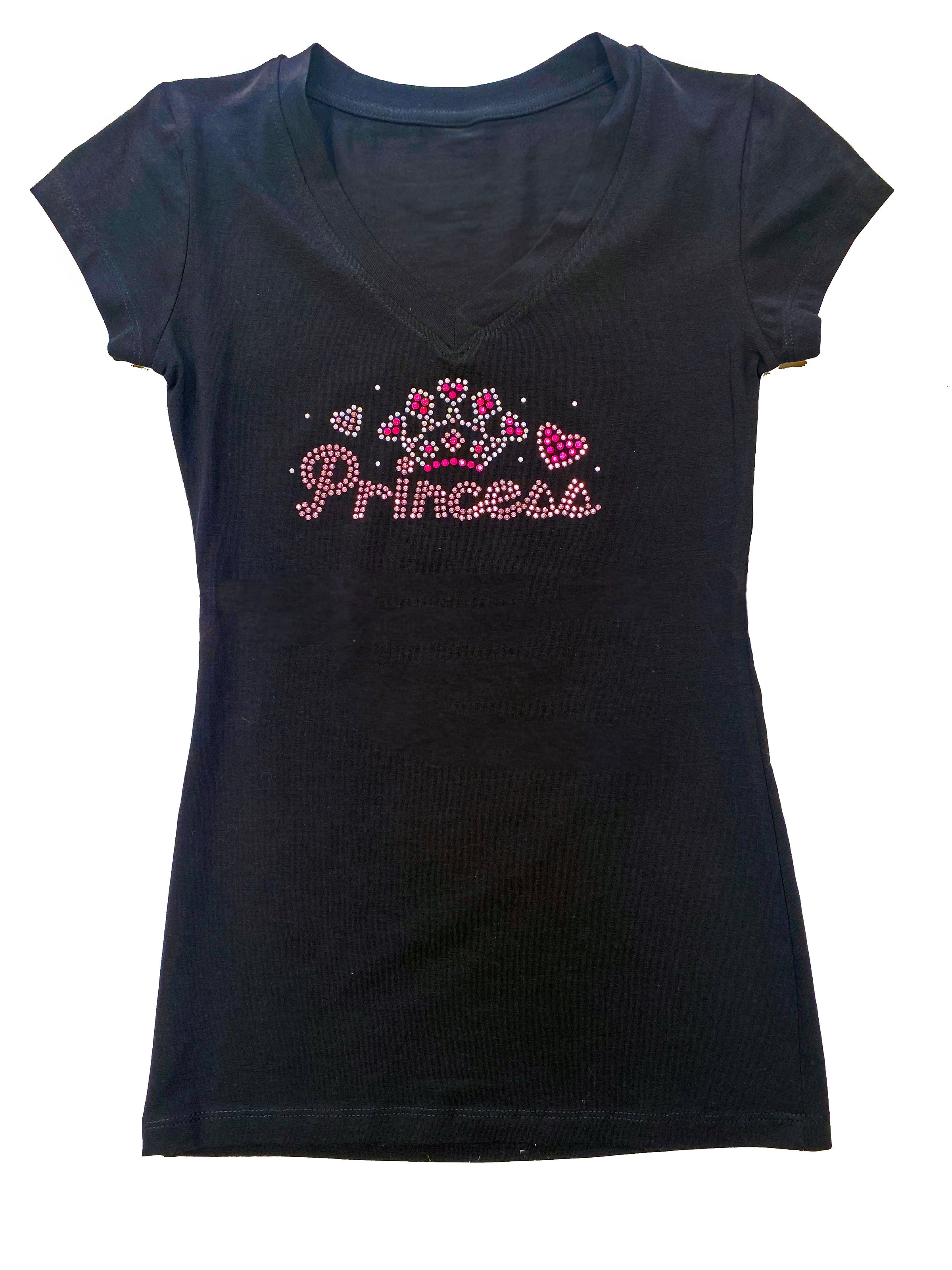 Be the princess in style with this Youth T-Shirt featuring a dazzling rhinestone crown and the word "princess" in pink. Reign over your kingdom with confidence and sparkle!