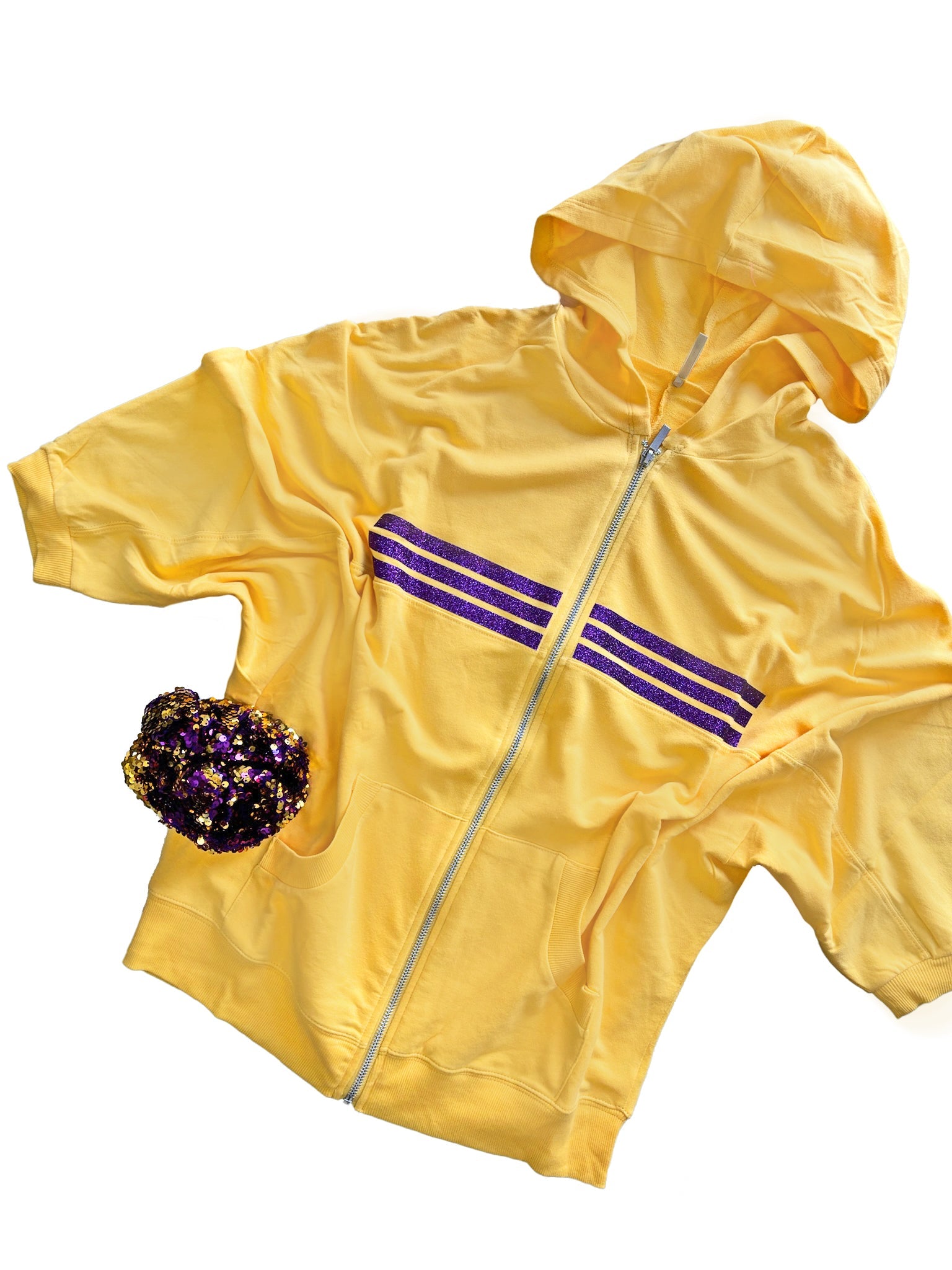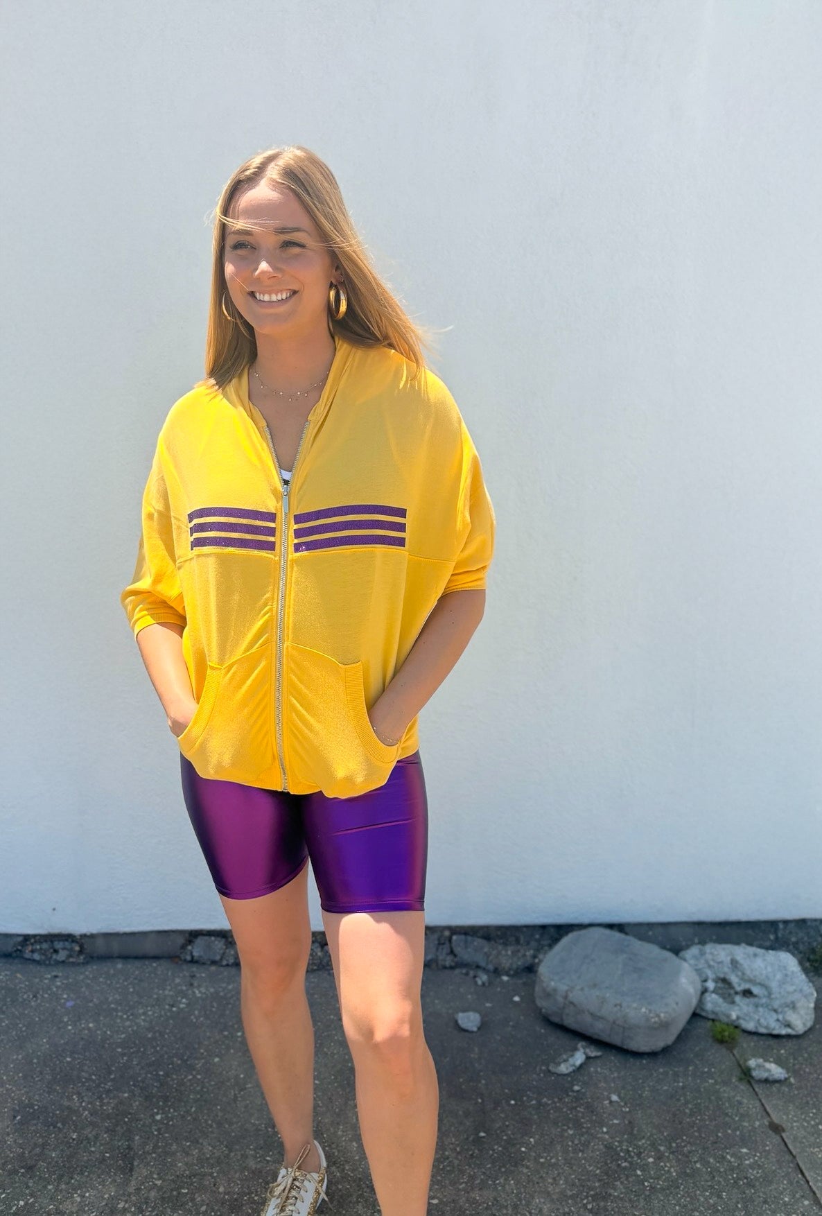 Get ready to cheer on your team with this playful Purple & Gold Glitter Stripe 3/4 Sleeve Zip Up Hoodie! Perfect for game day and showing your support for your favorite team, Geaux Tigers! (Go ahead, add a little sparkle to your spirit!)